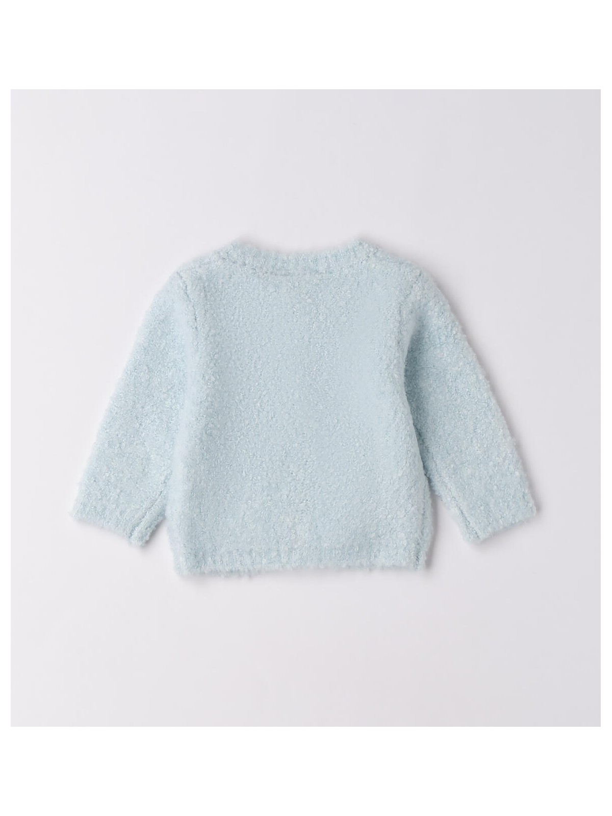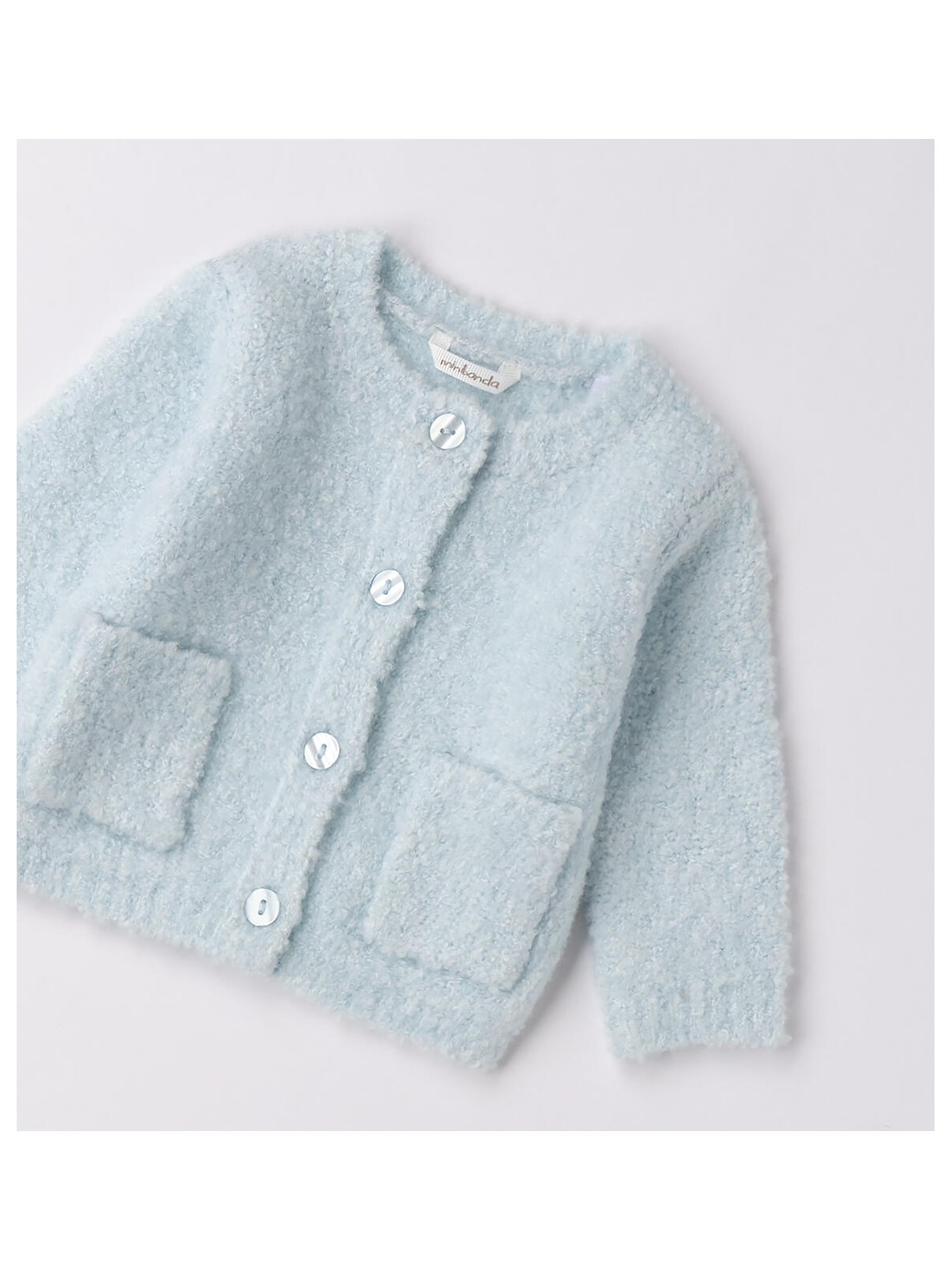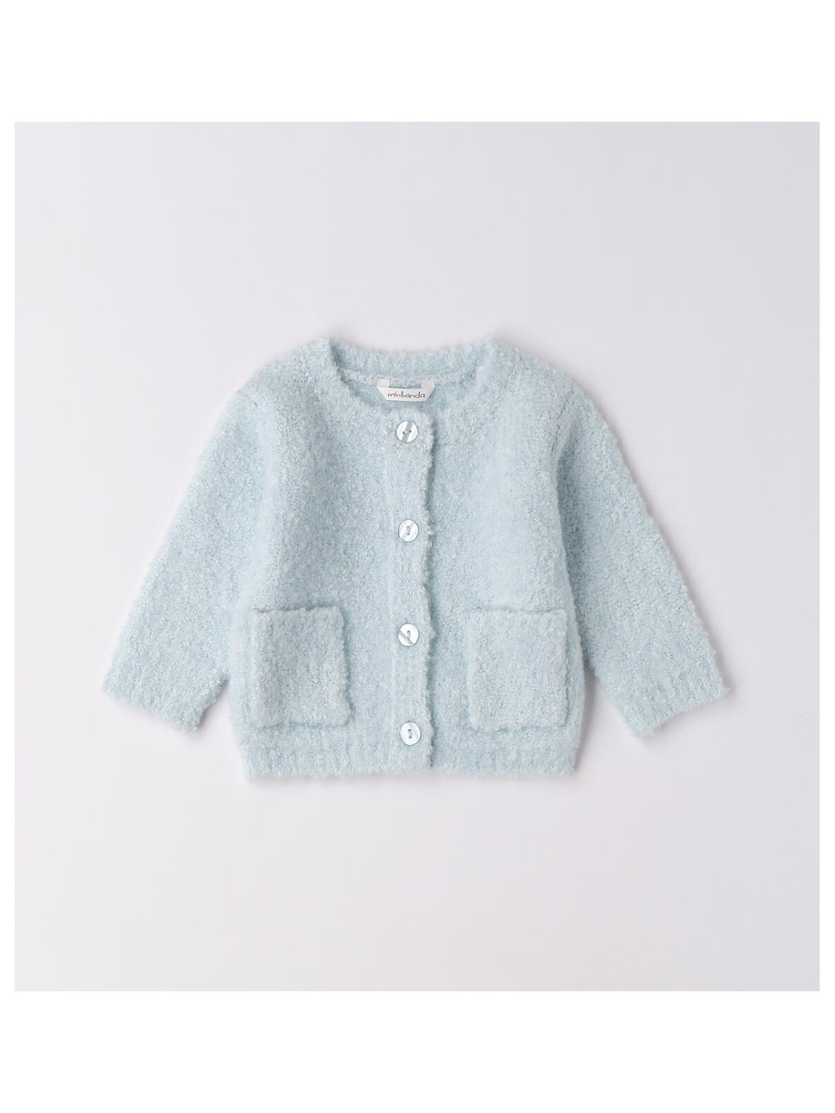 Cardigan per bimba neonata Minibanda realizzato in tricot bouclé. Taschine davanti. Apertura davanti con bottoni
