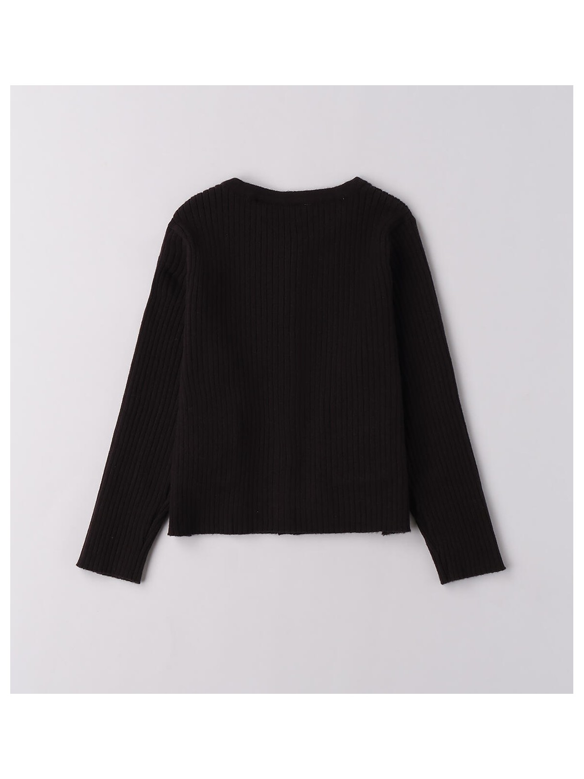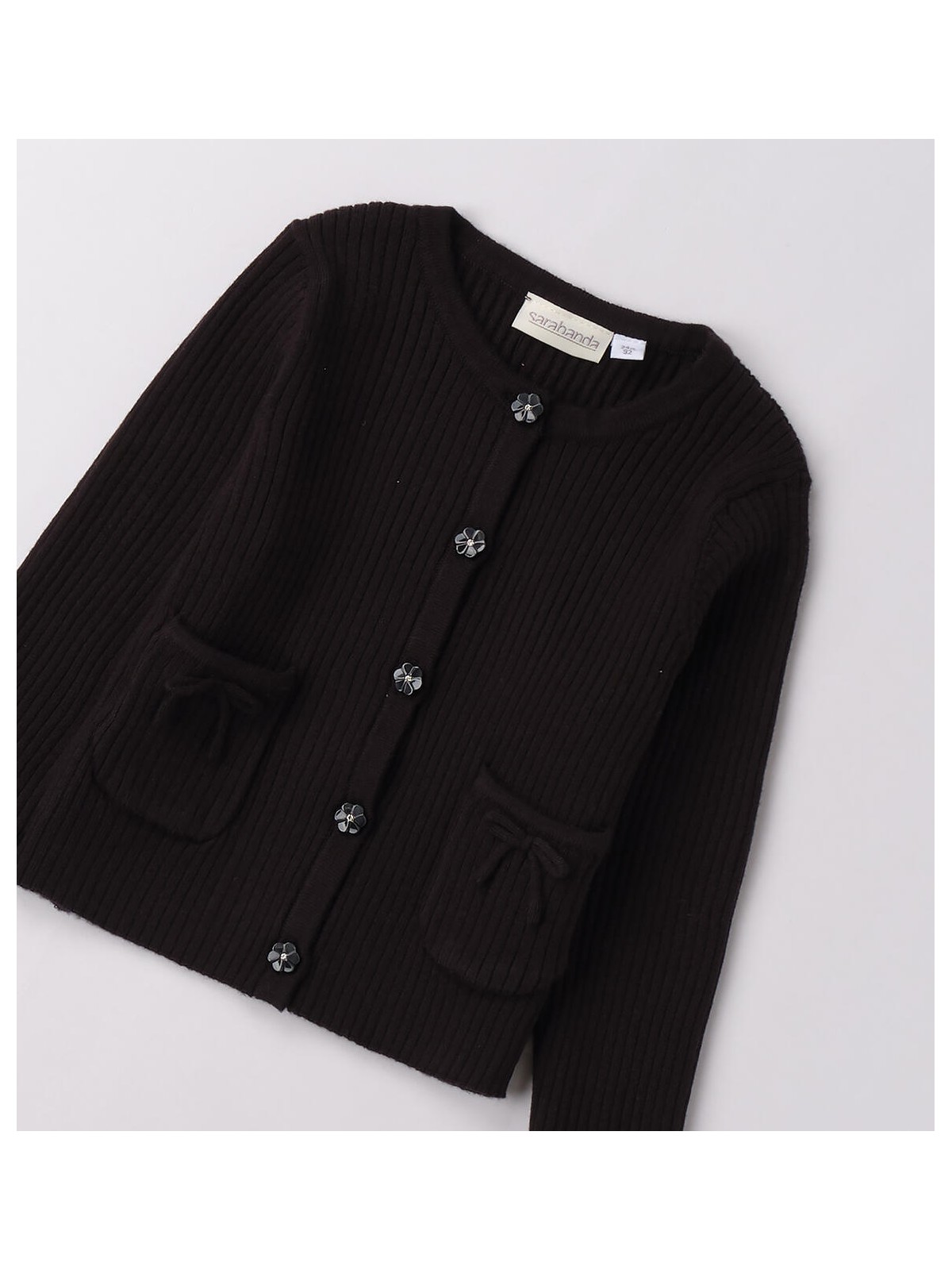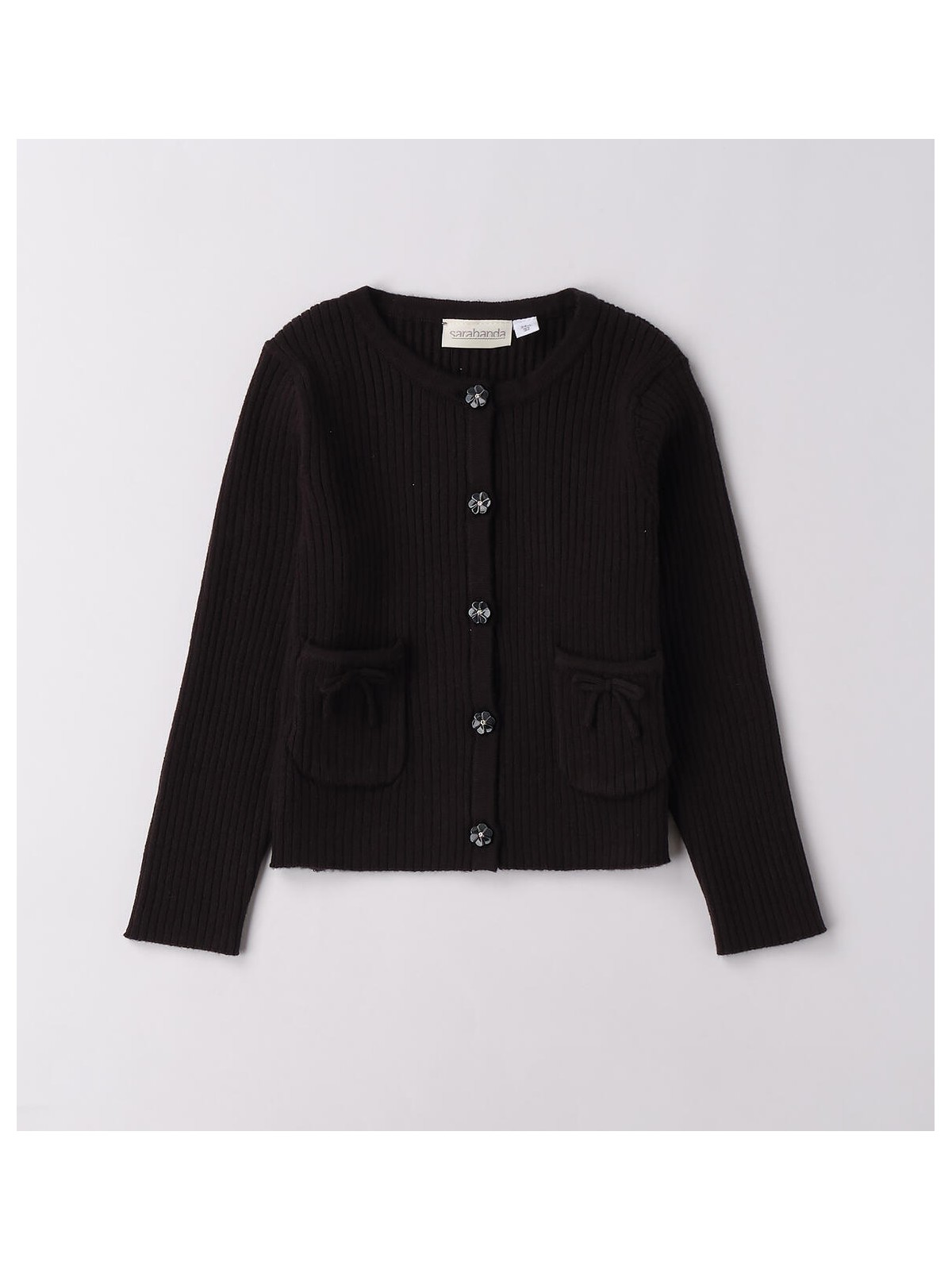 Cardigan per bambina realizzato in tricot a costine. Modello arricchito da tasche e fiocchi. Apertura con bottoni illiminati da strass