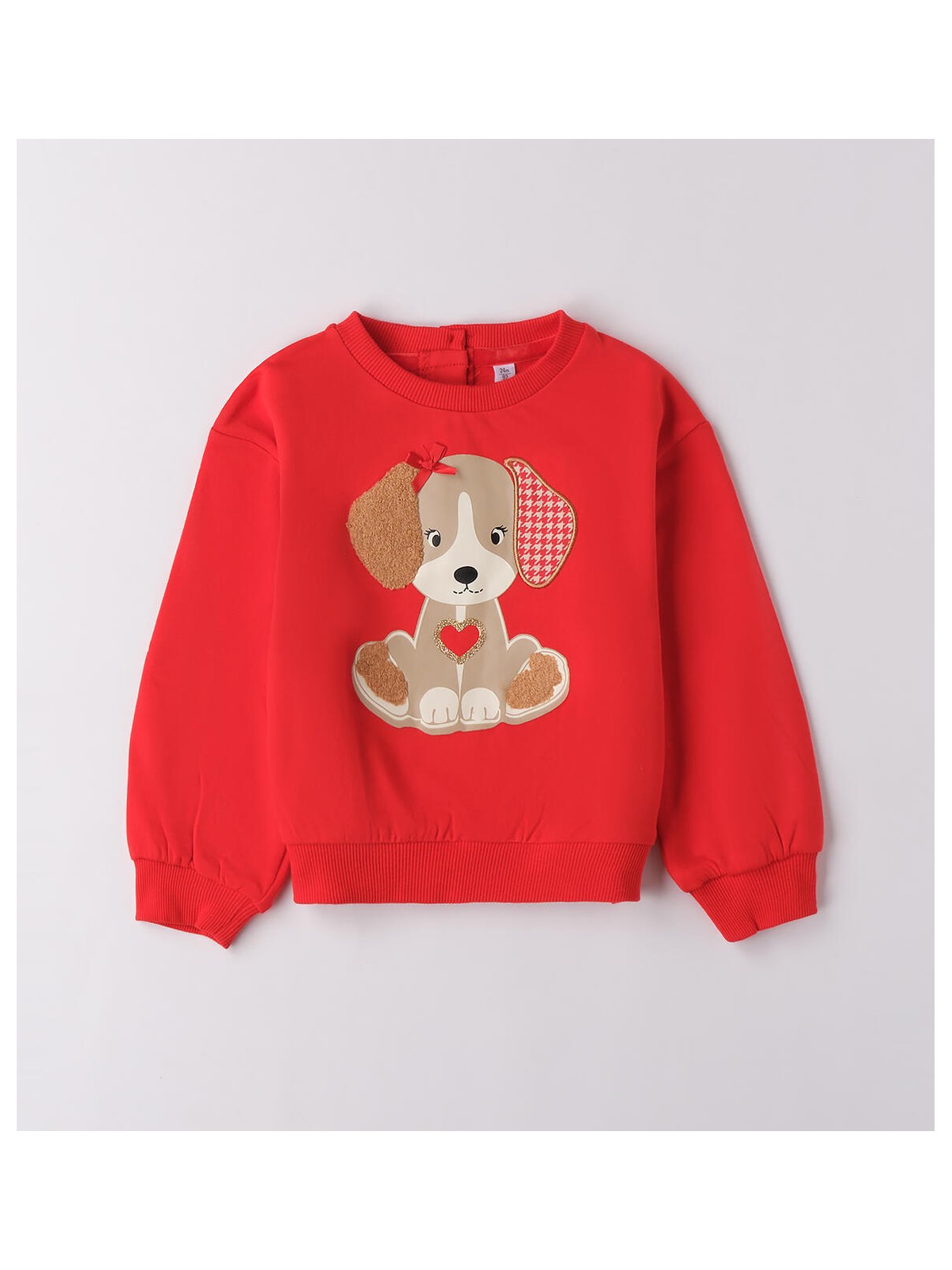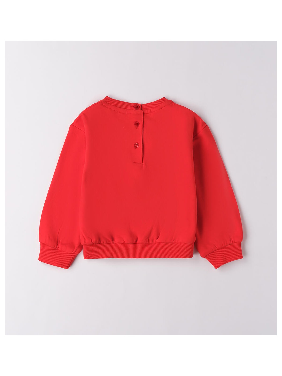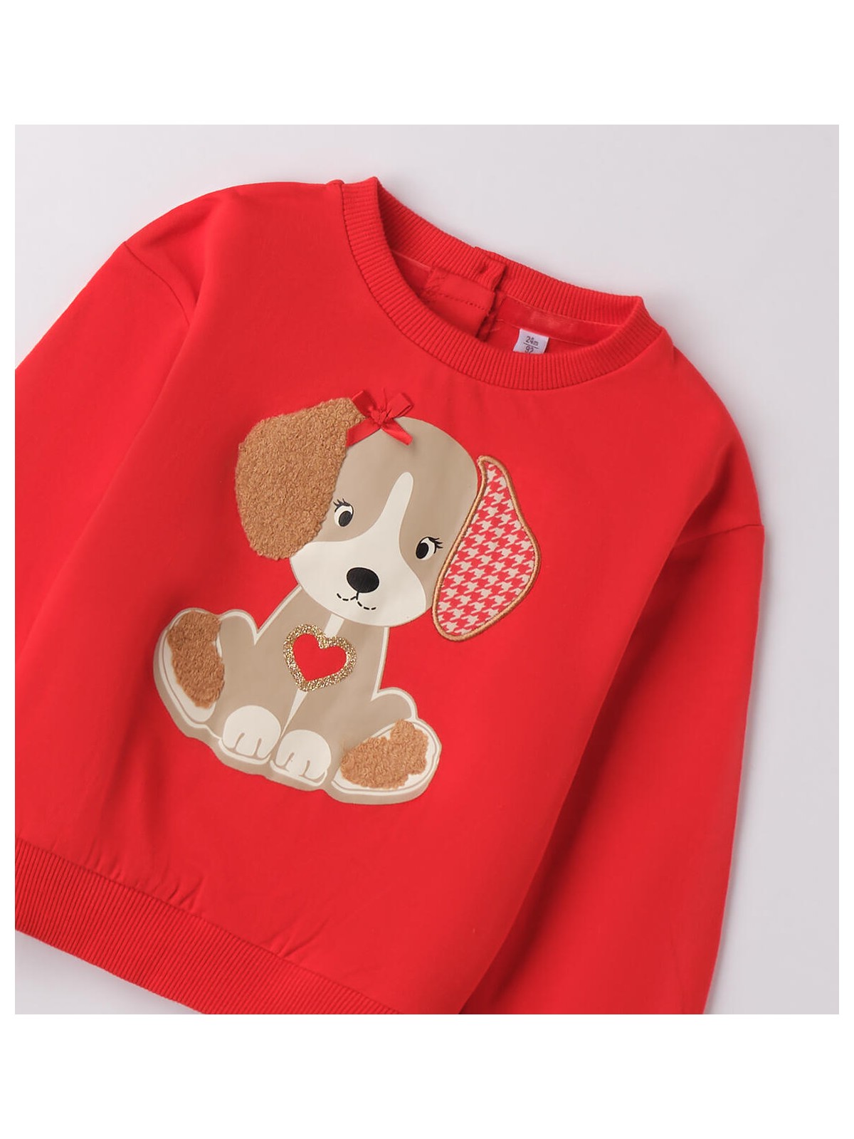 Felpa per bambina realizzata in felpa invernale di cotone stretch. Apertura dietro con bottoni. Modello arricchito da stampa, con applicazioni e ricamo spugna, glitter e piccolo fiocco.