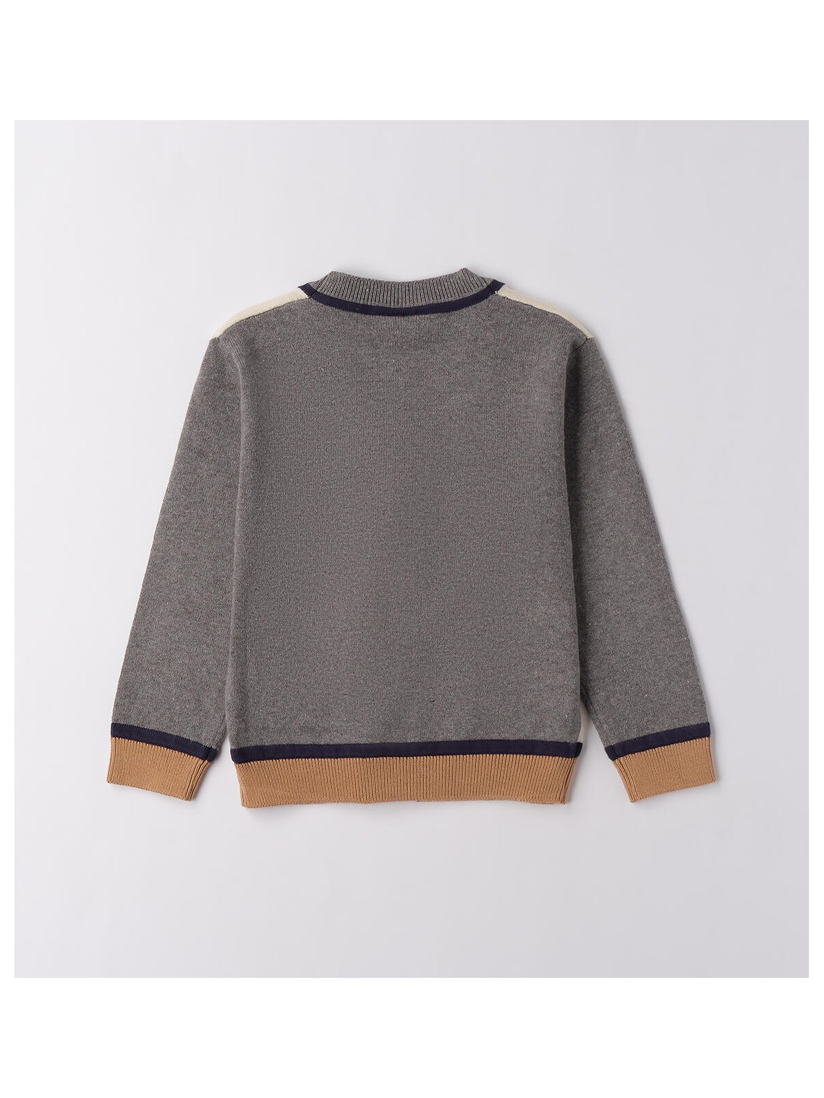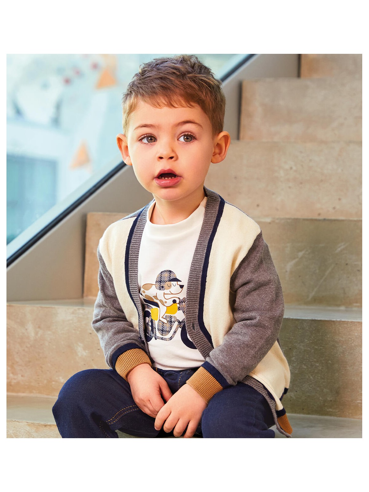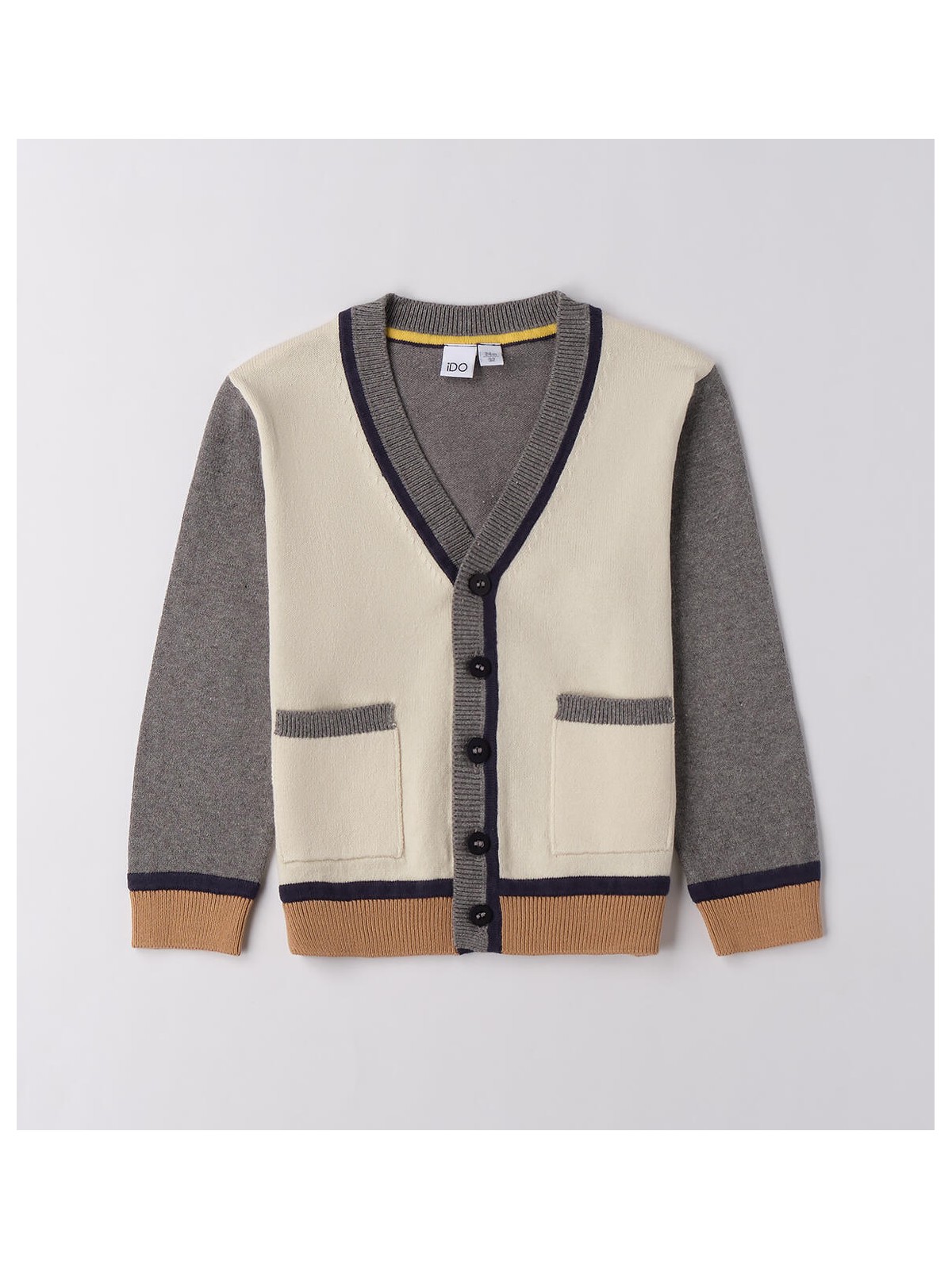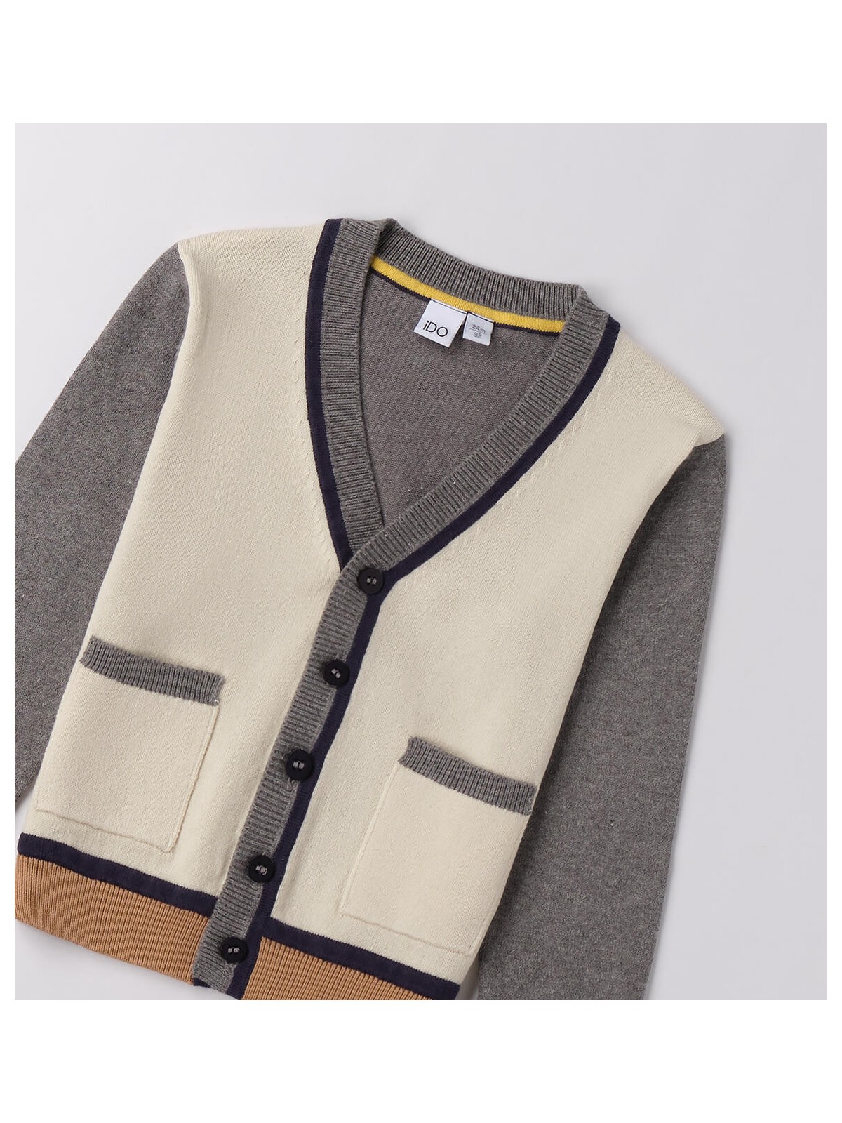 Cardigan per bambino realizzato in tricot. Il modello presenta apertura con bottoni, tasche laterali e dettagli a contrasto.