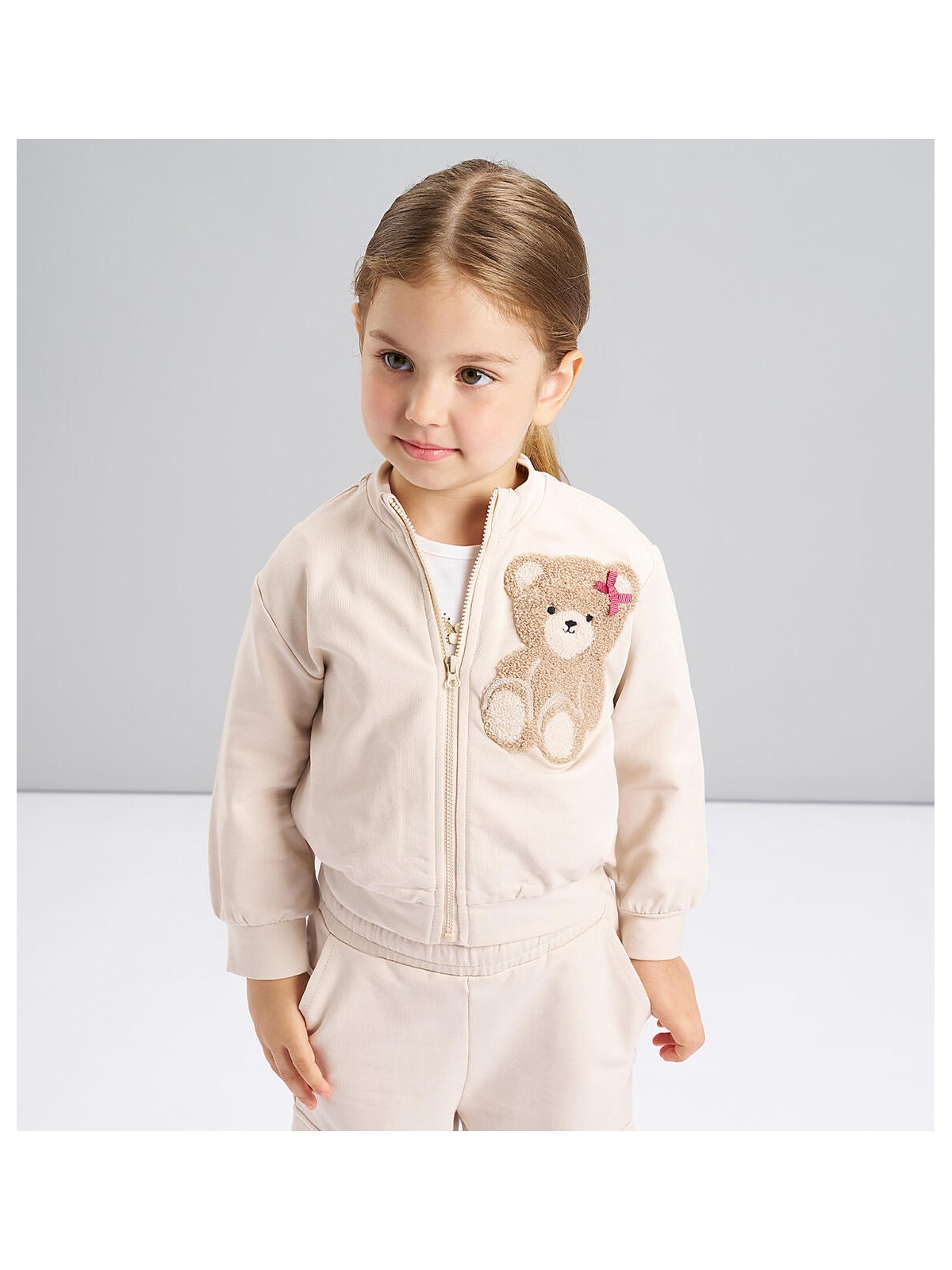 Felpa bambina realizzata in felpa di cotone stretch, pesantezza autunnale. Apertura con zip e ricamo spugna con applicazione ricamo spugna