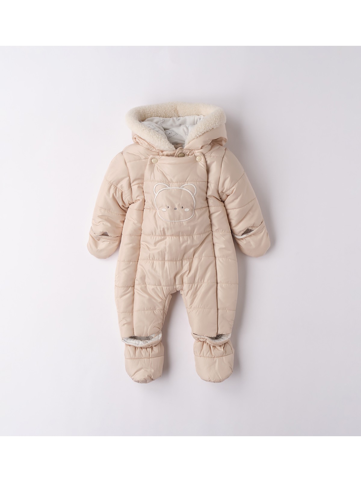 Tutone termico imbottito in ovatta per neonato modello unisex realizzato in microfibra. Il modello presenta apertura frontale con zip e bottoni a pressione, comodo cappuccio, guantini e scarpine staccabili.