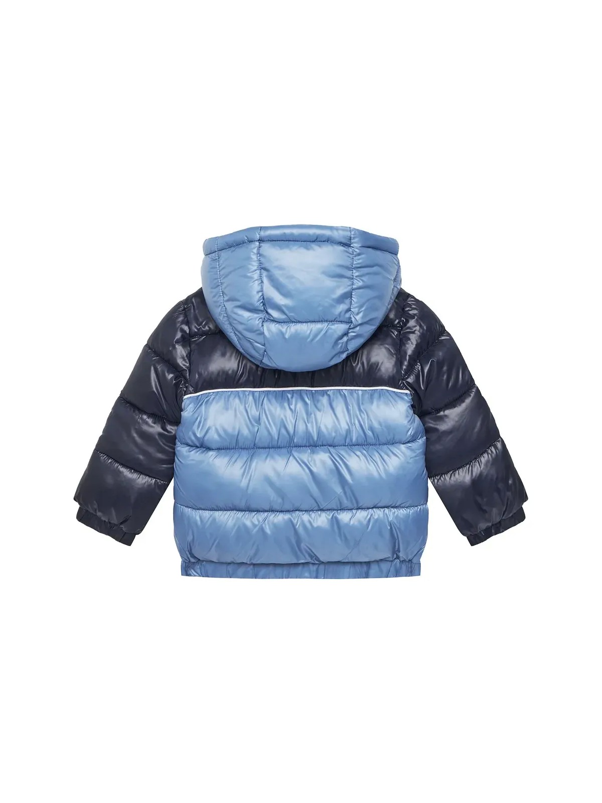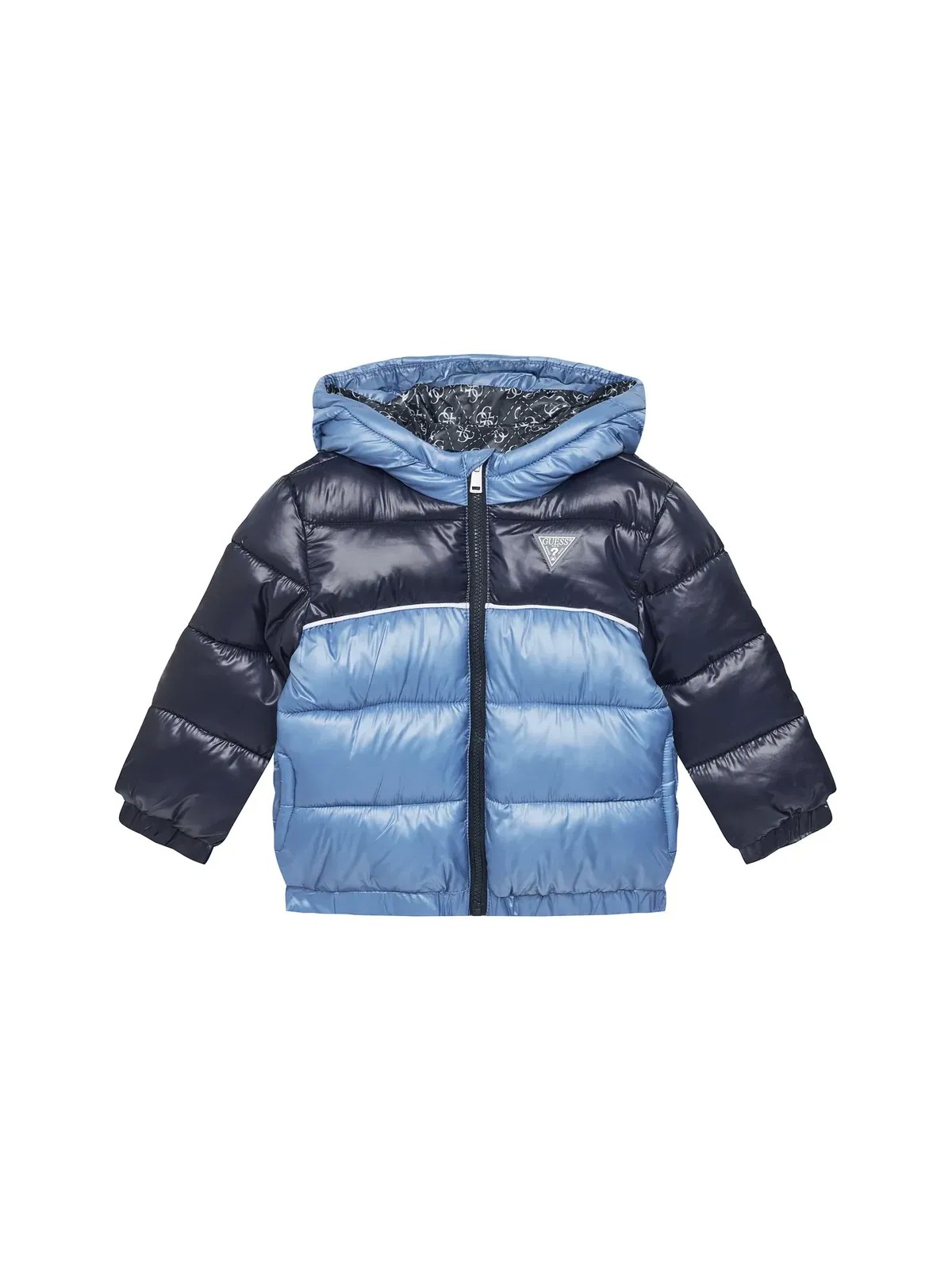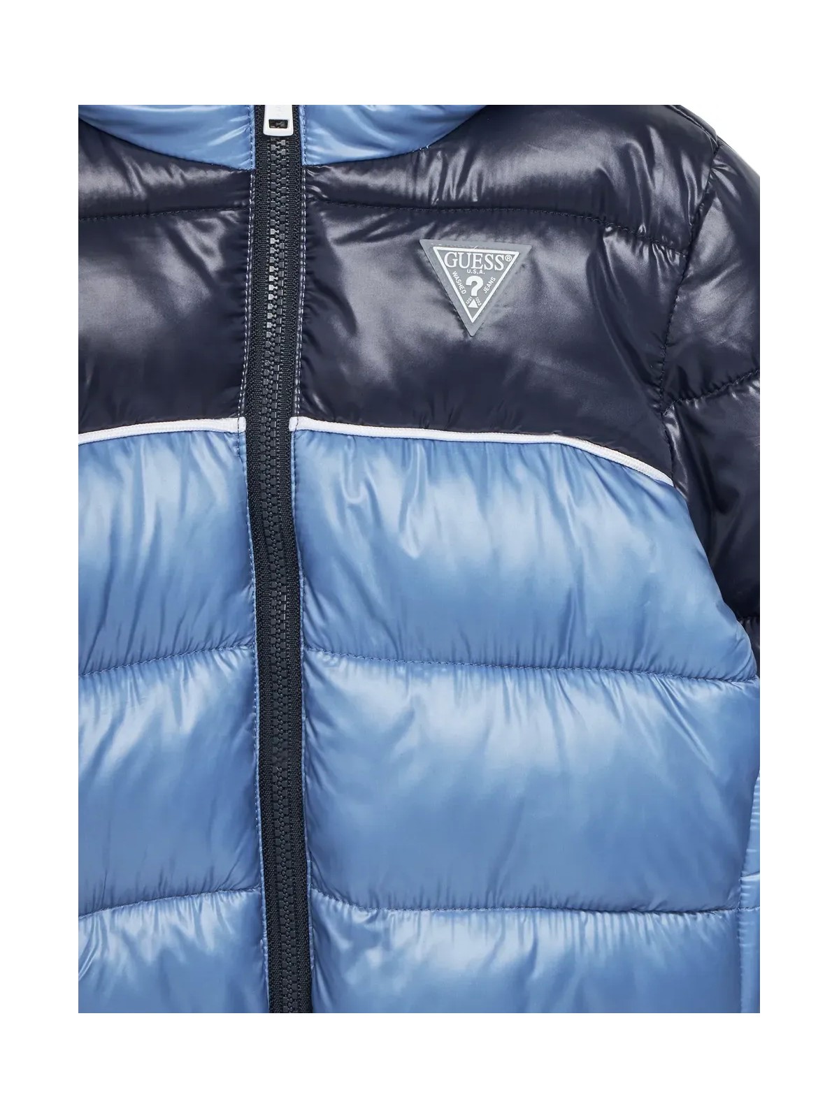 Piumino Guess bicolore . Apertura frontale con zip e cappuccio, elastico sul fondo e polsini . Vestibilità regular