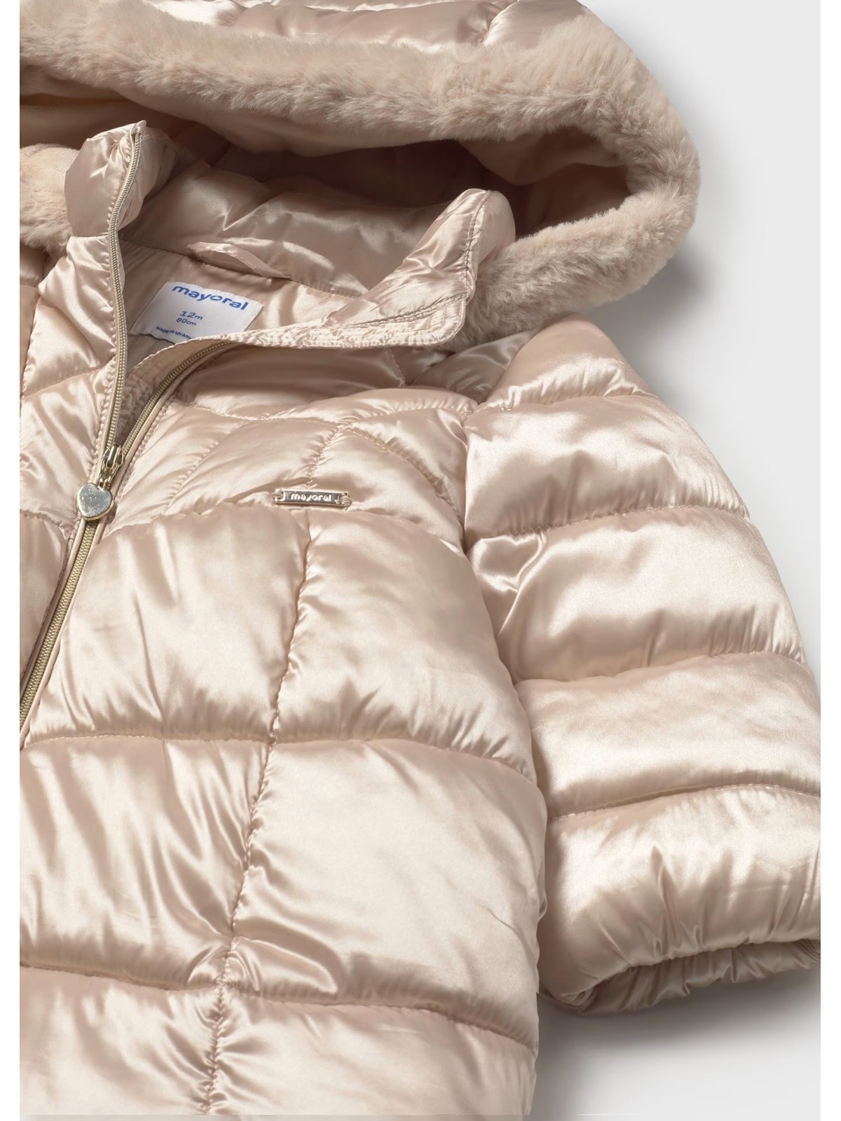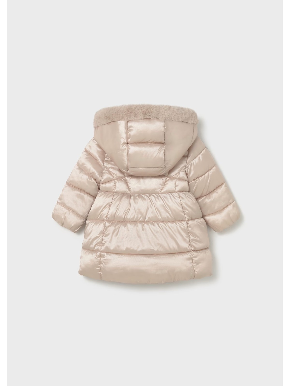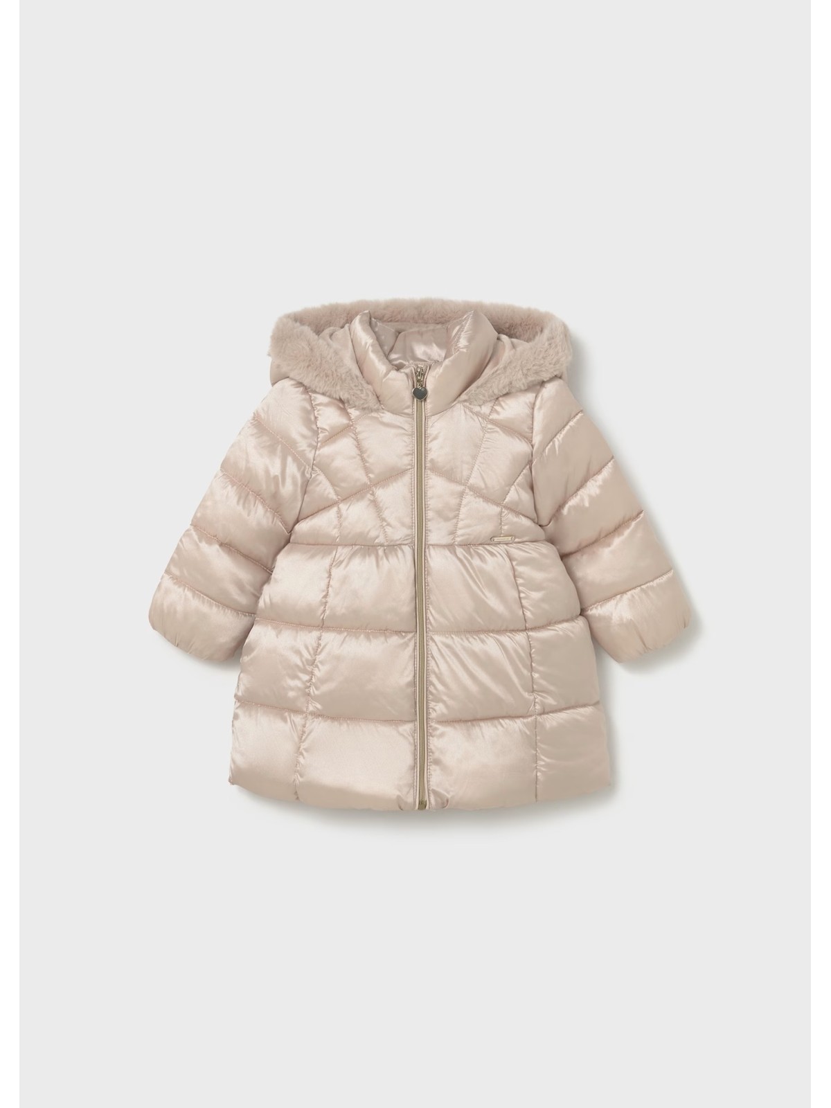 Contiene poliestere riciclato. Giaccone manica lunga per neonata con polsini elasticizzati. Cappuccio con dettagli in pellicciotto. Design con taglio lungo. Chiusura centrale con cerniera. Morbida fodera interna in poliestere. Tasche funzionali nella parte anteriore.