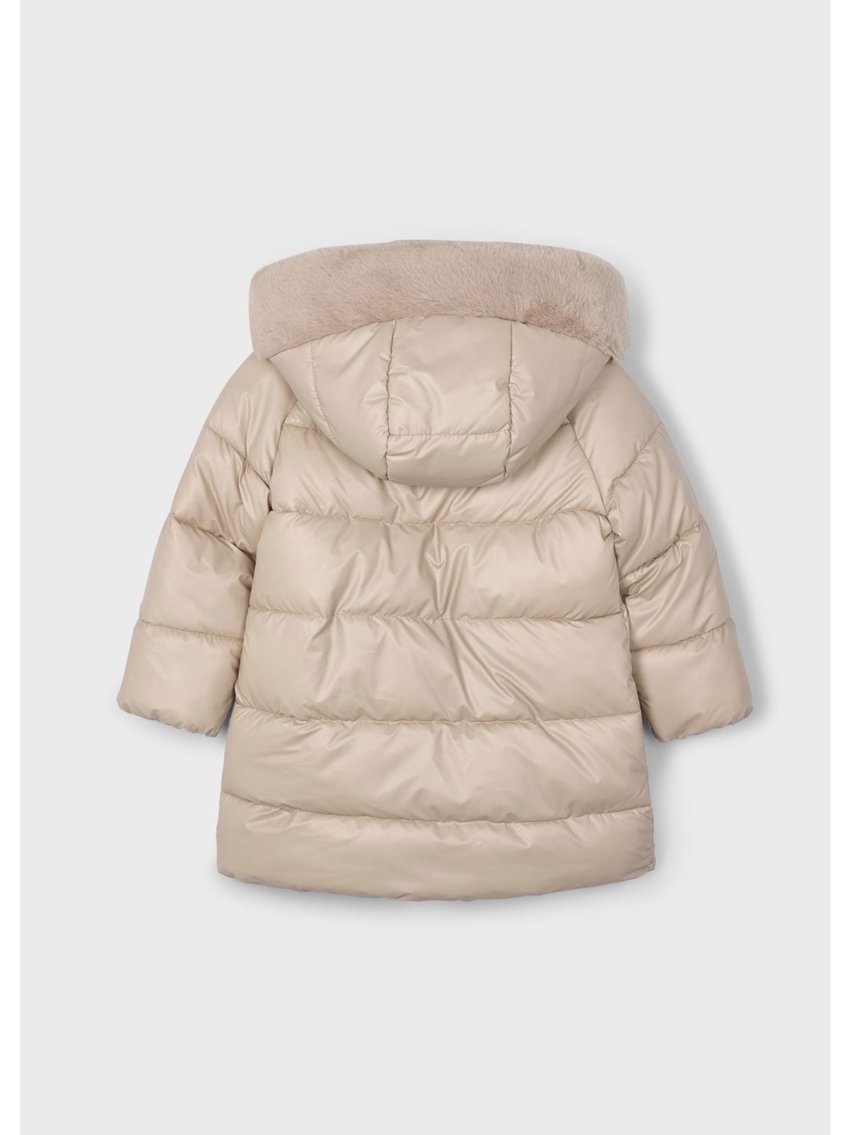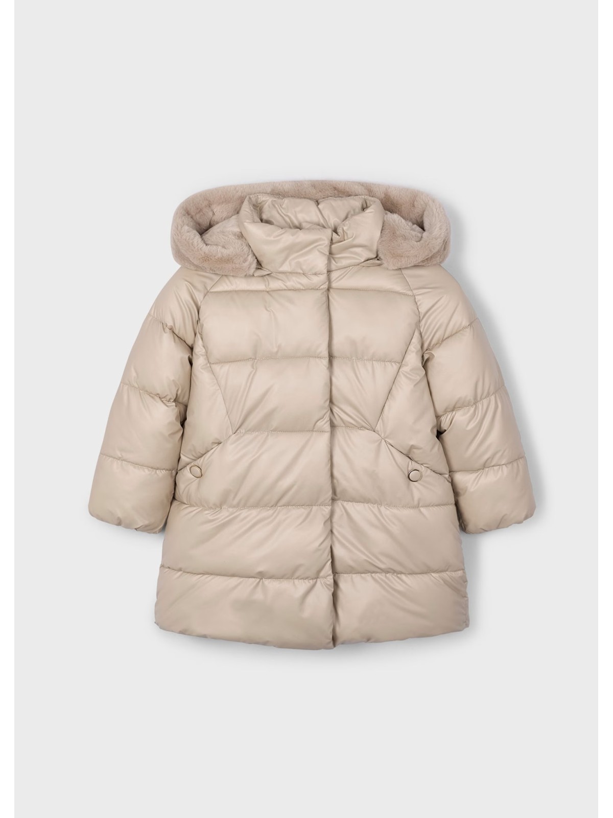 Giaccone manica lunga per bambina con polsini elasticizzati. Cappuccio rimovibile con dettagli in pellicciotto. Design con taglio lungo. Chiusura con bottoni nella parte anteriore. Chiusura centrale con cerniera. Esterno in tessuto con effetto imbottito.