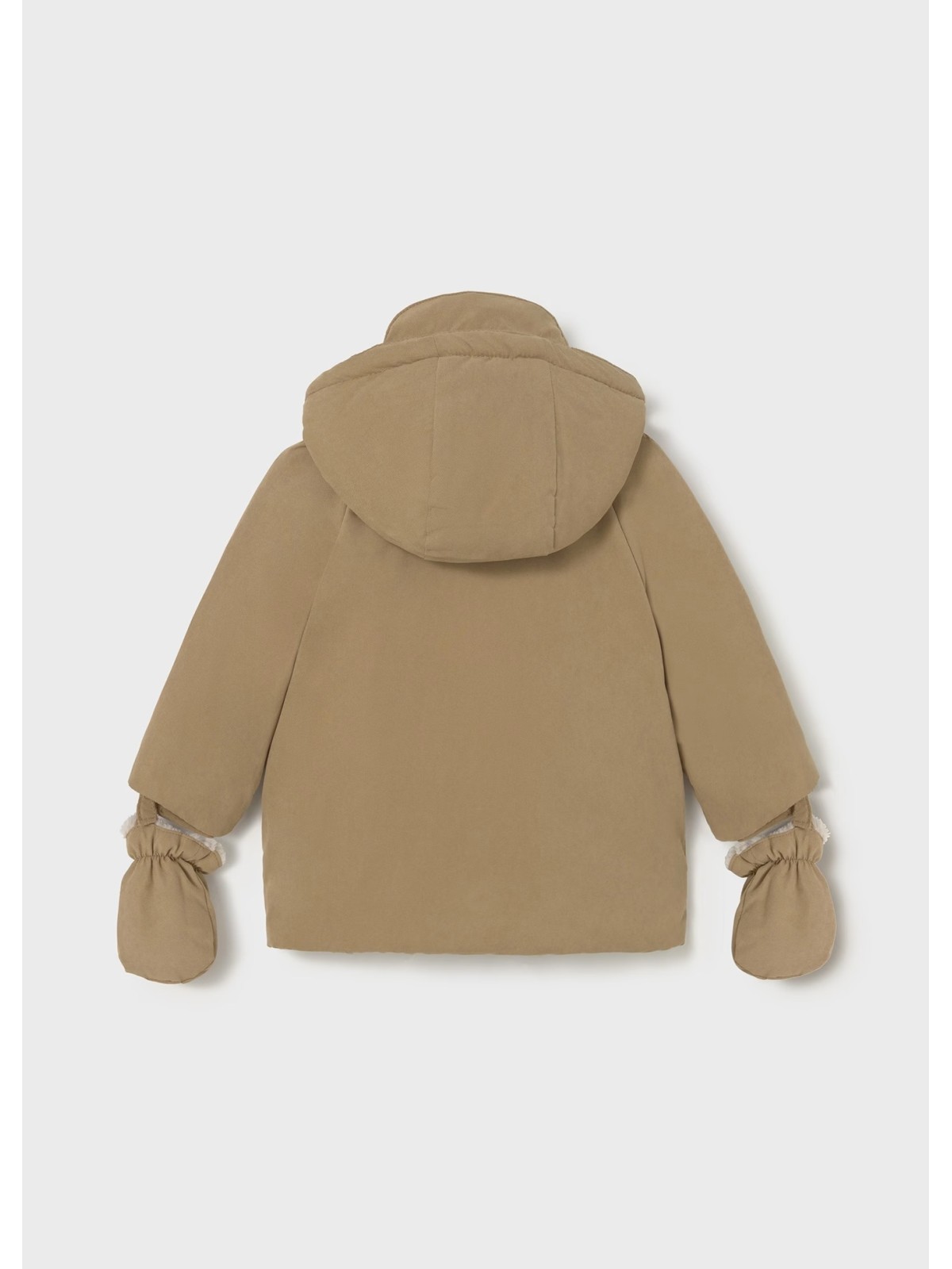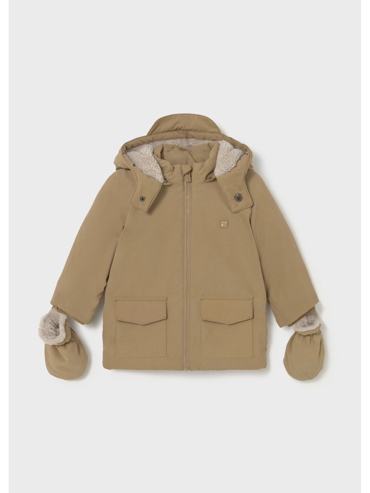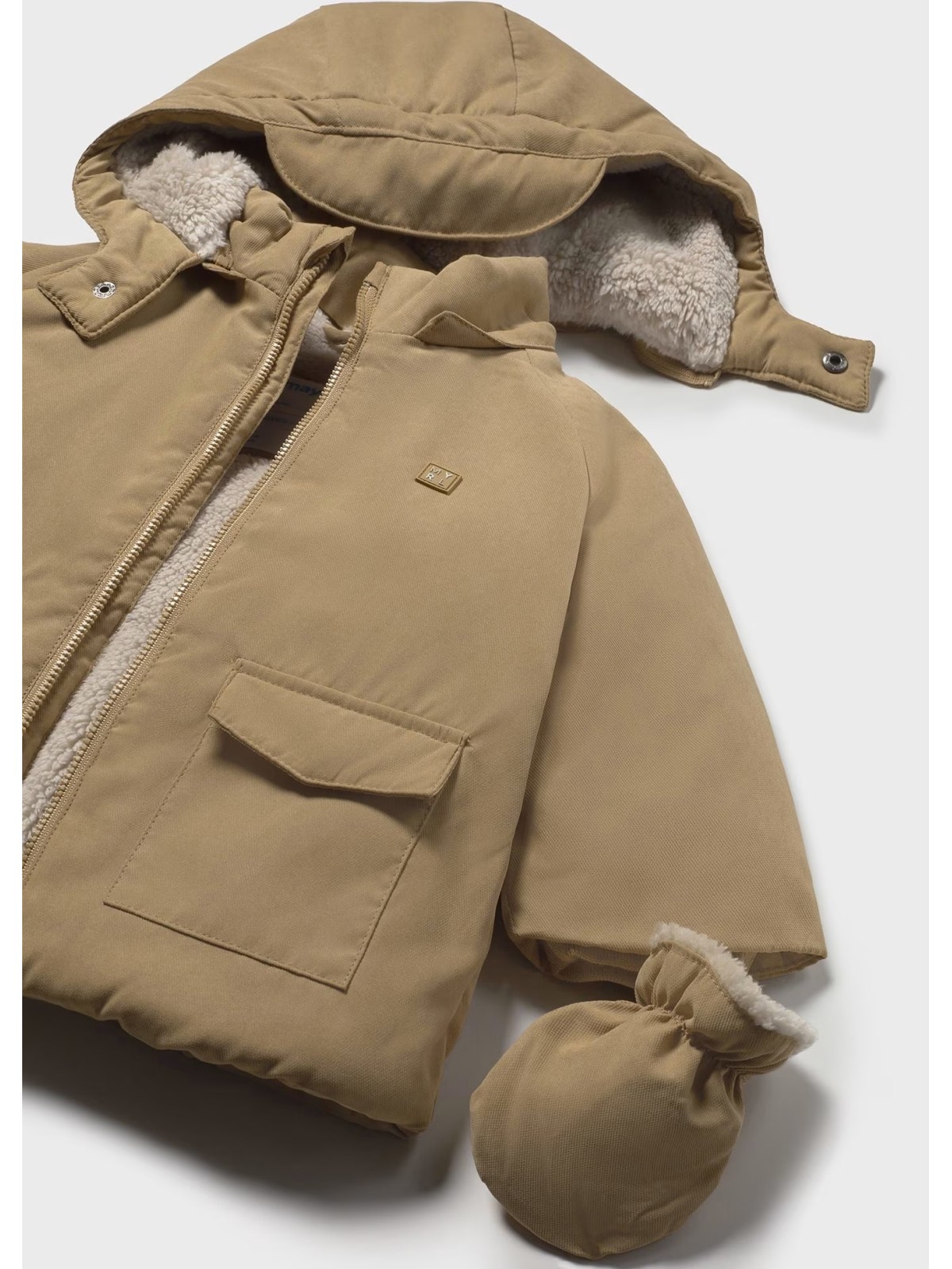 Giaccone manica lunga per neonato con polsini elasticizzati. Colletto avvolgente. Colletto con cappuccio rimovibile. Chiusura con bottoni nella parte anteriore. Chiusura centrale con cerniera. Fodera interna di vari tessuti. Tasche funzionali nella parte anteriore.