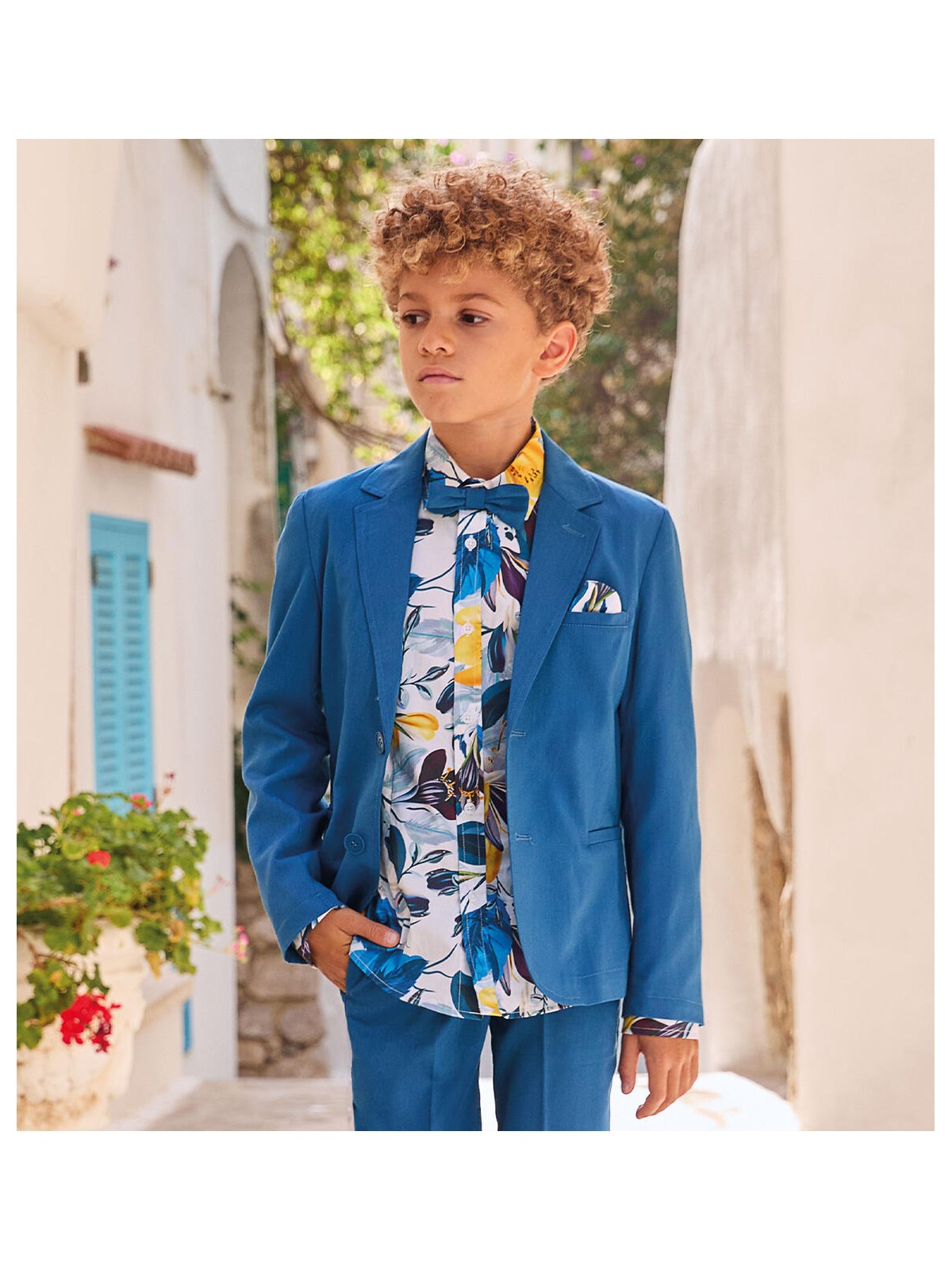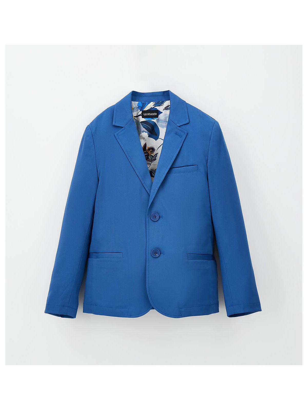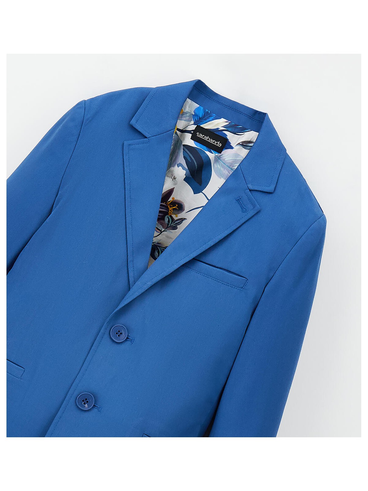 Giacca per ragazzo Sarabanda realizzata in twill stretch con apertura tramite bottobi. Taschino con fodera fantasia per la realizzazione di pratica pochette. Il modello fa parte della collezione Sarabanda Premium pensata per vestire le cerimonie più formali
