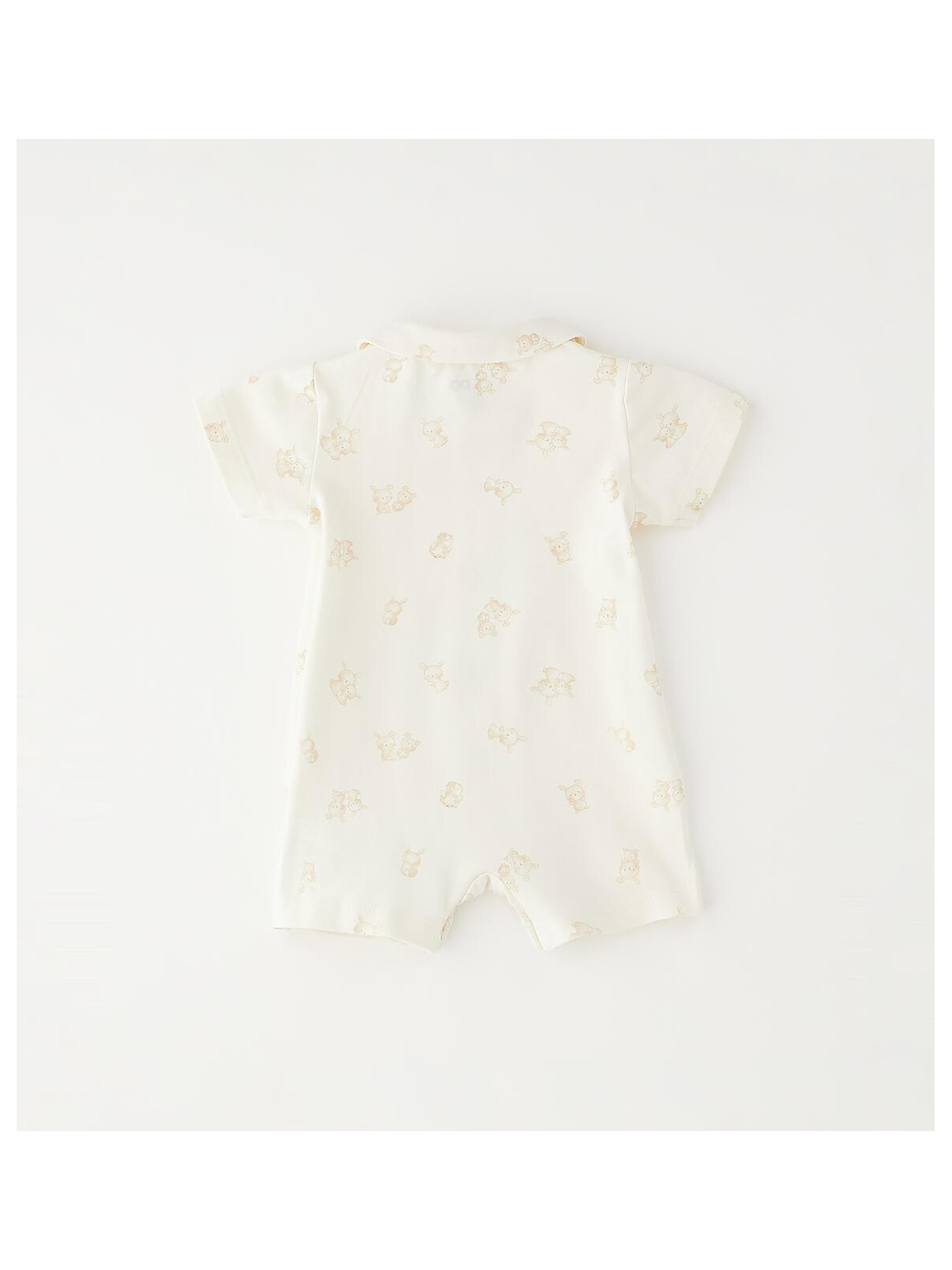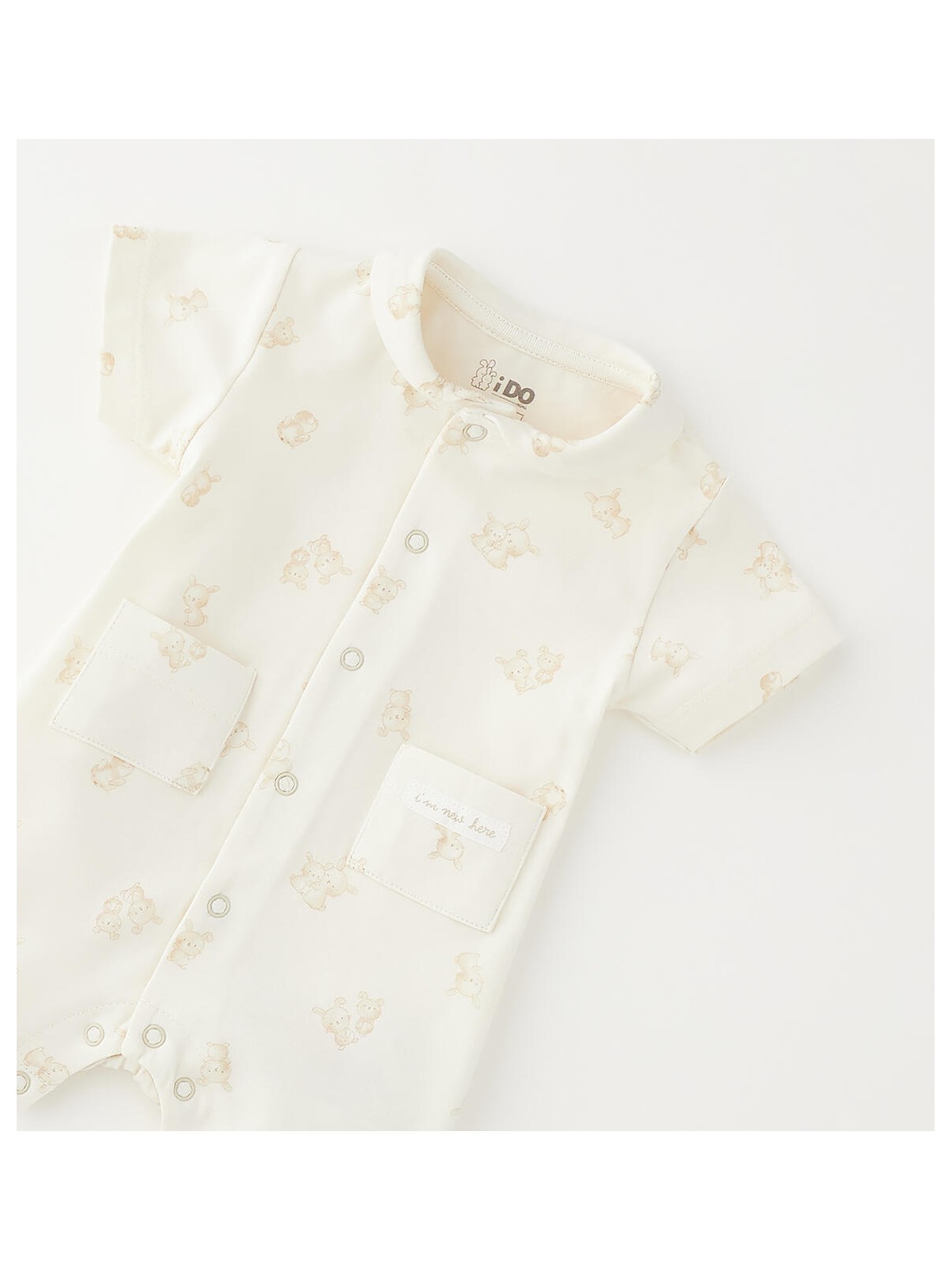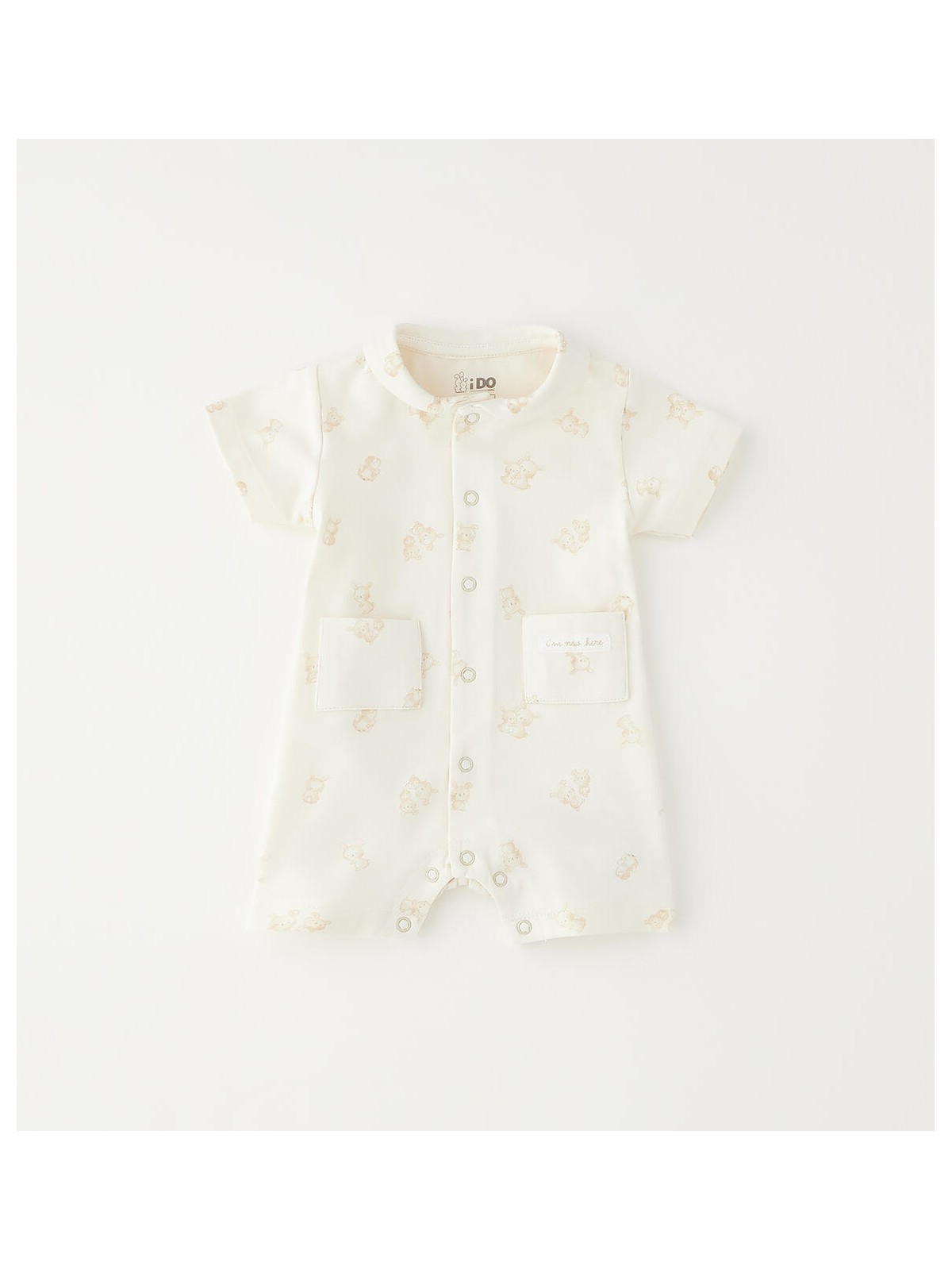 Pagliaccetto per neonati realizzato in jersey stretch di cotone. Modello unisex. Apertura davanti e nel sottogamba con bottoni a pressione per agevolare il cambio e la vestizione. Il modello ha fantasia all over e taschini davanti.
