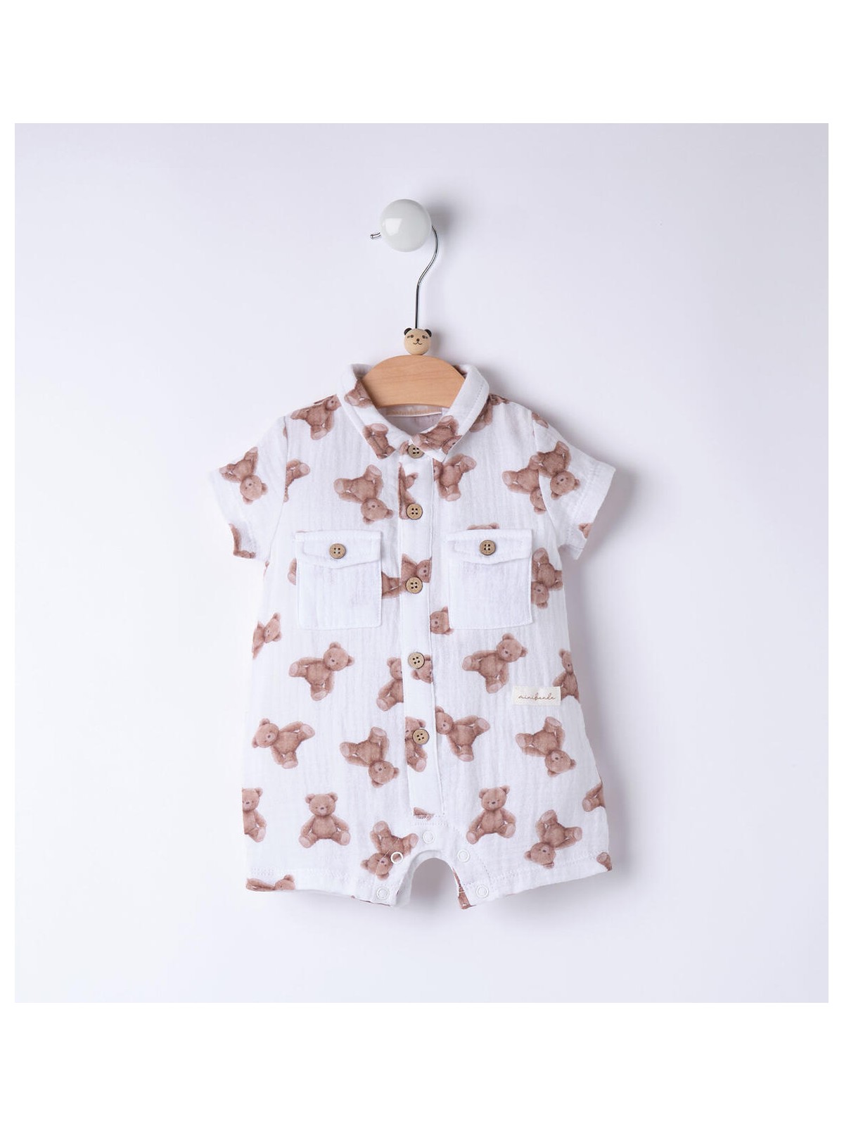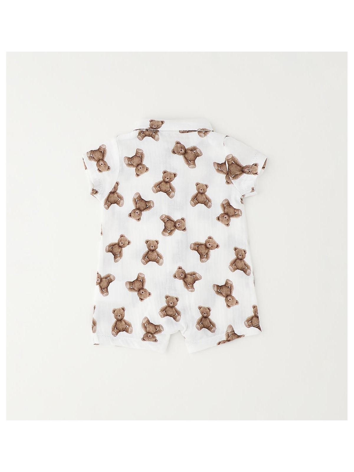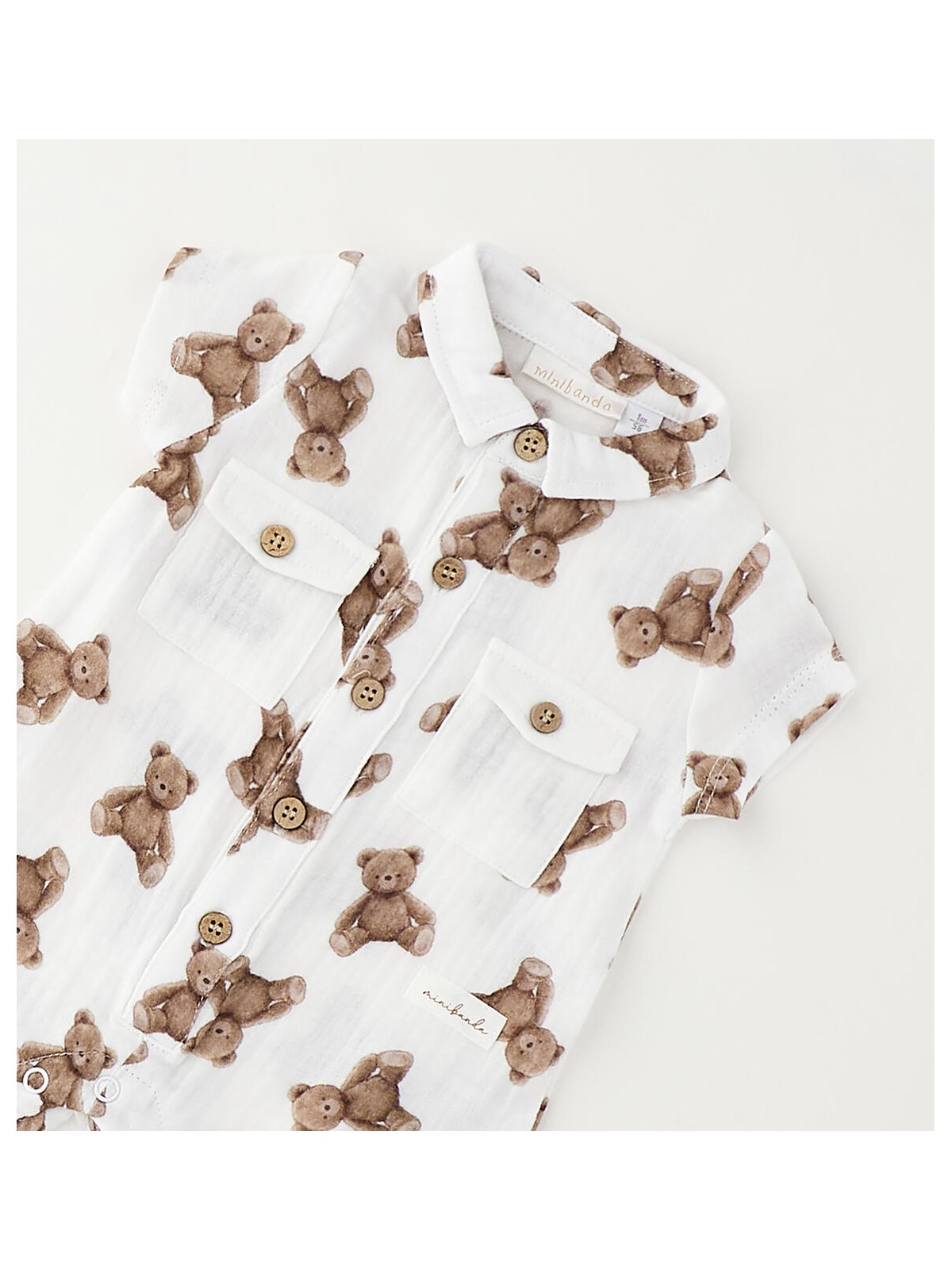 Pagliaccetto per neonato Minibanda realizzato in tela 100% cotone con stampa all over di orsetti. Tasche davanti. Apertura davanti e nell'interno gamba con bottoni.
