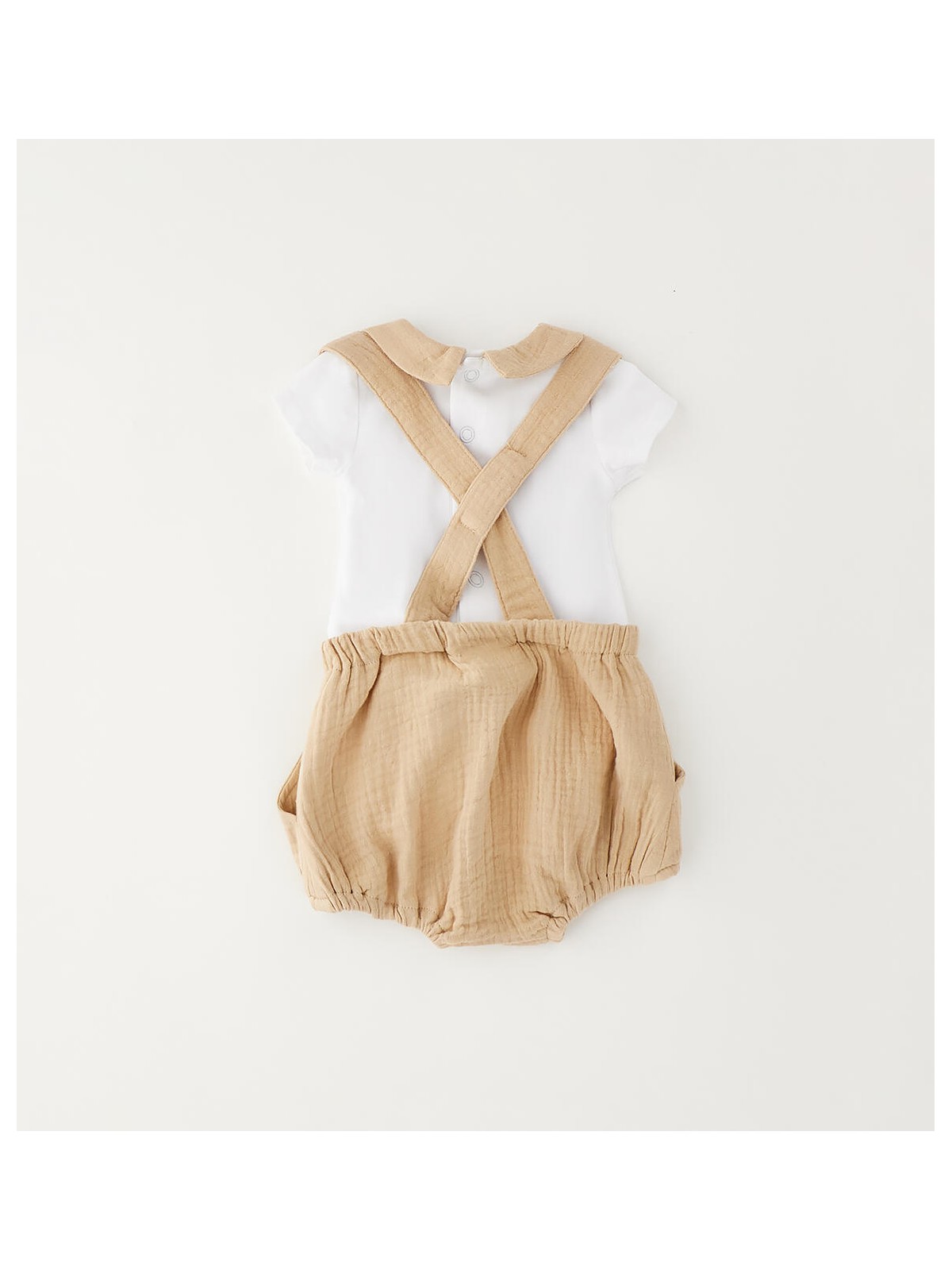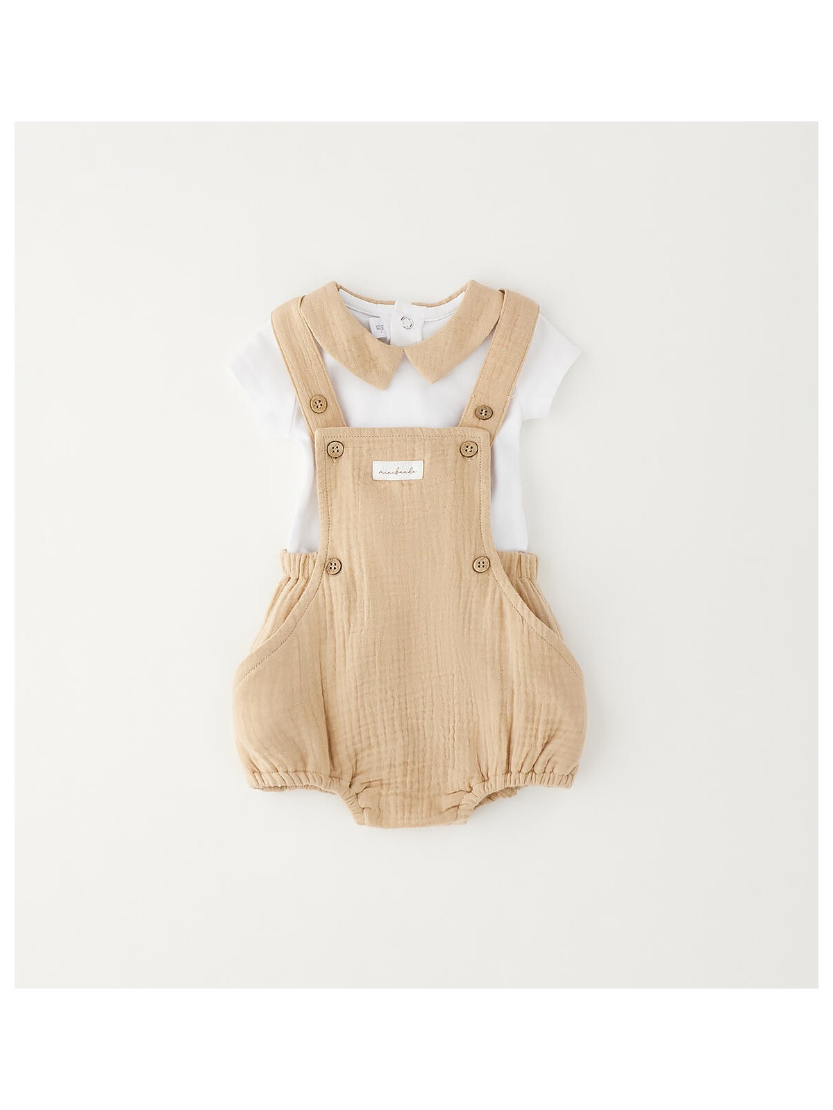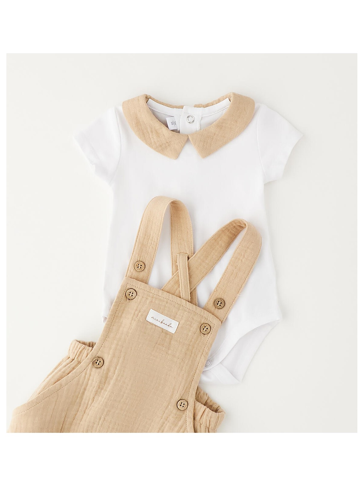 Completo manica corta per neonato Minibanda composto da body in n jersey stretch e salopette in tela di cotone. Bretelle regolabili.