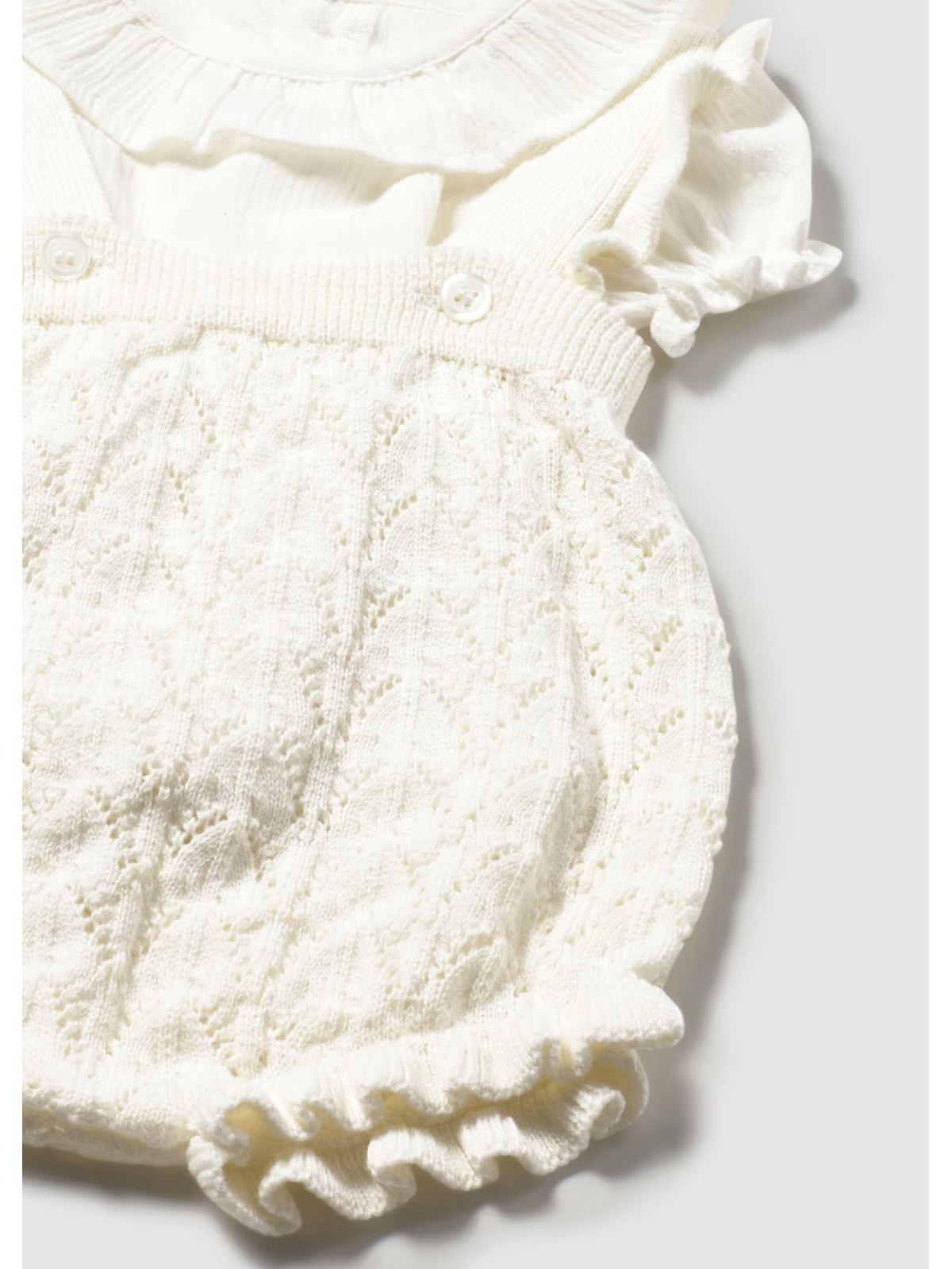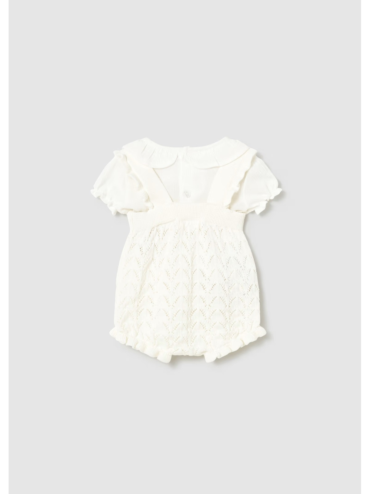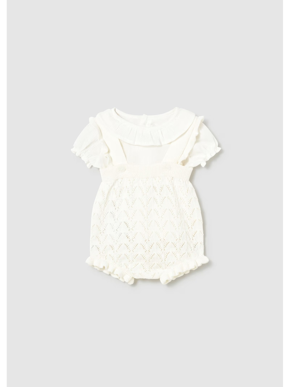 Completo manica corta per neonata 2 pezzi , composto da t-shirt con colletto e salopette in filo di cotone. traforato.