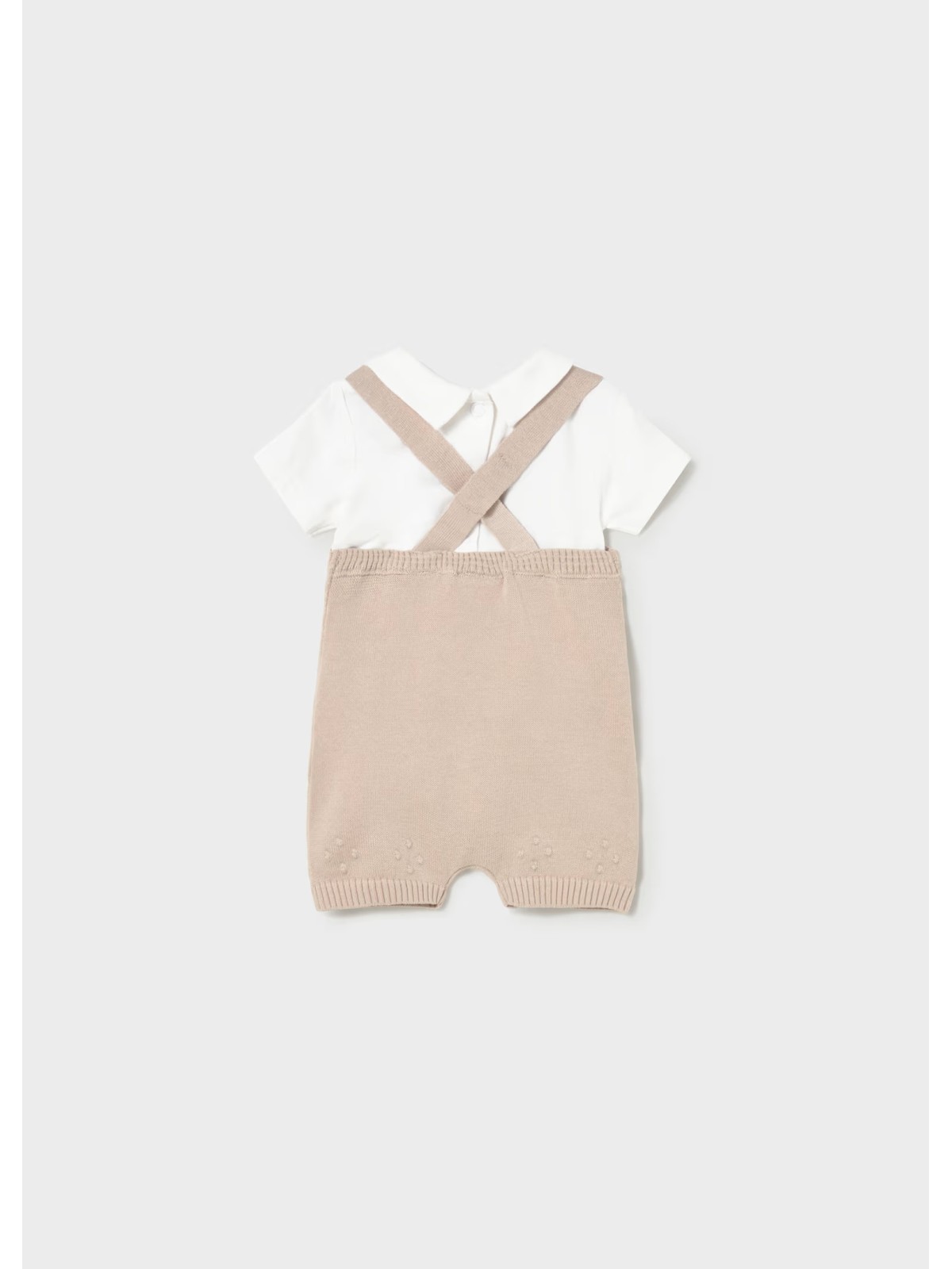 Completo manica corta per neonato composto da body in jersey stretch e salopette in filo di cotone. Lavorazione frontale