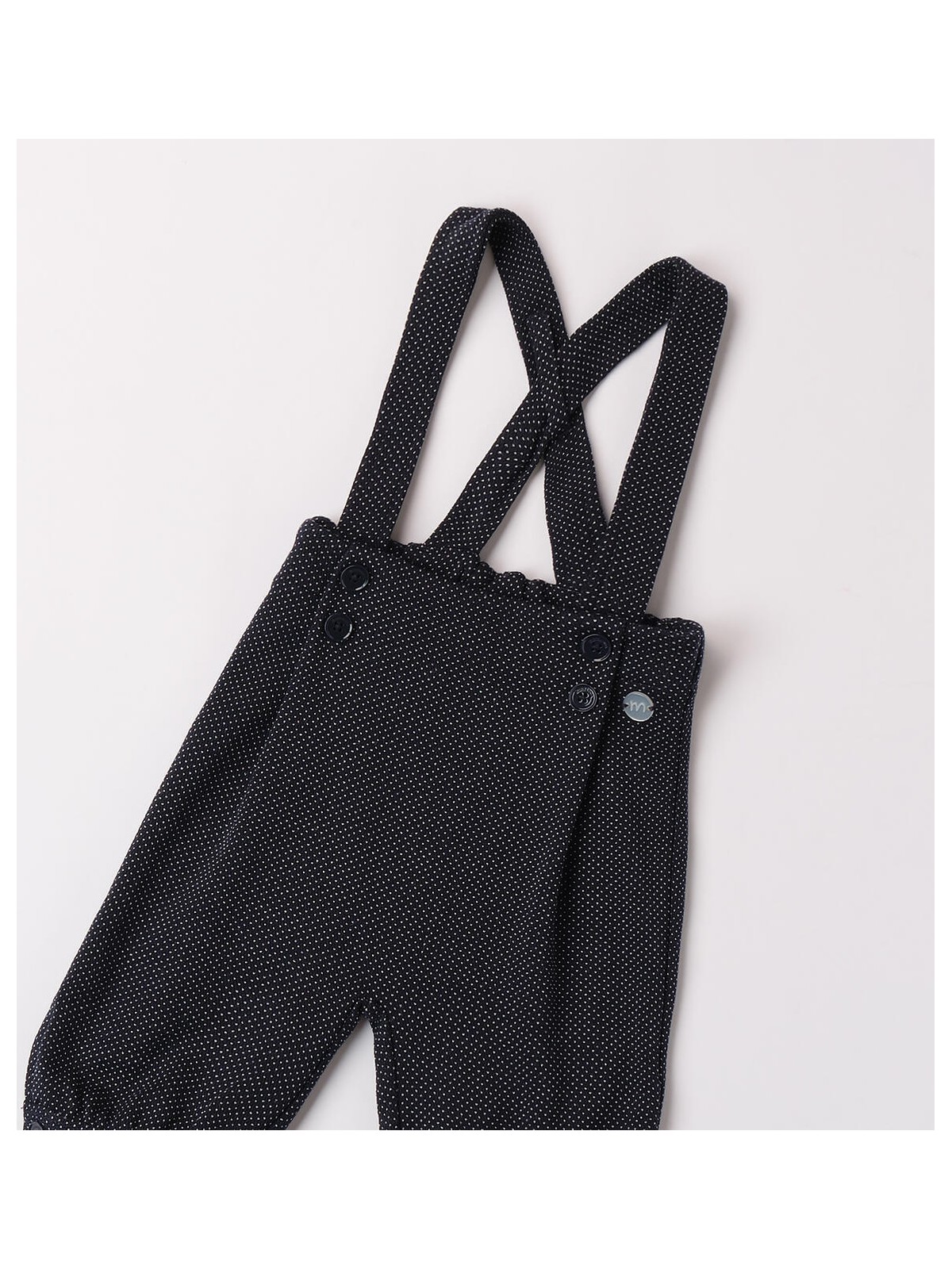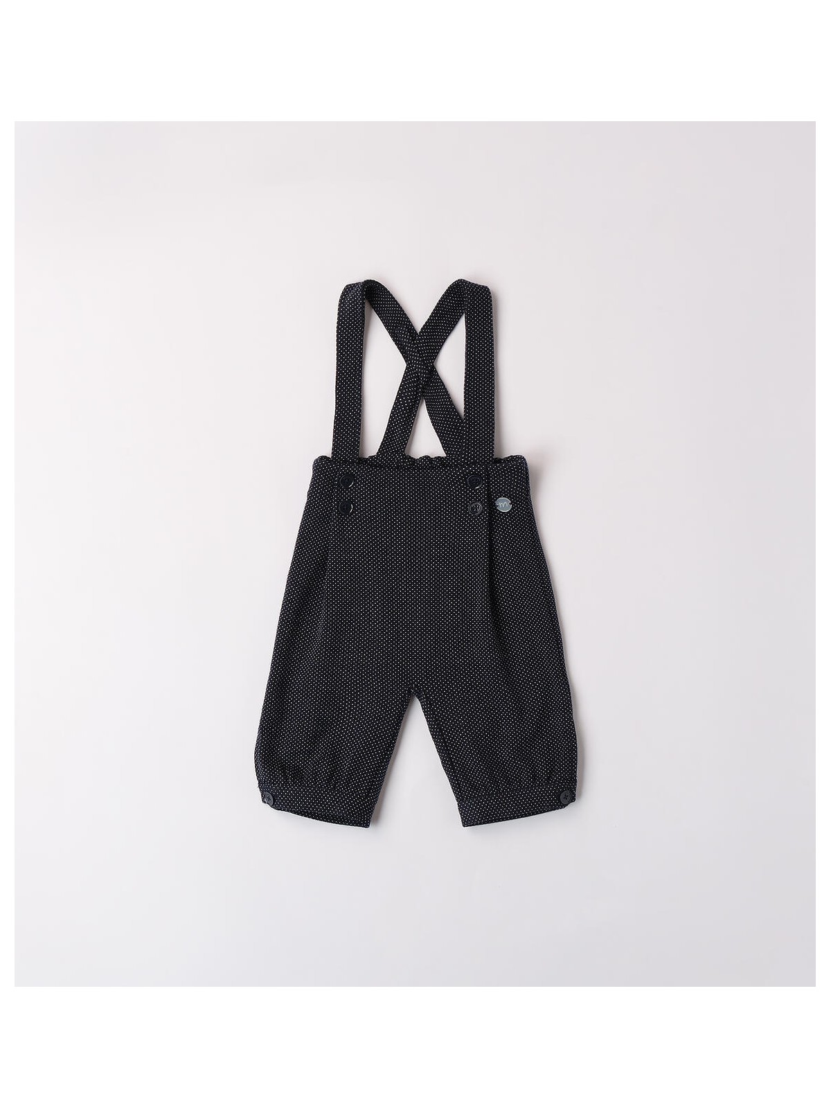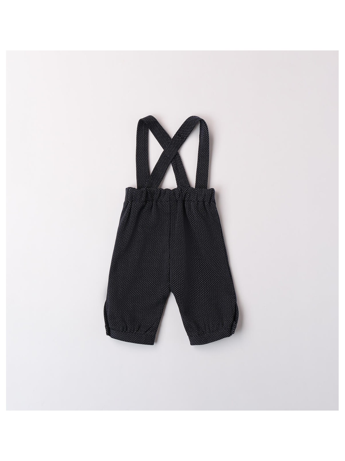 Pantalone cerimonia bimbo in tessuto jaquard micro fantasia. Il modello, elegante e formale, presenta bretelle regolabili, bottoni frontali in arricchimento e polsini sul fondo.