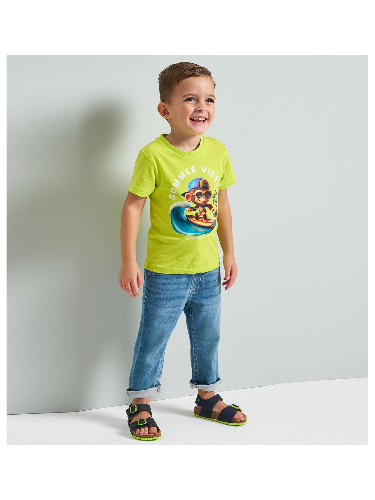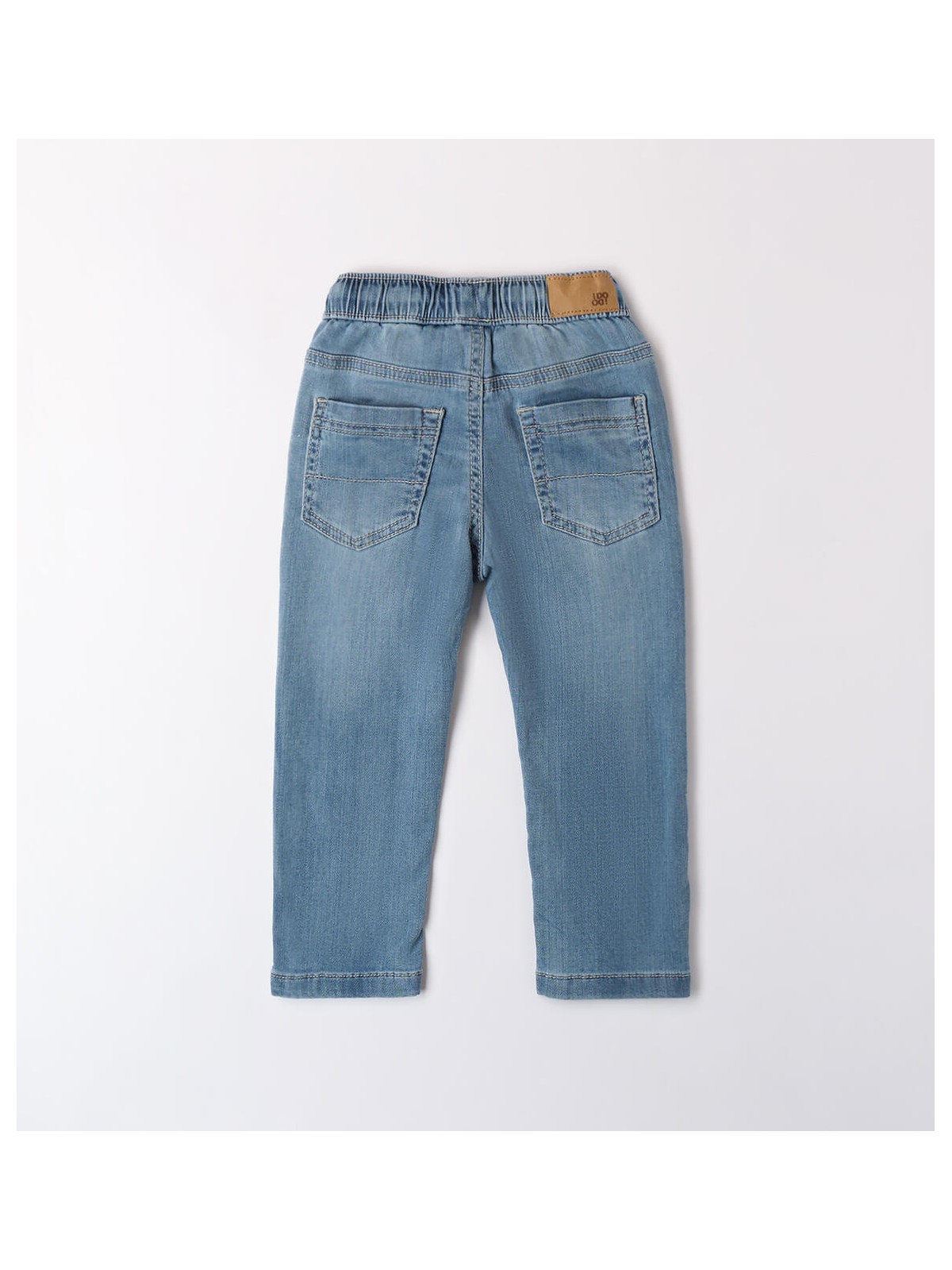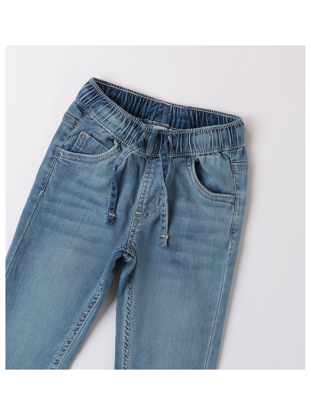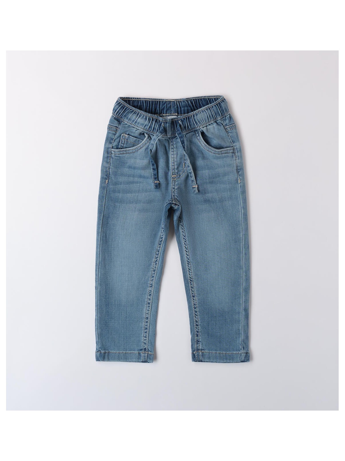 Jeans per bambino iDO da 9 mesi a 8 anni iDO in tessuto denim maglia elasticizzato di cotone. Il modello presenta vita elasticizzata con coulisse, tasche laterali e risvoltini sul fondo. Vita regolabile con elastico asolato interno. Modello regular fit.