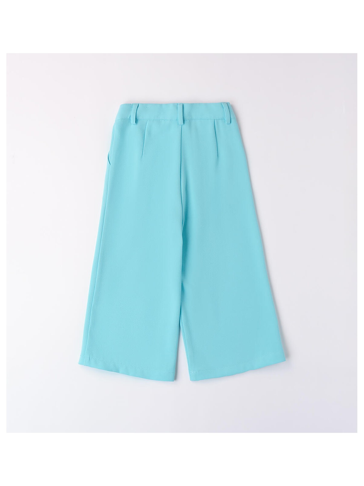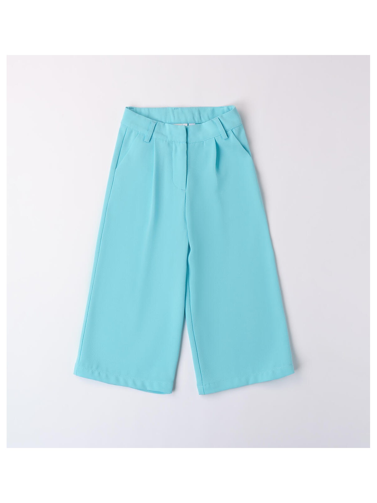 Pantaloni da bambina realizzati in tessuto crepes. Il modello presenta apertura con bottone e zip, tasche laterali e fantasia tinta unita. Modello con gamba ampia. Vita regolabile con elastico asolato interno