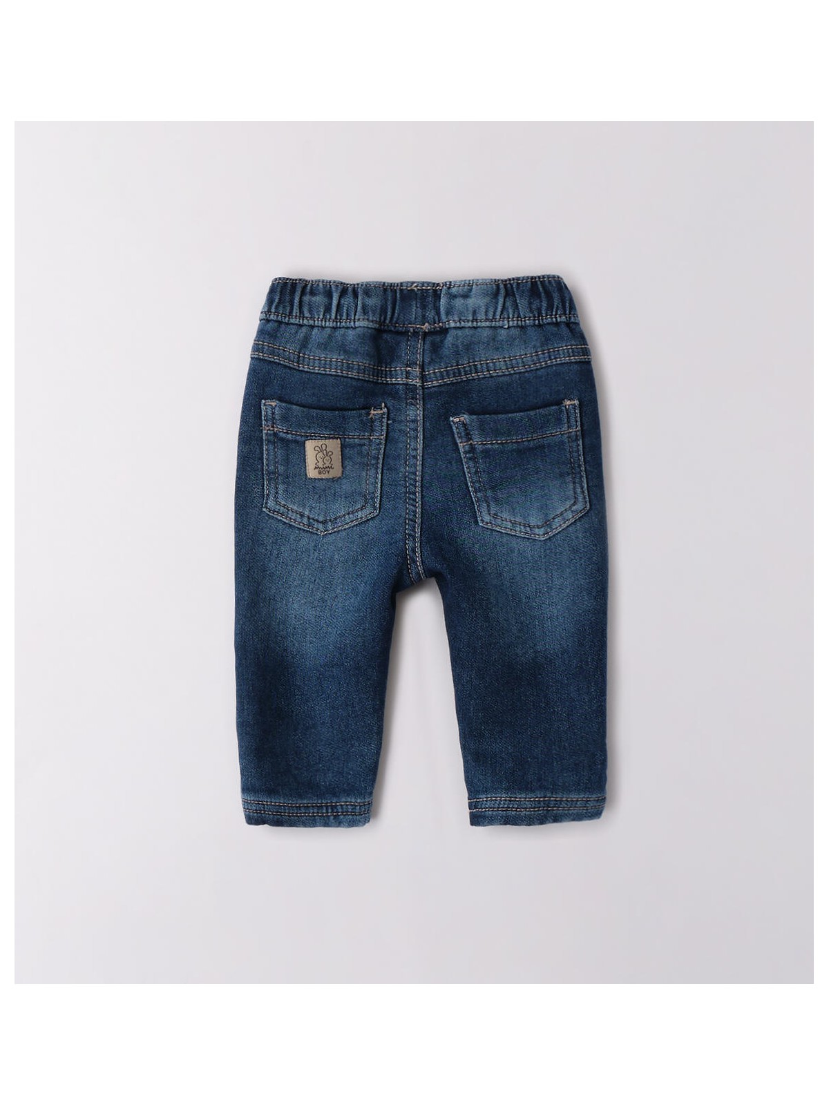 Jeans per neonato realizzati in denim maglia di cotone stretch. Il modello ha la vita regolabile con elastico asolato interno.