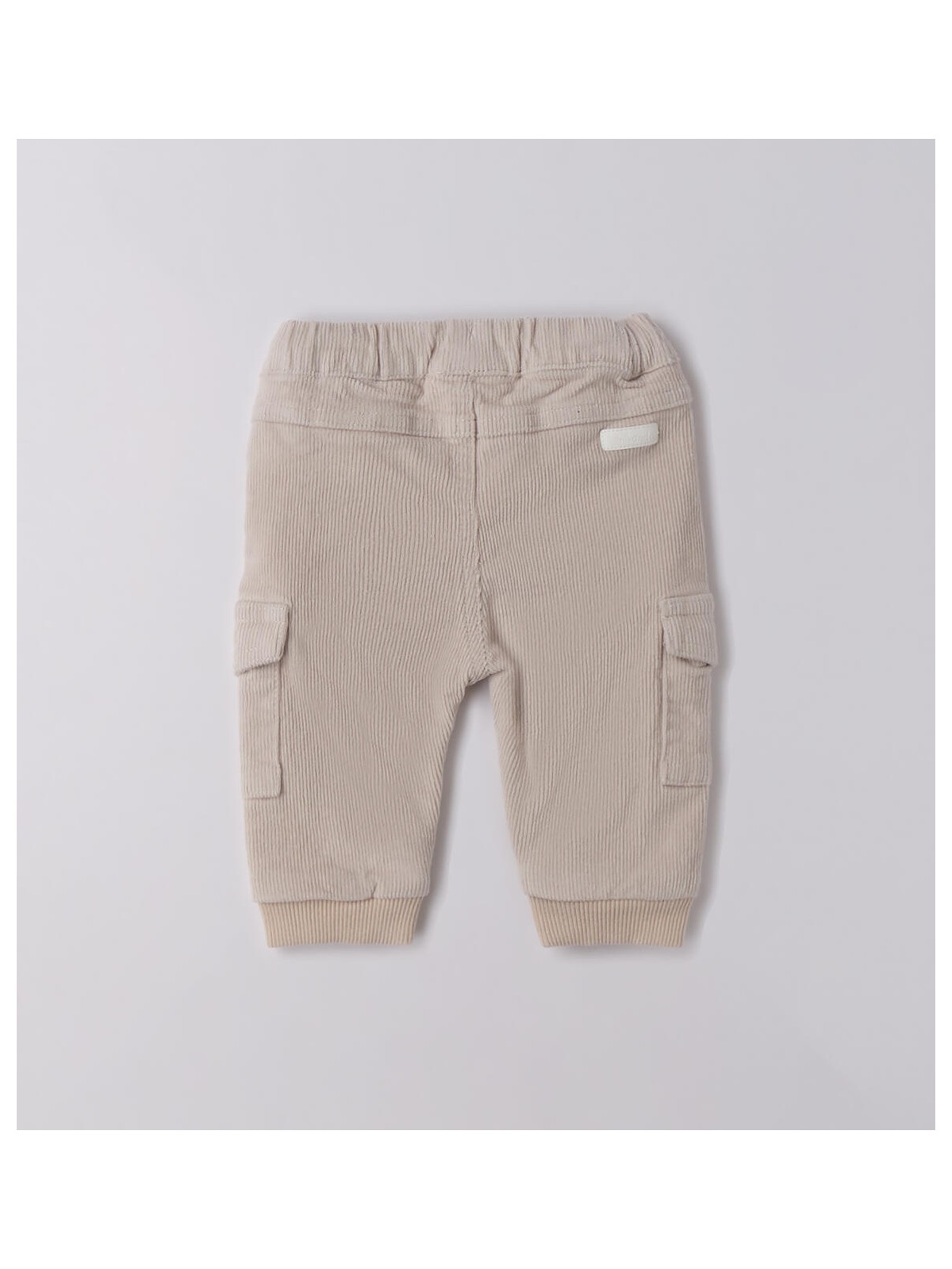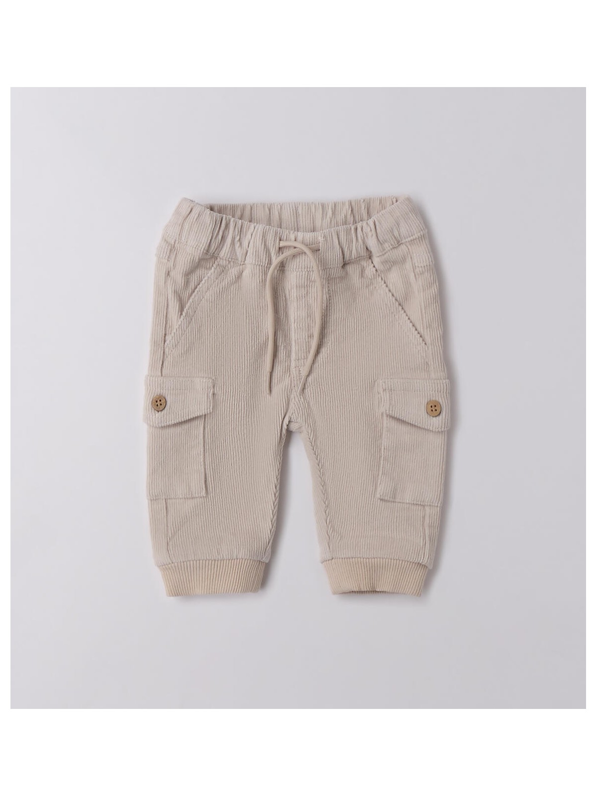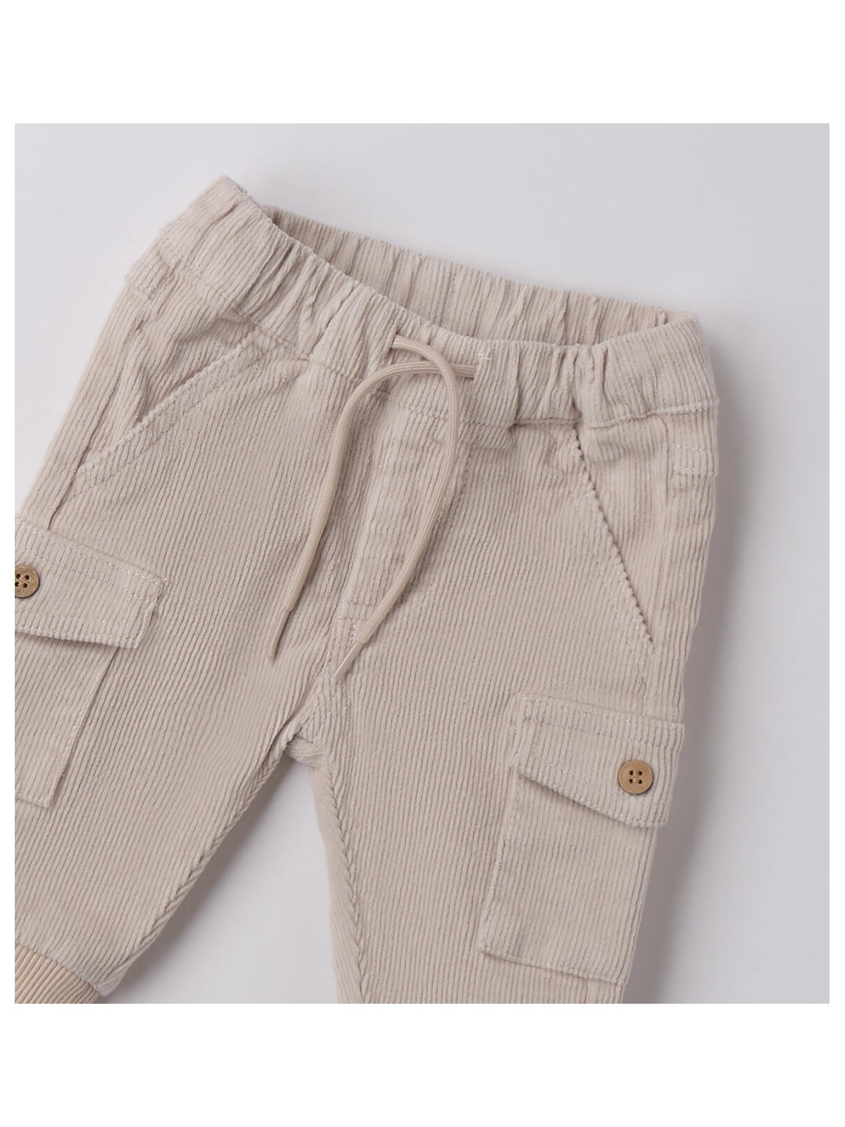 Pantalone per bimbo Minibanda in velluto di cotone stretch. Il modello presenta vita elasticizzata con coulisse e polsini sul fondo. Modello cargo con tasconi laterali.
