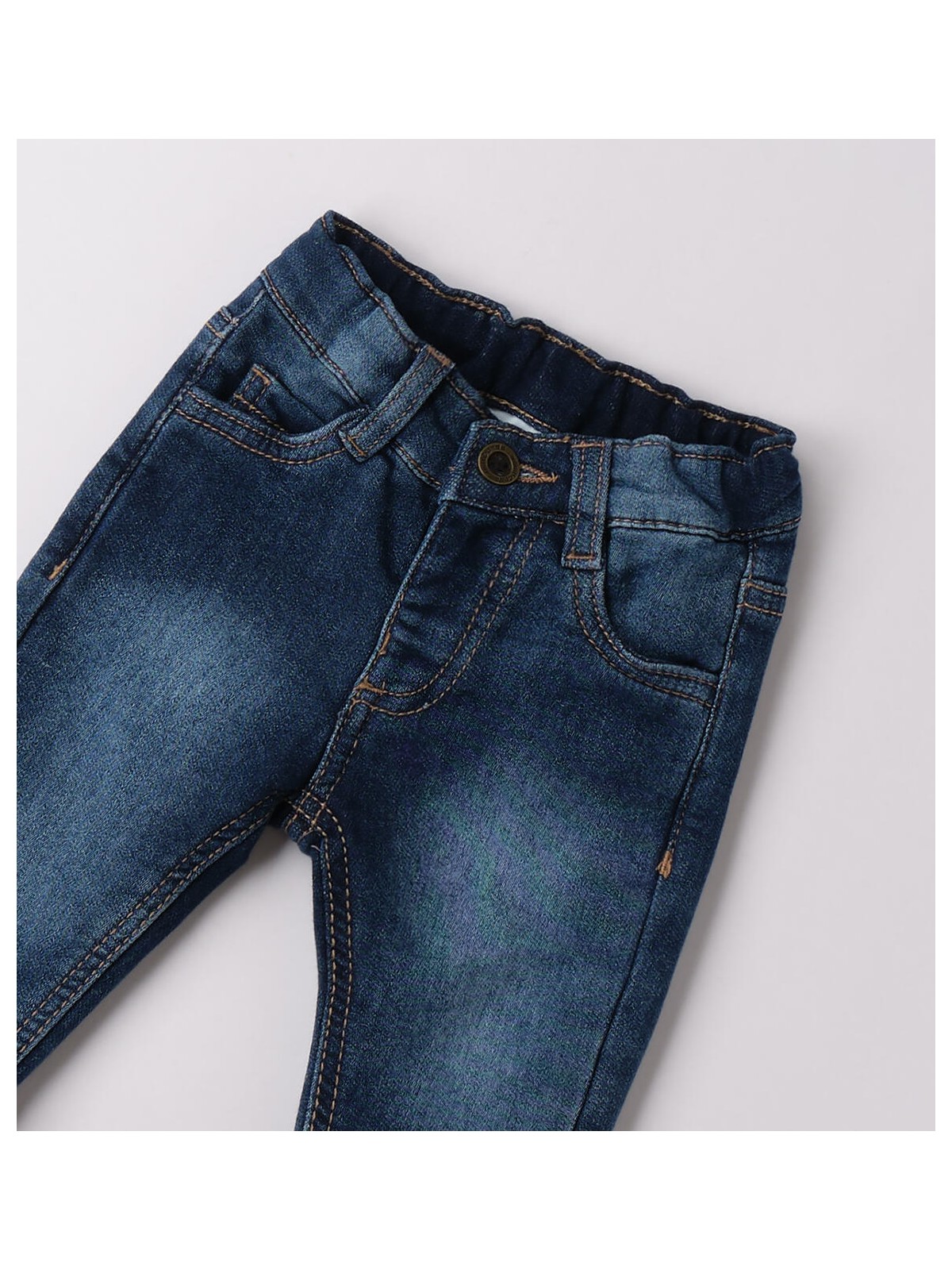 Jeans neonato Minibanda realizzati in denim maglia di cotone stretch. Il modello presenta vita elasticizzata e tasche laterali. Vita regolabile con elastico asolato interno.