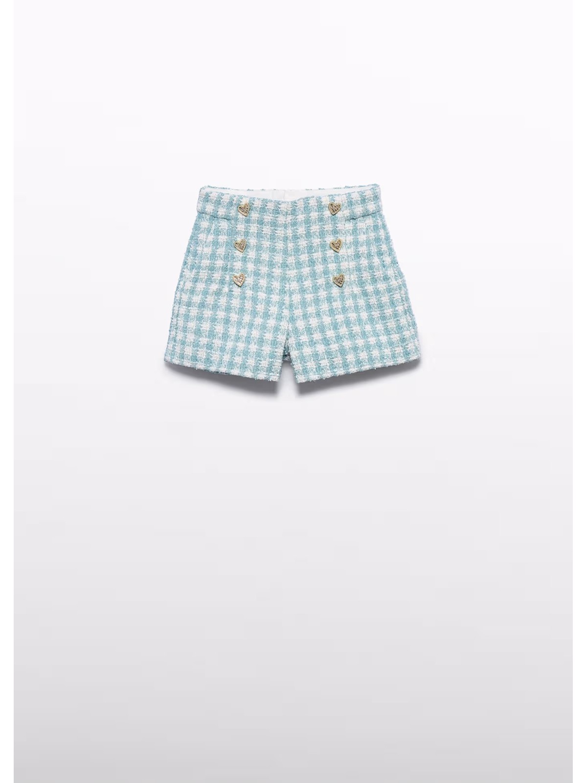 Bermuda lurex a quadri per bambina. apertura con cerniera sul retro e tasche laterali. Bottoni a cuore sulla parte frontale.
