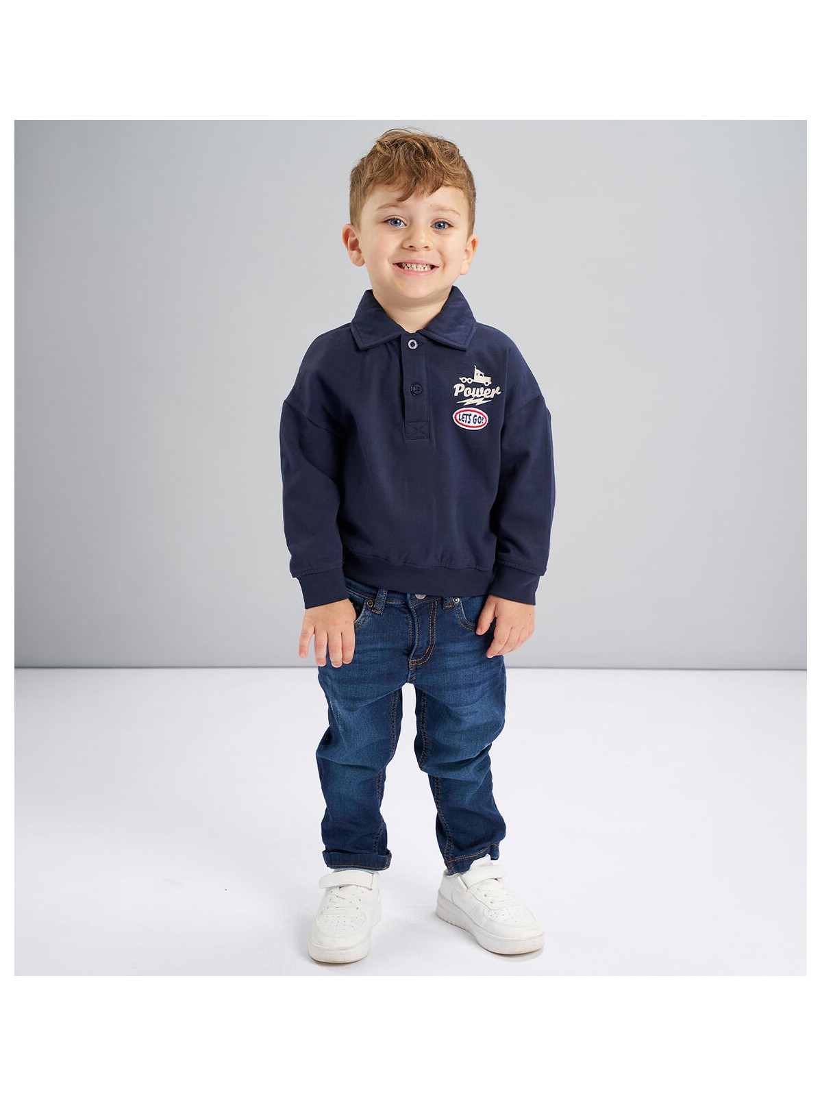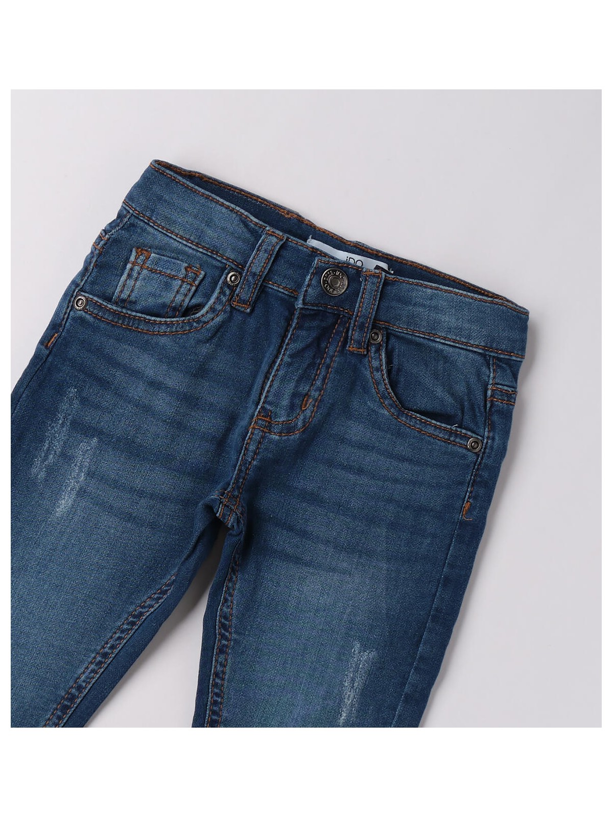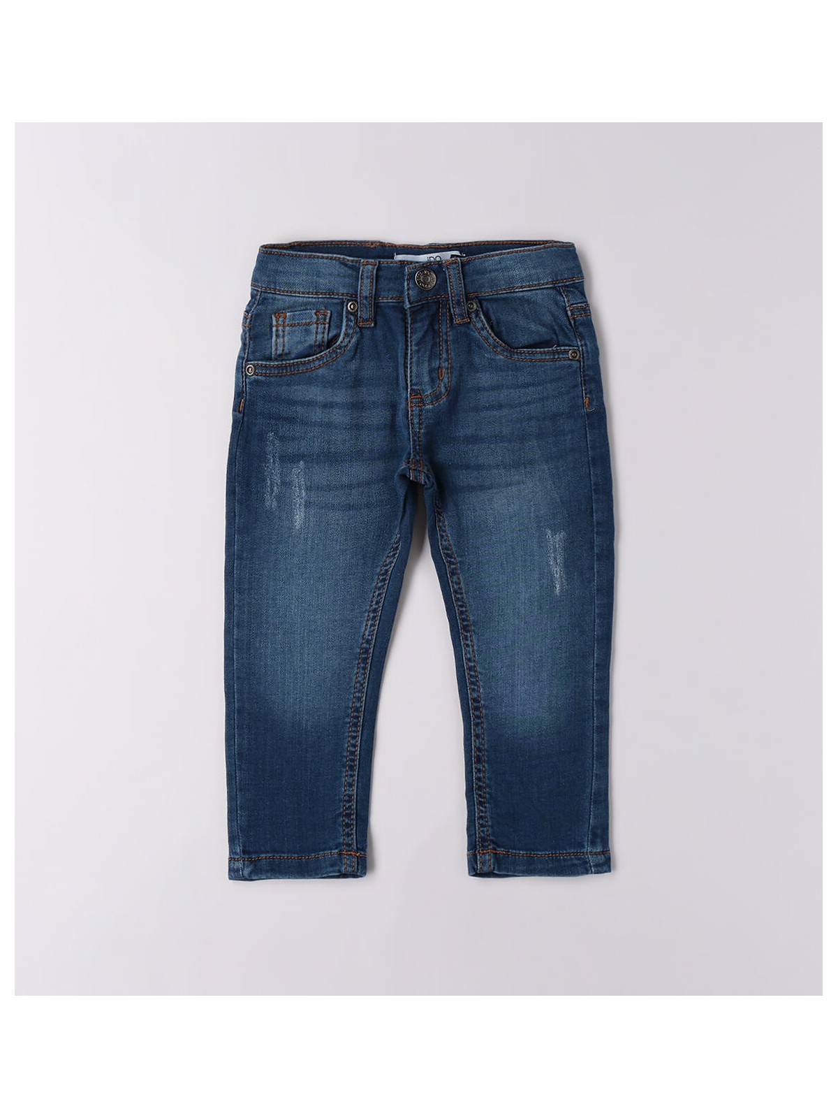 Jeans per bambino realizzato in denim maglia di cotone stretch con scalfitture. Il modello presenta apertura con bottone e zip, vestibilità regular. Vita regolabile con elastico asolato interno.