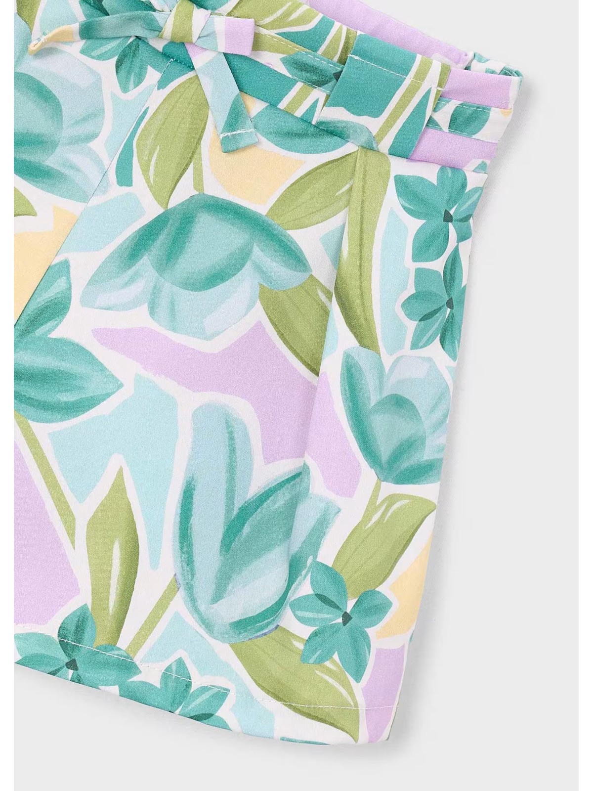 Shorts da bambina fantasia floreale realizzata in canvas. Il modello presenta vita regolabile con elastico asolato interno