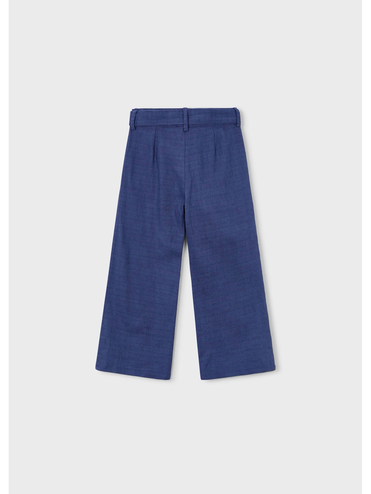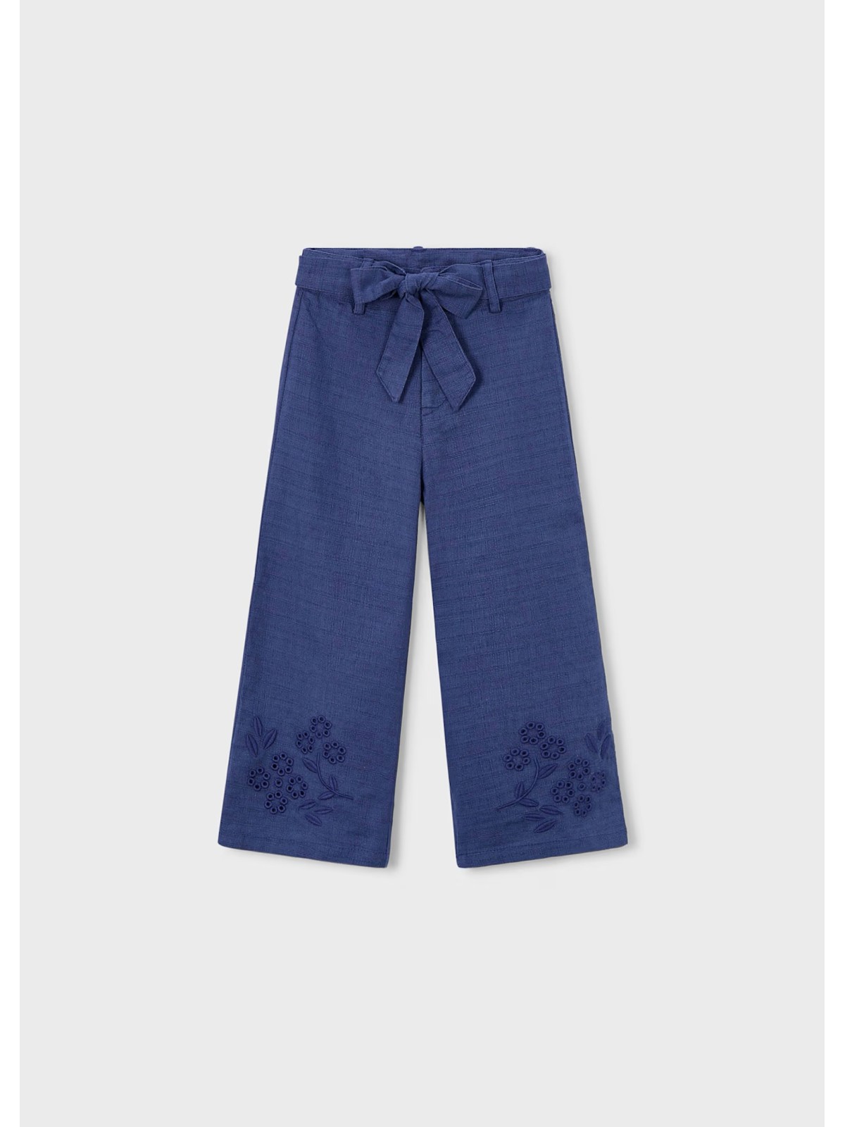 Pantaloni da bambina realizzati in misto lino. Il modello presenta apertura con bottone e zip, e cintura in vita abbinata. Modello con gamba ampia e ricamo sul fondo. Vita regolabile con elastico asolato interno