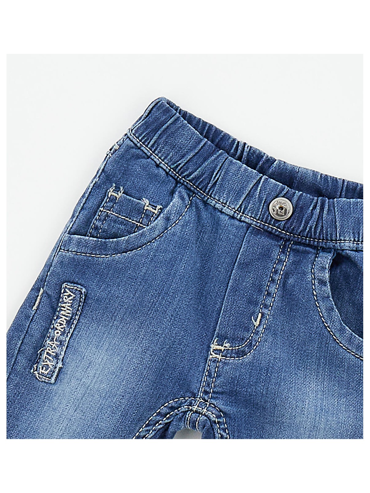 Jeans per bimbo realizzato in denim di cotone morbidissimo. Vita regolabile con elastico asolato interno