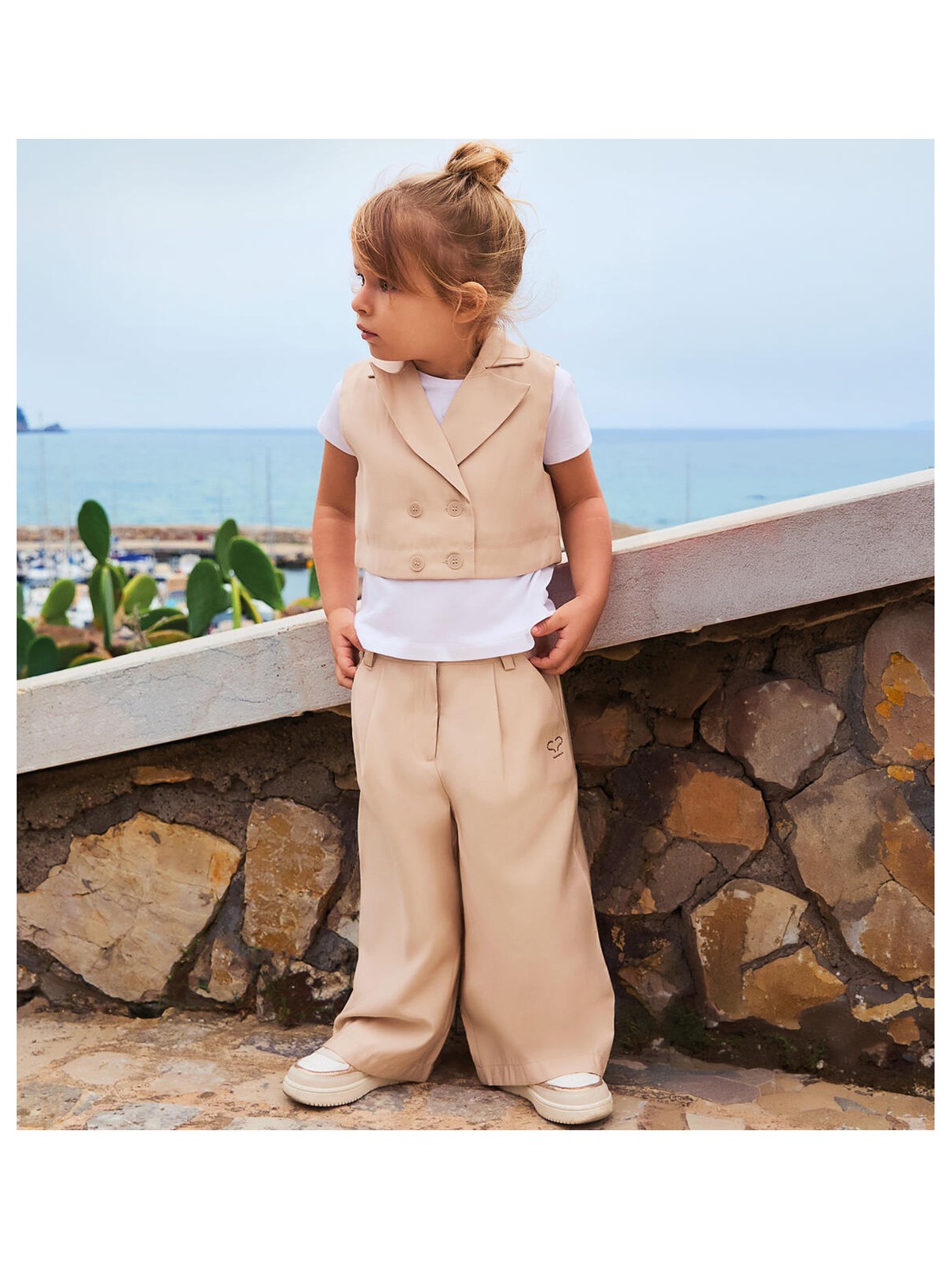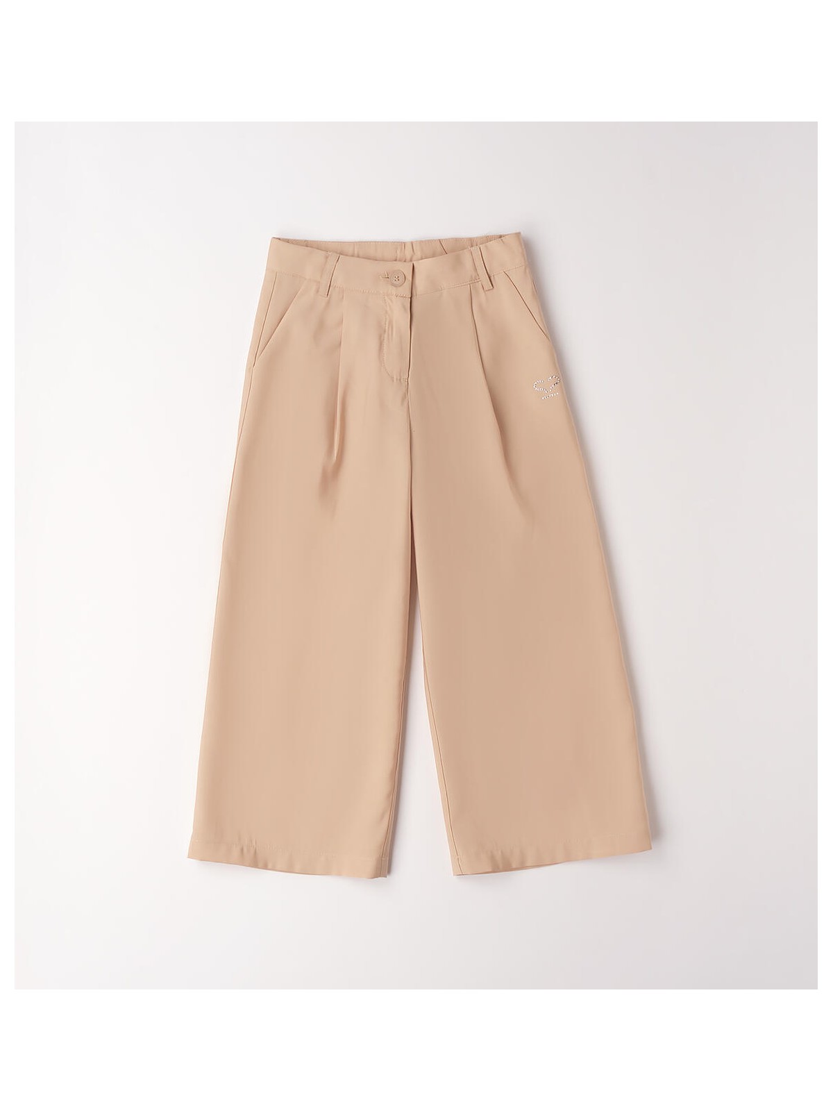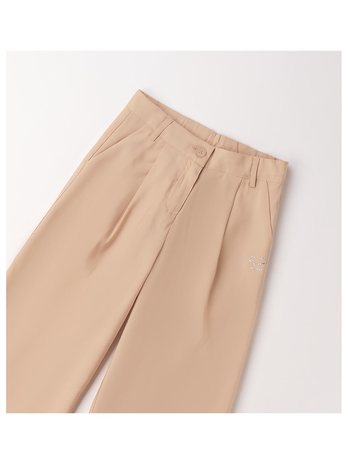 Pantalone lungo per bambina Sarabanda realizzato in taffeta con logo di strass. Modello ampio con apertura tramite zip e bottone. Vita regolabile con elastico asolato interno