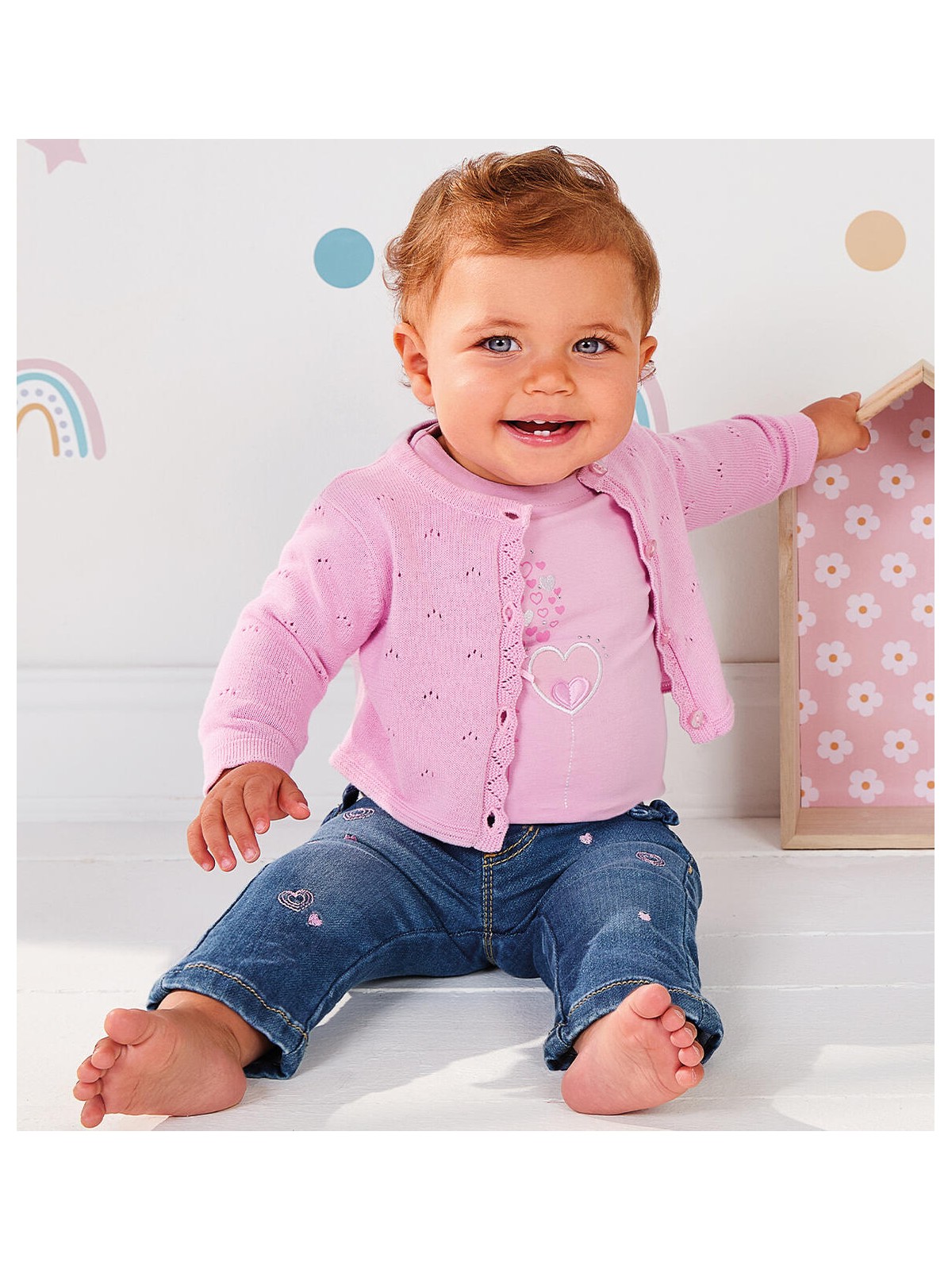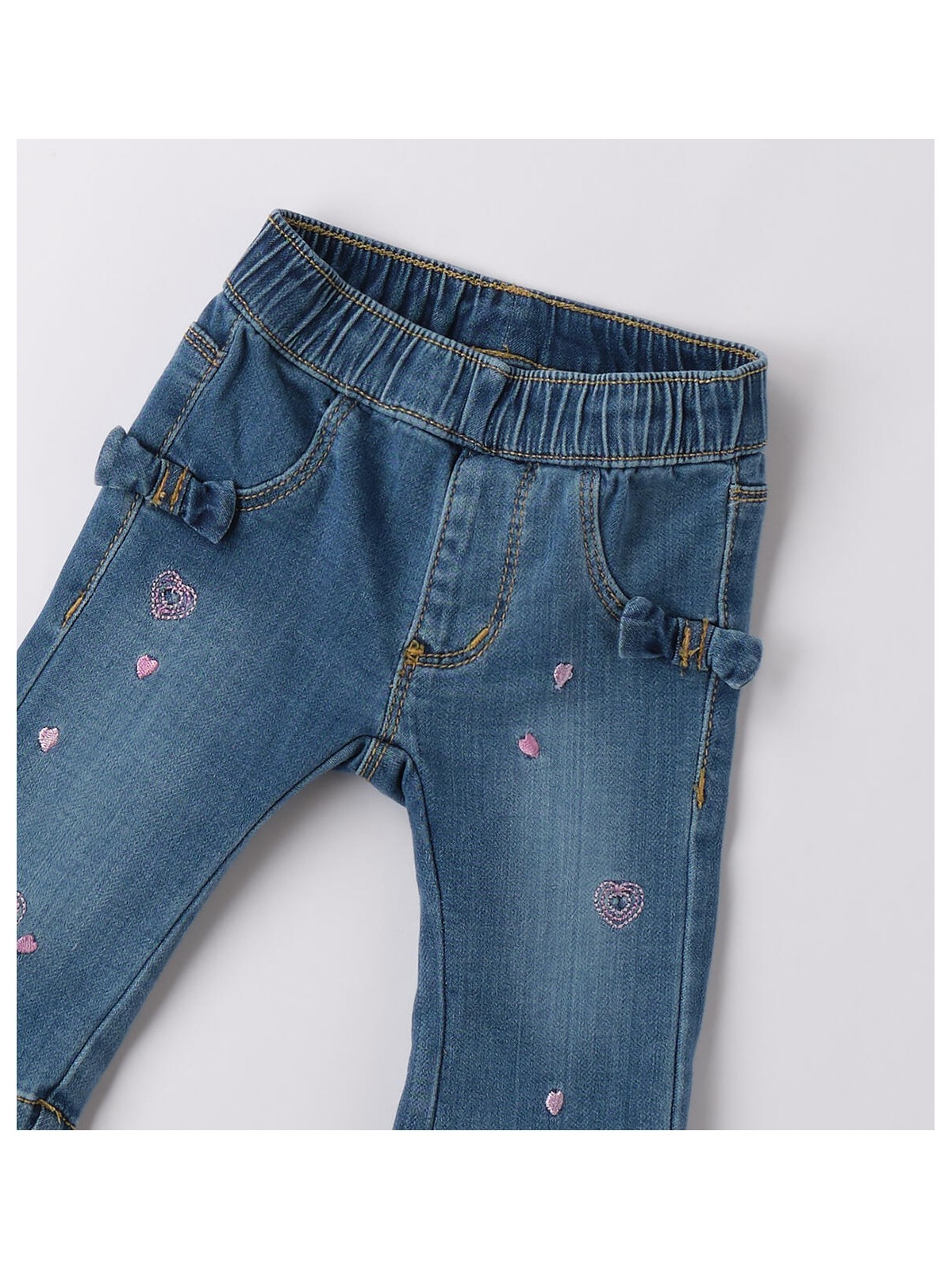 Jeans neonata in tessuto denim maglia di cotone elasticizzato. Il modello ha vita elasticizzata e tasche laterali con fiocchi. Modello a zampa arricchito da ricami.