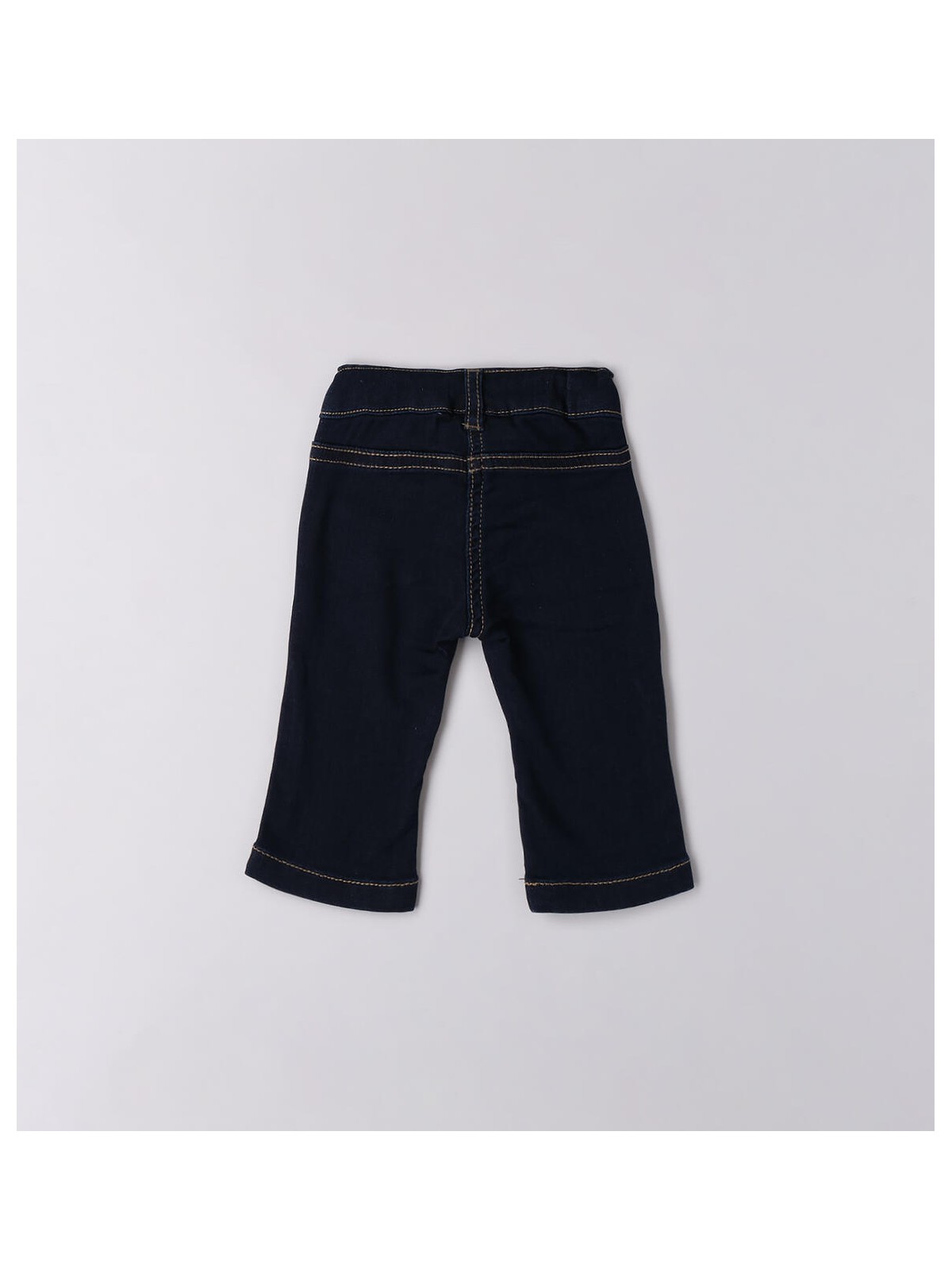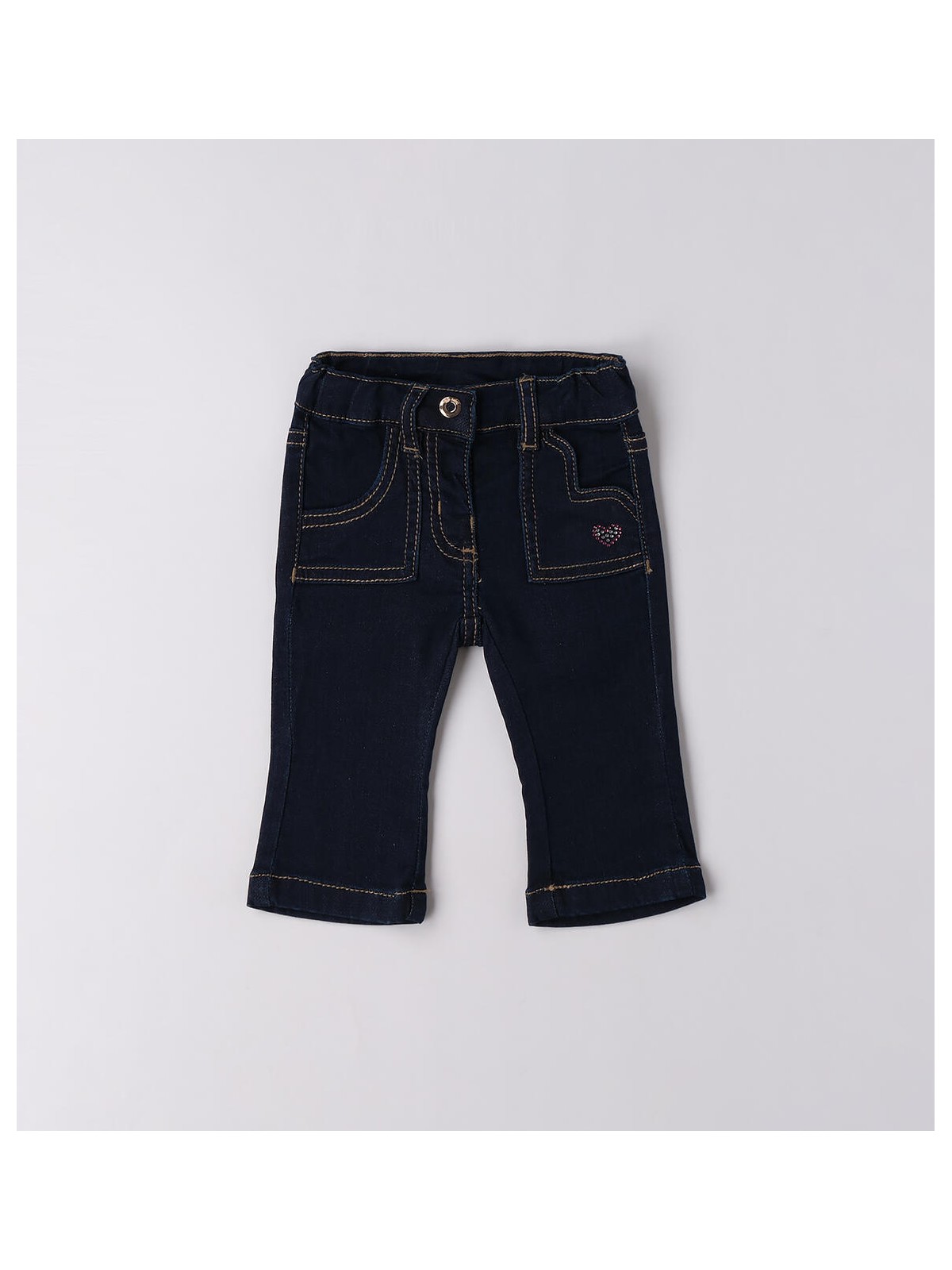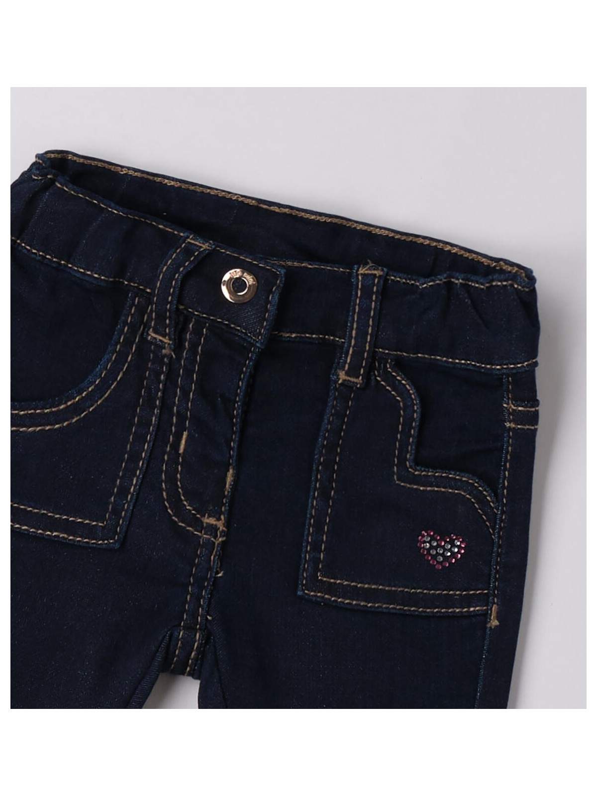 Jeans per bimba realizzati in denim maglia di cotone stretch. Il modello presenta vita regolabile con elastico asolato interno e gamba ampia a zampa.