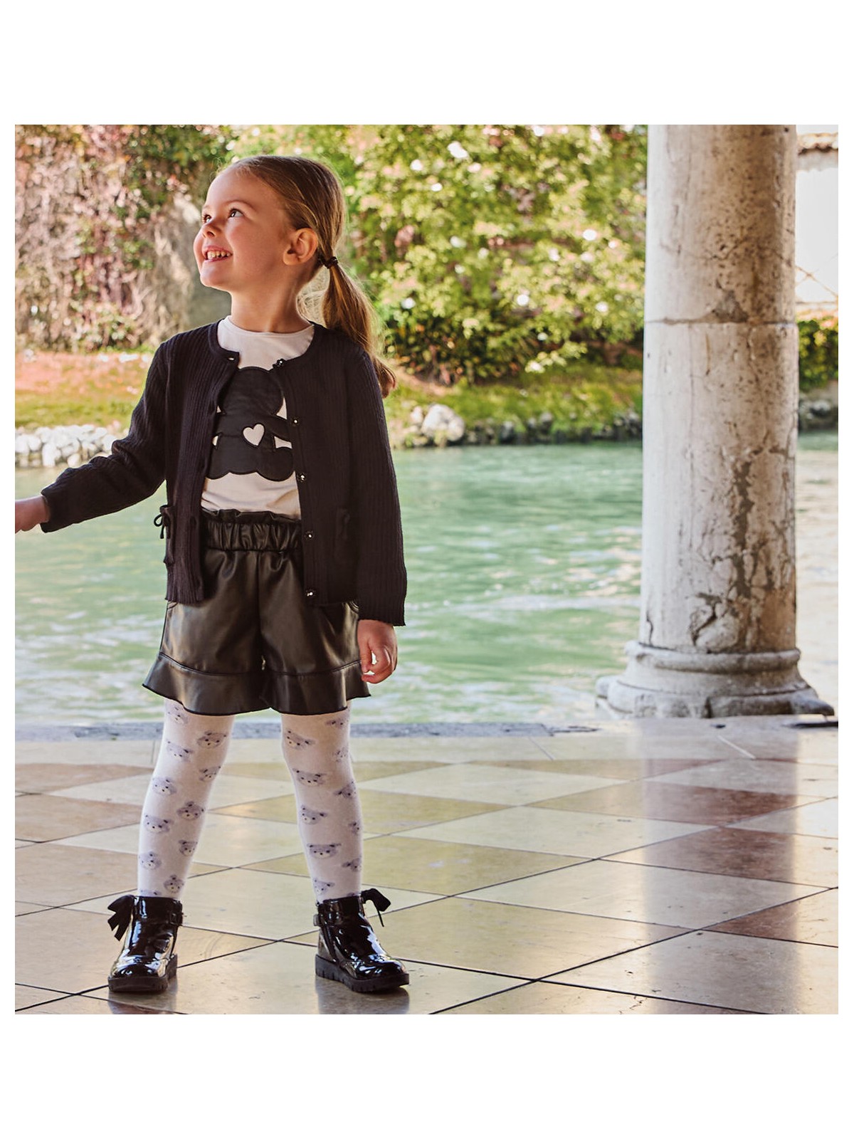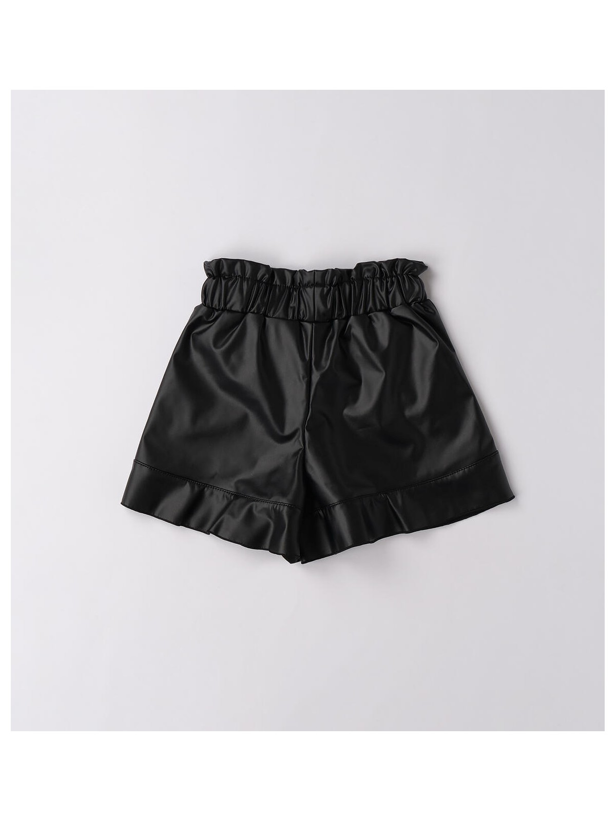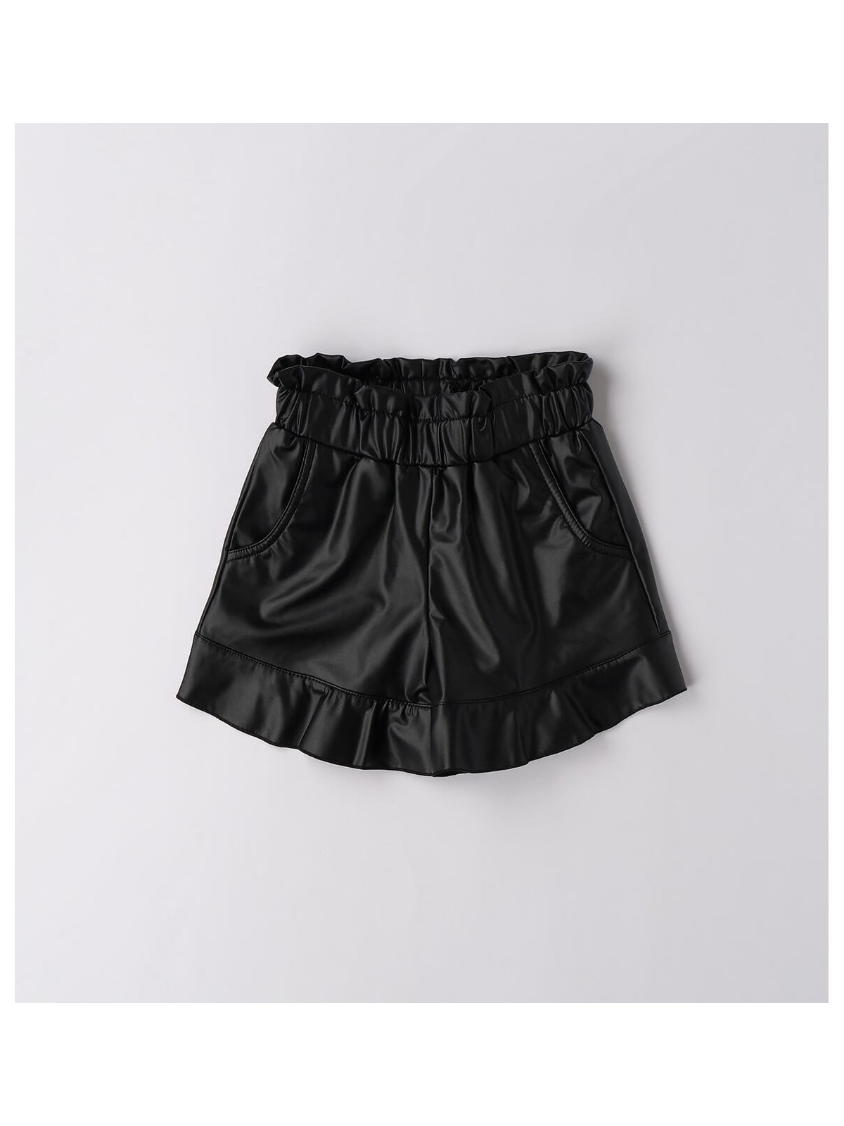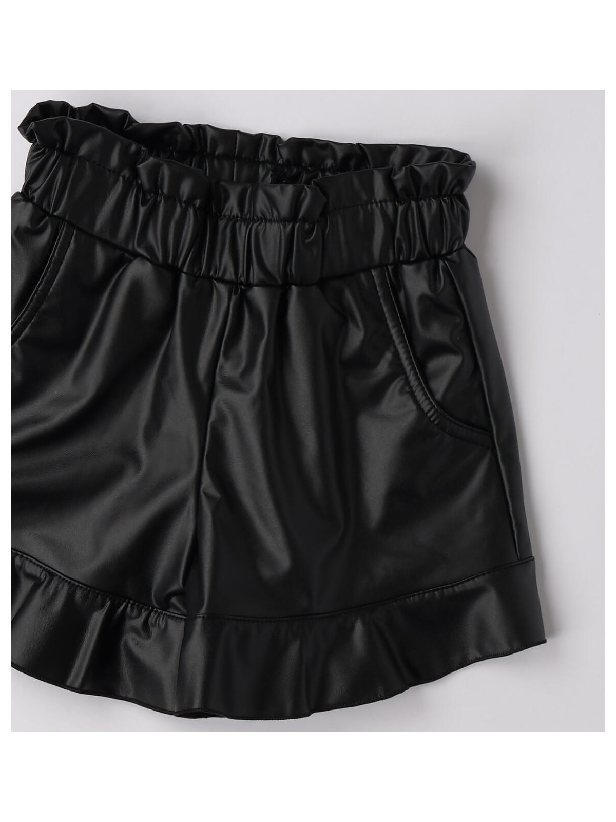 Shorts per bambina realizzati in tessuto spalmato stretch. Modello con tasche laterali e vita arricciata. Il prodotto non contiene materiali di derivazione animale.