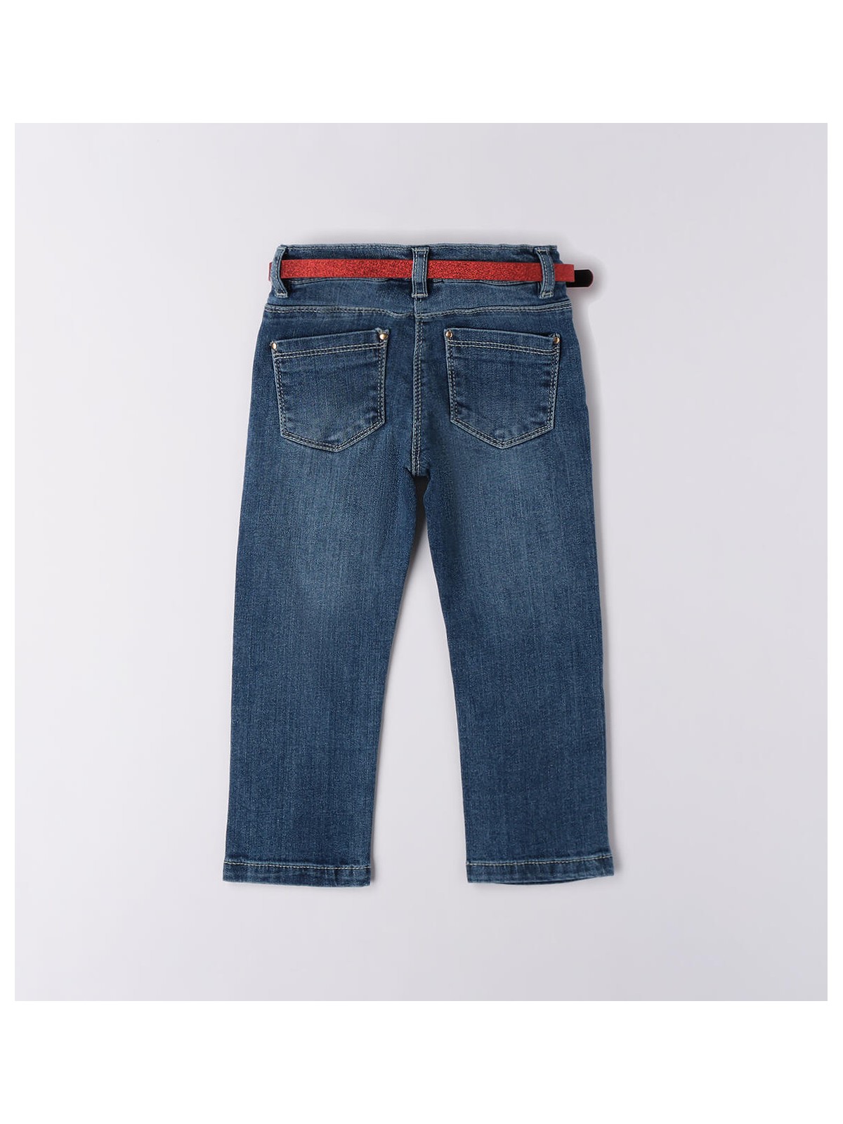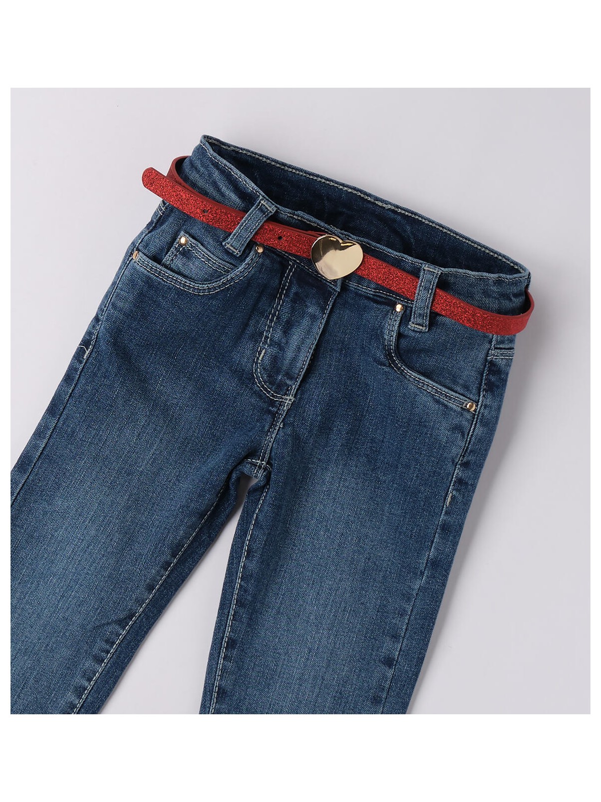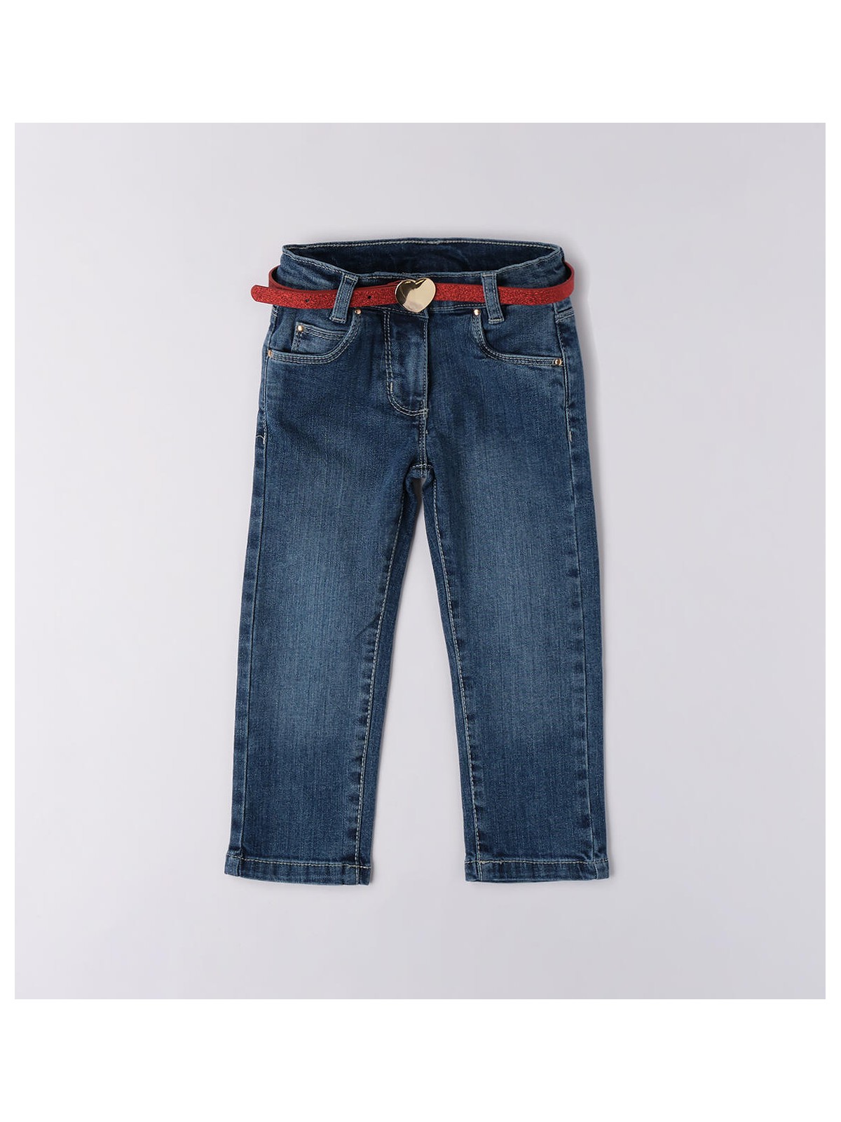 Jeans per bambina realizzati in denim stretch di cotone. Apertura con zip e bottone. Vita regolabile con elastico asolato interno. Cintura in abbinamento.