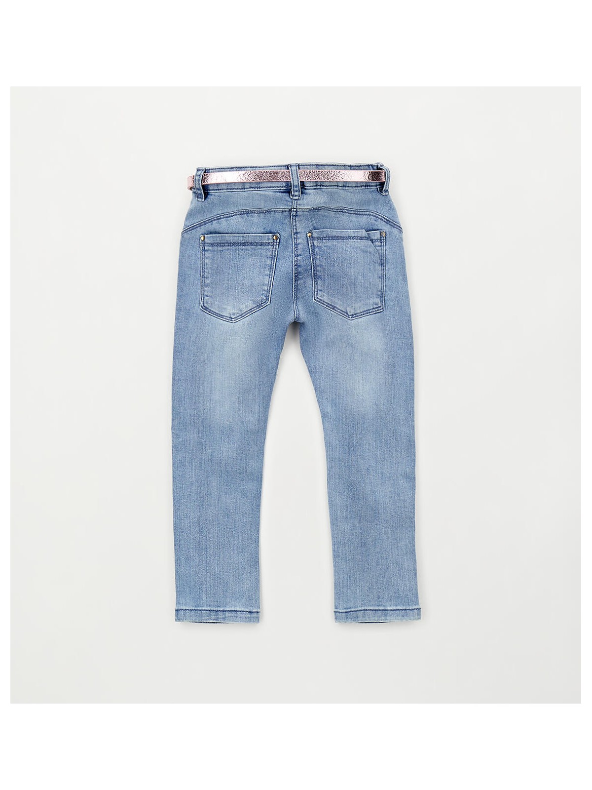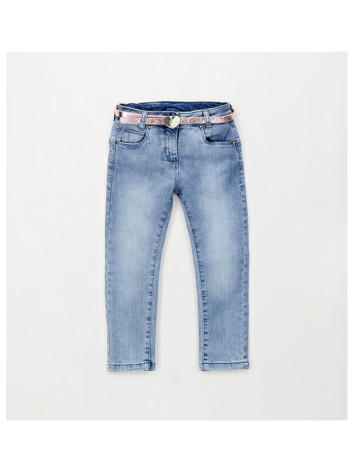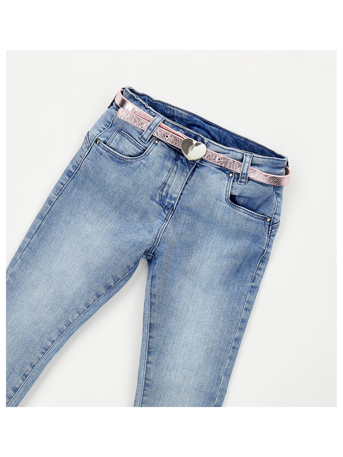 Pantalone lungo in denim stretch di cotone per bambina iDO, modello slim. Apertura con zip e bottone. Vita regolabile con elastico asolato interno. Cintura con cuore in abbinamento.