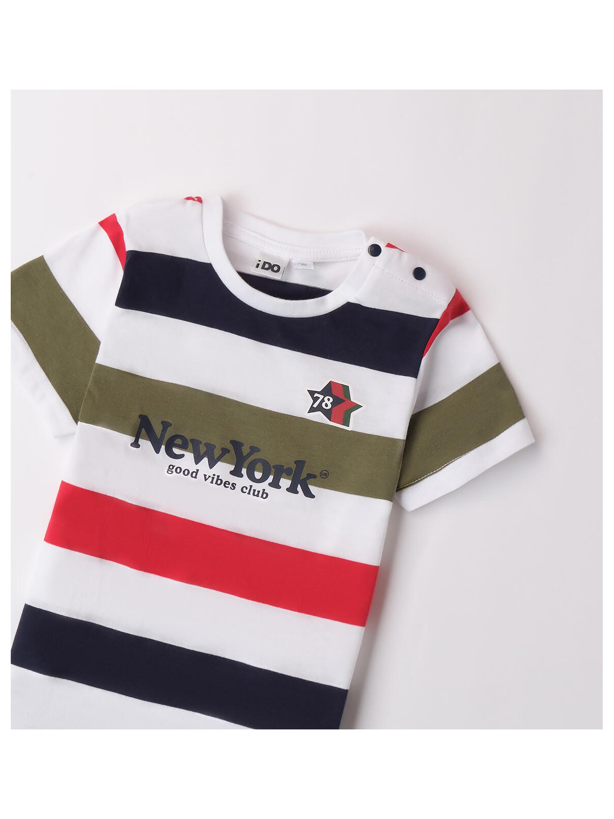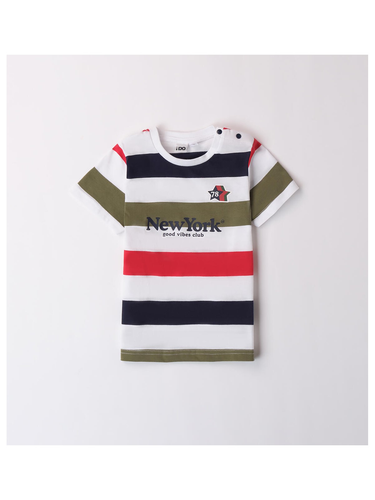 T-shirt per bambino iDO realizzata in jersey 100% cotone, con stampa frontale. Apertura sulla spalla con bottoni a pressione fino alla taglia 3 anni.