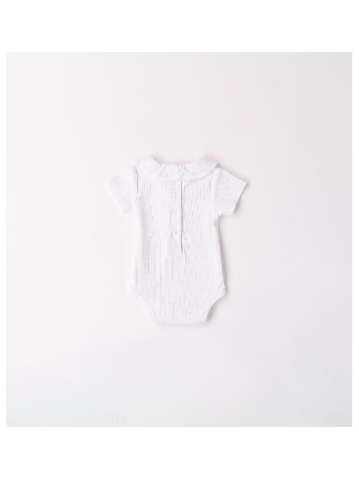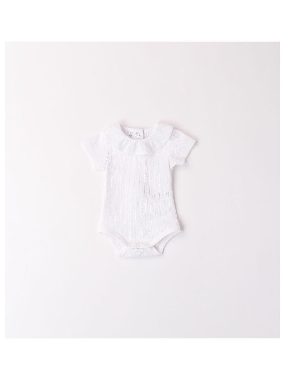Body iDO per bimba a maniche corte realizzato in costina 100% cotone con elegante colletto. Il modello presenta apertura sulla schiena e nell'interno cosce con bottoni a pressione per agevolare la vestibilità.