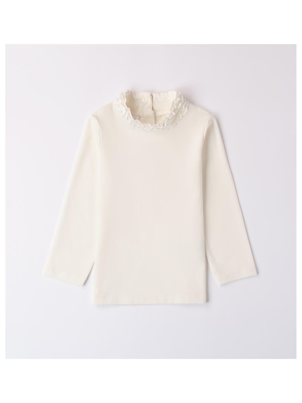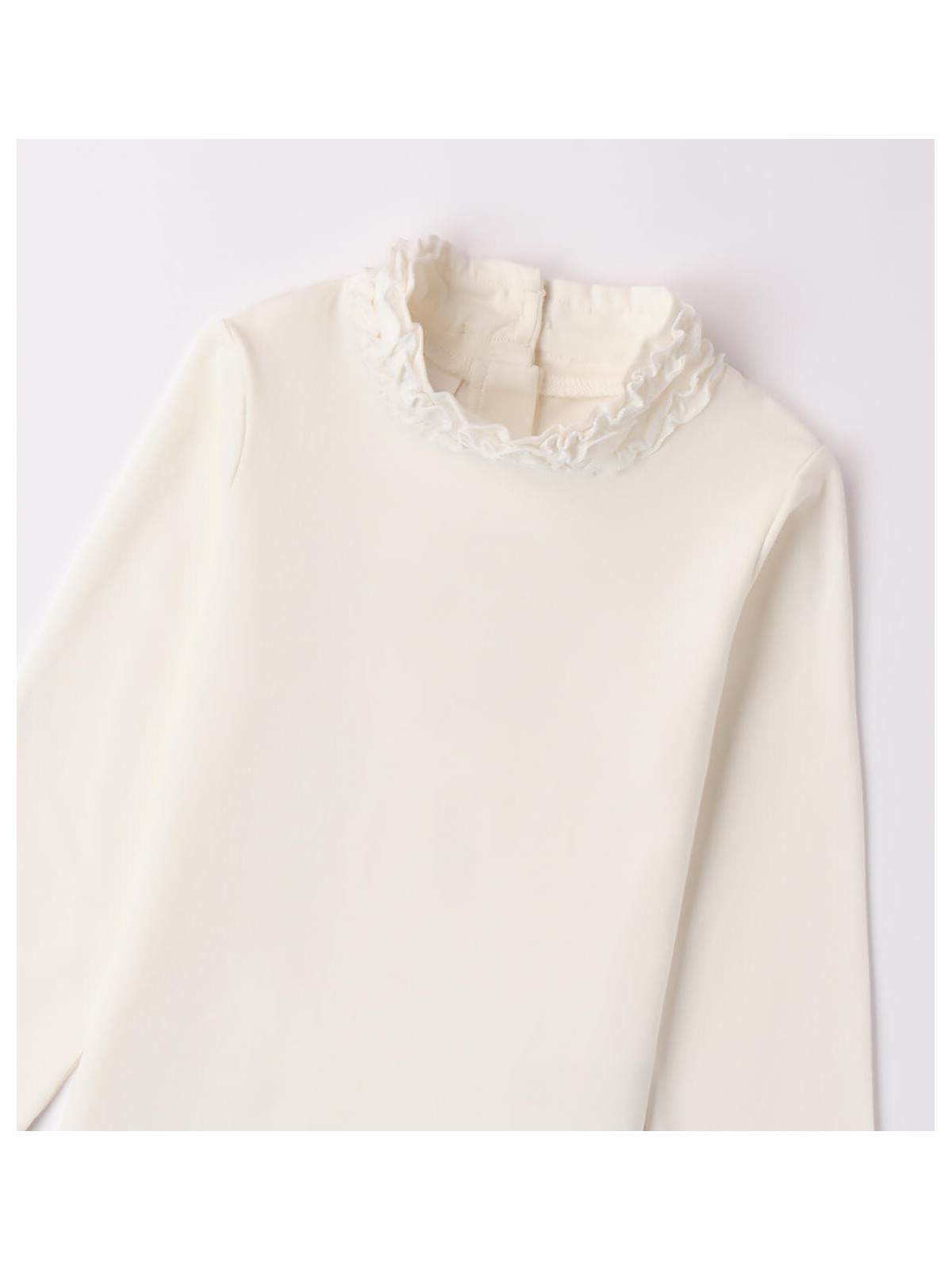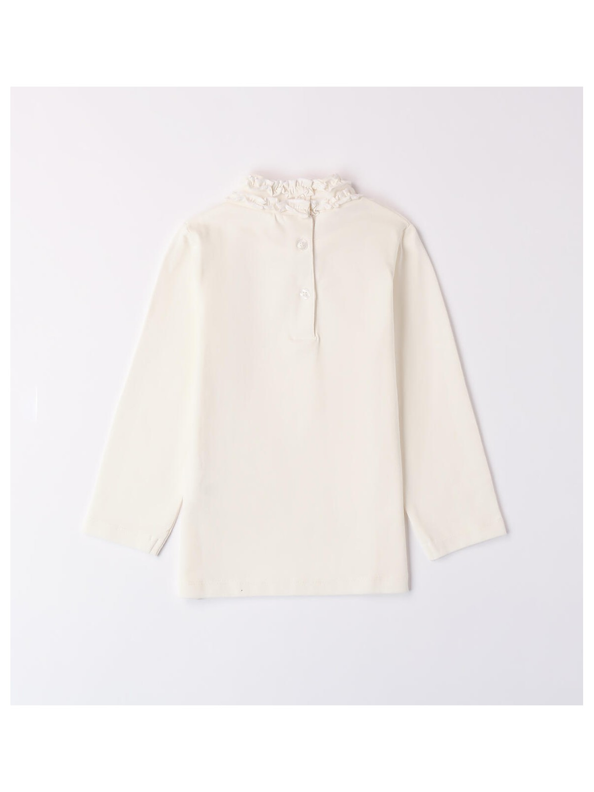 Lupetto avvitato per bambina in jersey stretch di cotone, mano pesca. Modello in fantasia tinta unita e apertura sul retro con bottoni. Colletto con ruches.