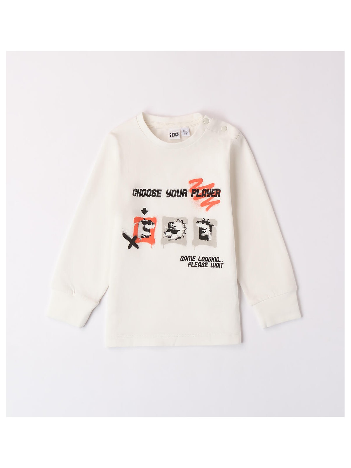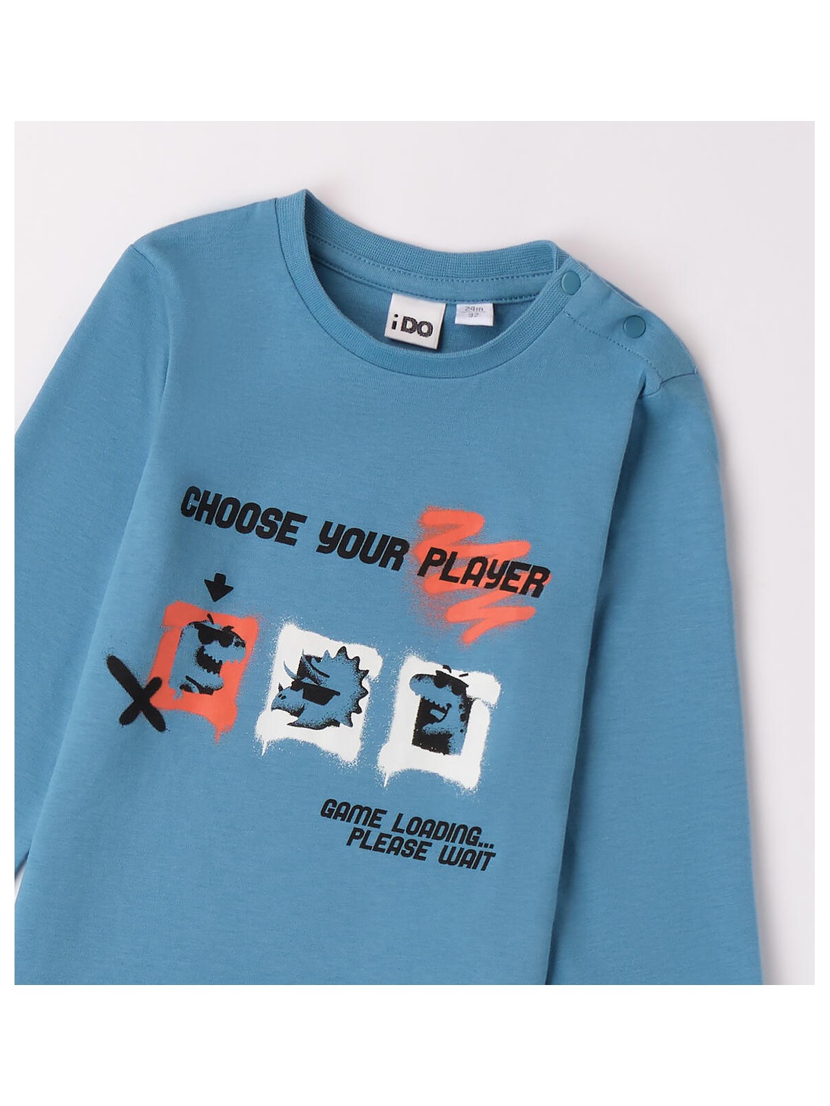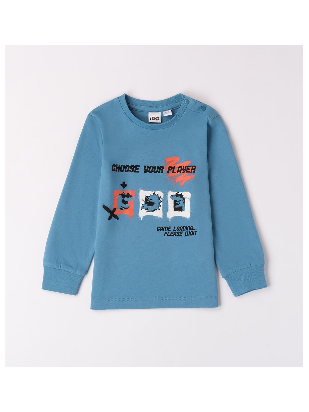 Maglietta per bambino iDO 9 mesi - 8 anni realizzata in jersey 100% cotone, mano pesca. Il modello presenta apertura sulla spalla con bottoni a pressione, fino alla taglia 3 anni, per agevolare il cambio e la vestizione. La maglietta è in fantasia tinta unita con stampa frontale