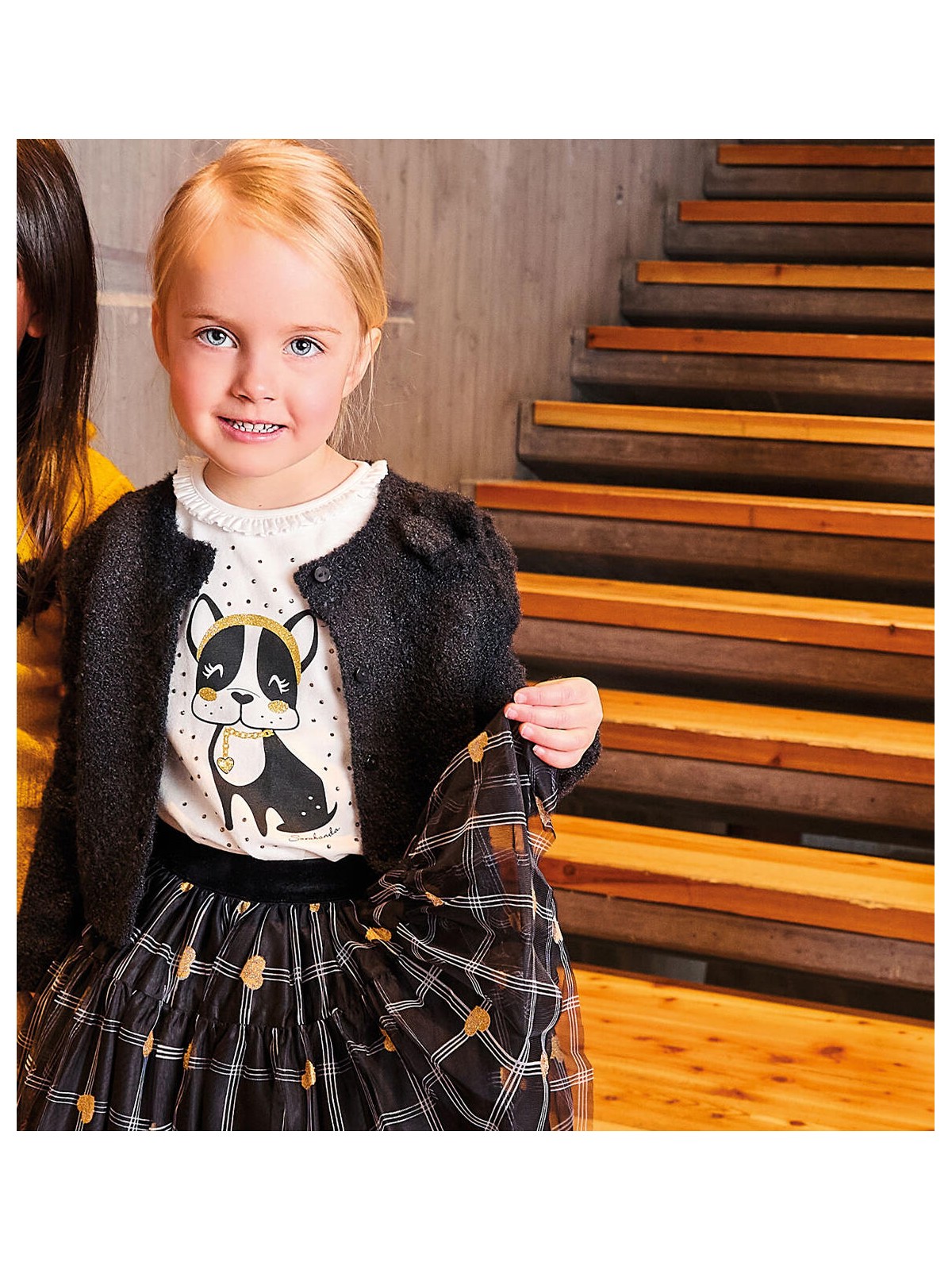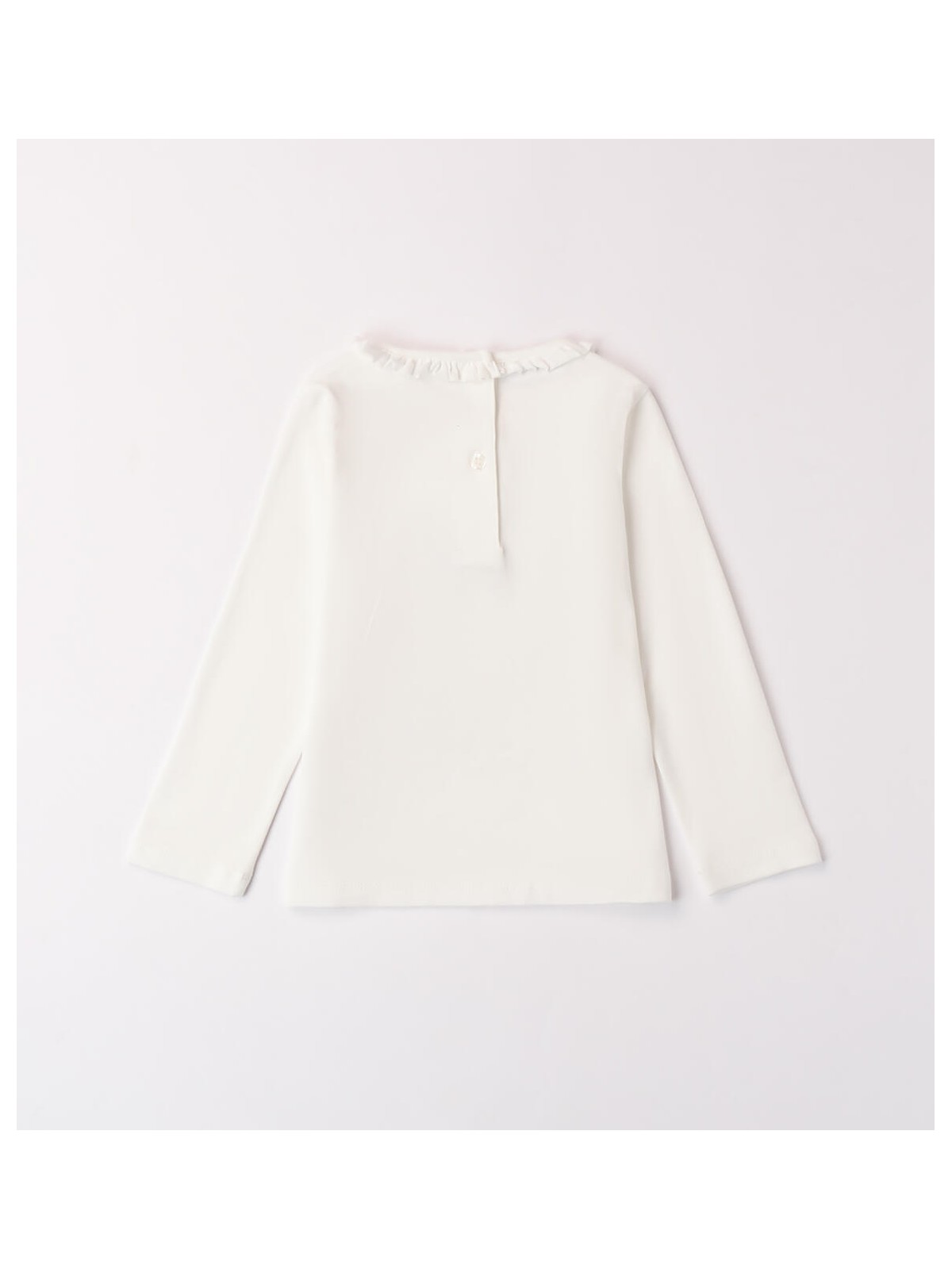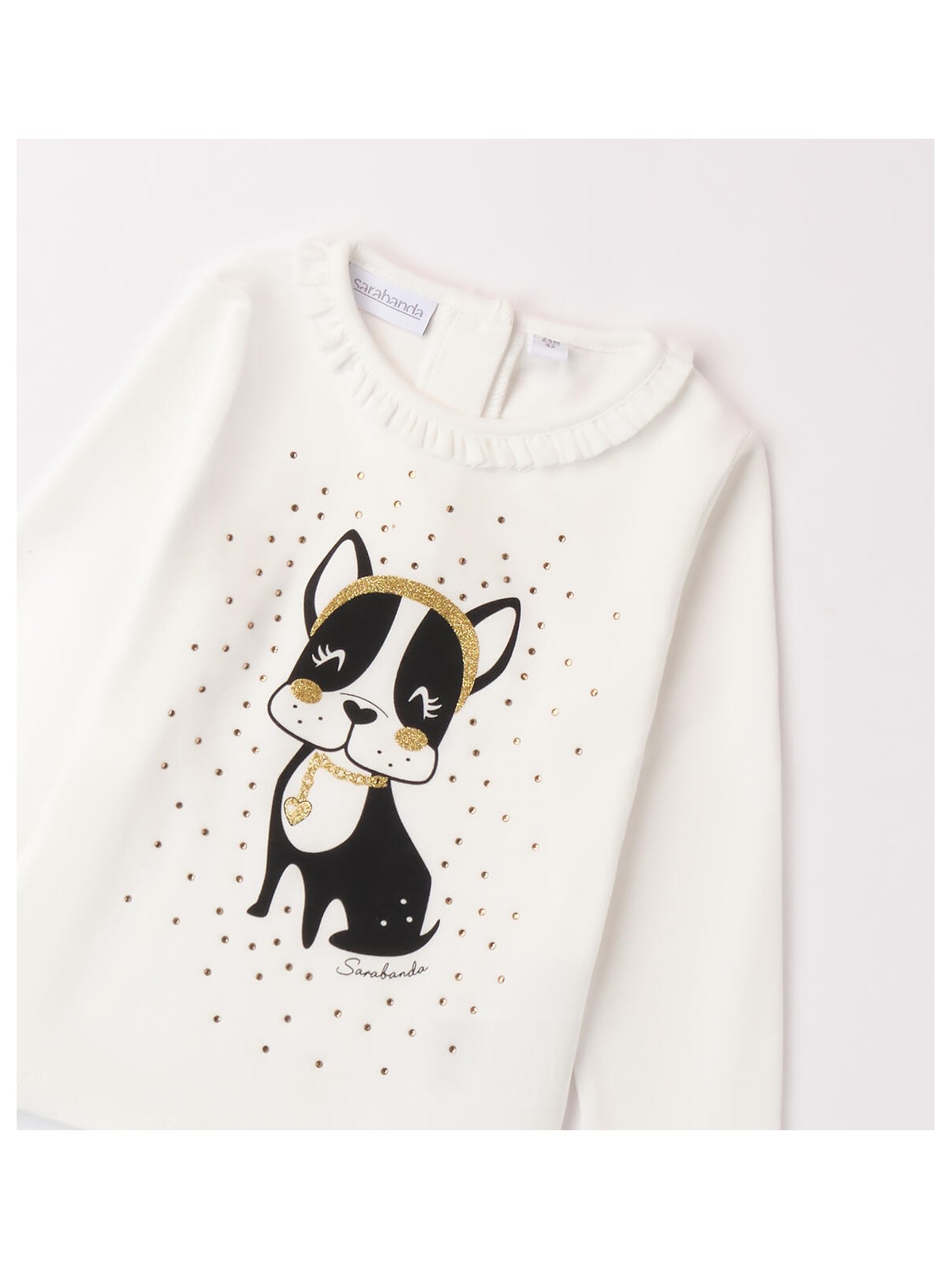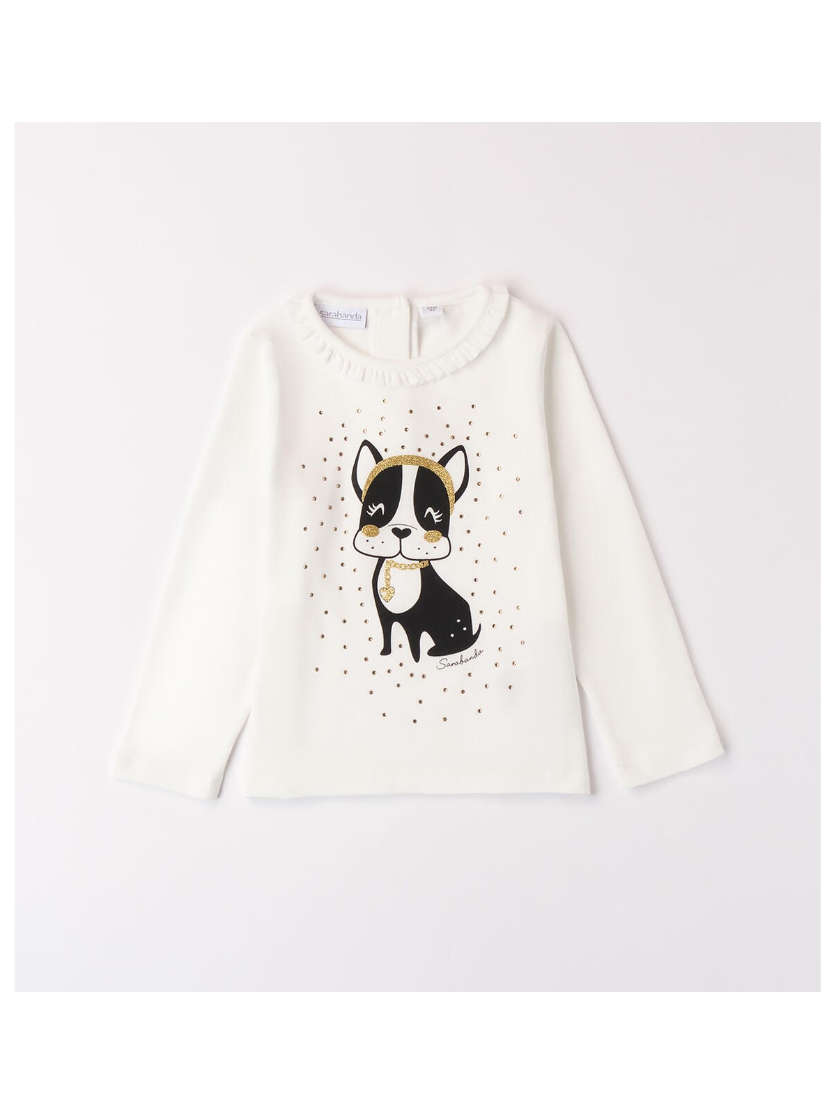 Maglietta per bambina Sarabanda 9 mesi - 8 anni realizzata in jersey stretch di cotone, mano pesca. Il modello presenta apertura sul retro con bottoni. La maglietta è girocollo con ruches sul colletto e stampa frontale cagnolino con strass.