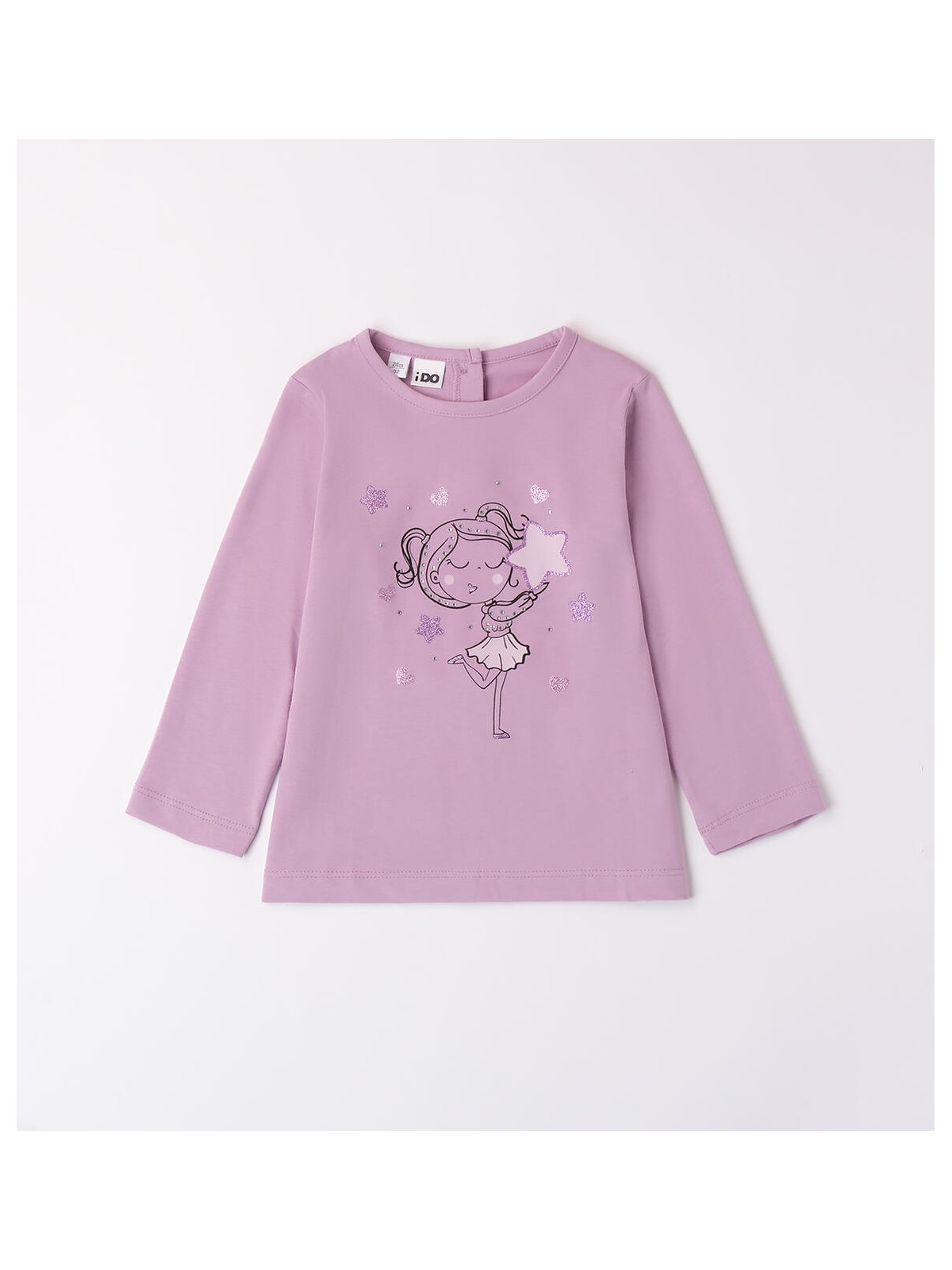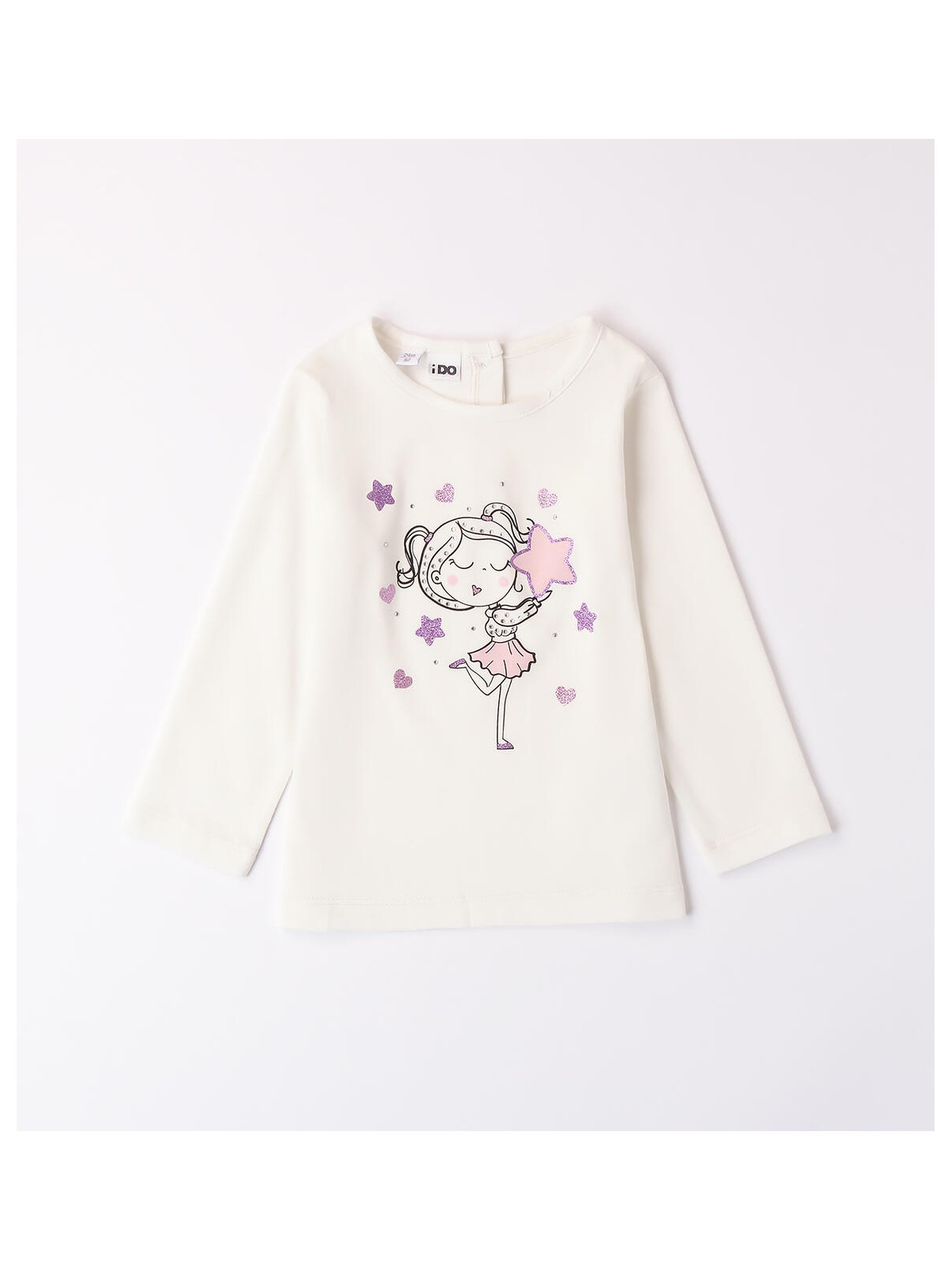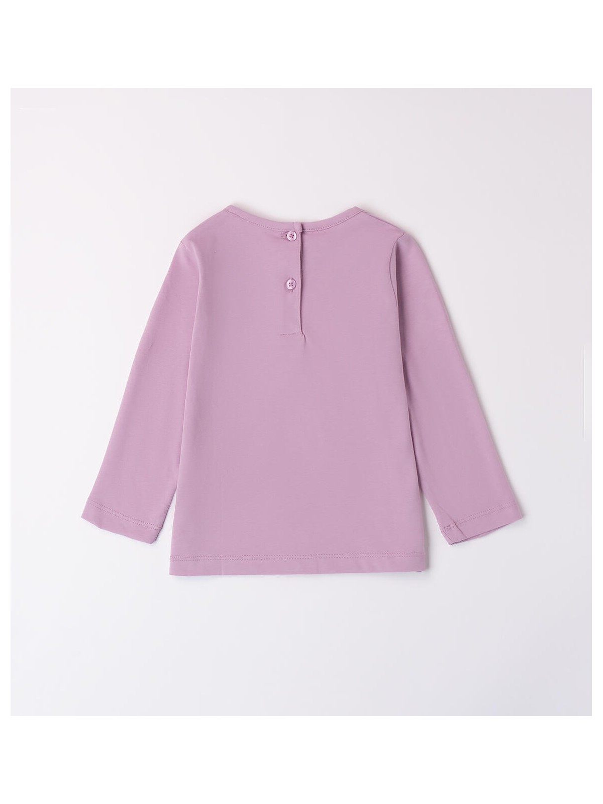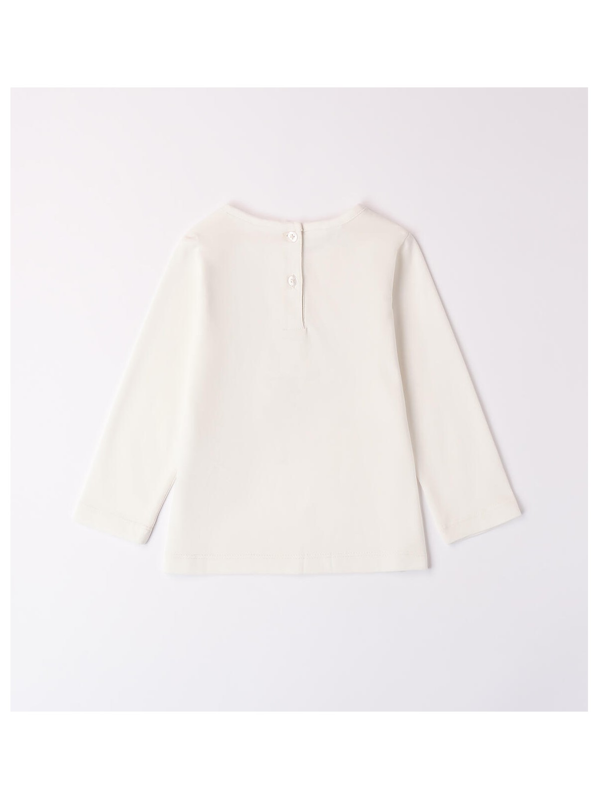 Maglietta per bambina 9 mesi - 8 anni realizzata in jersey 100% cotone, mano calda. Il modello presenta apertura sul retro con bottoni. La maglietta è in fantasia tinta unita con grafica bambina.