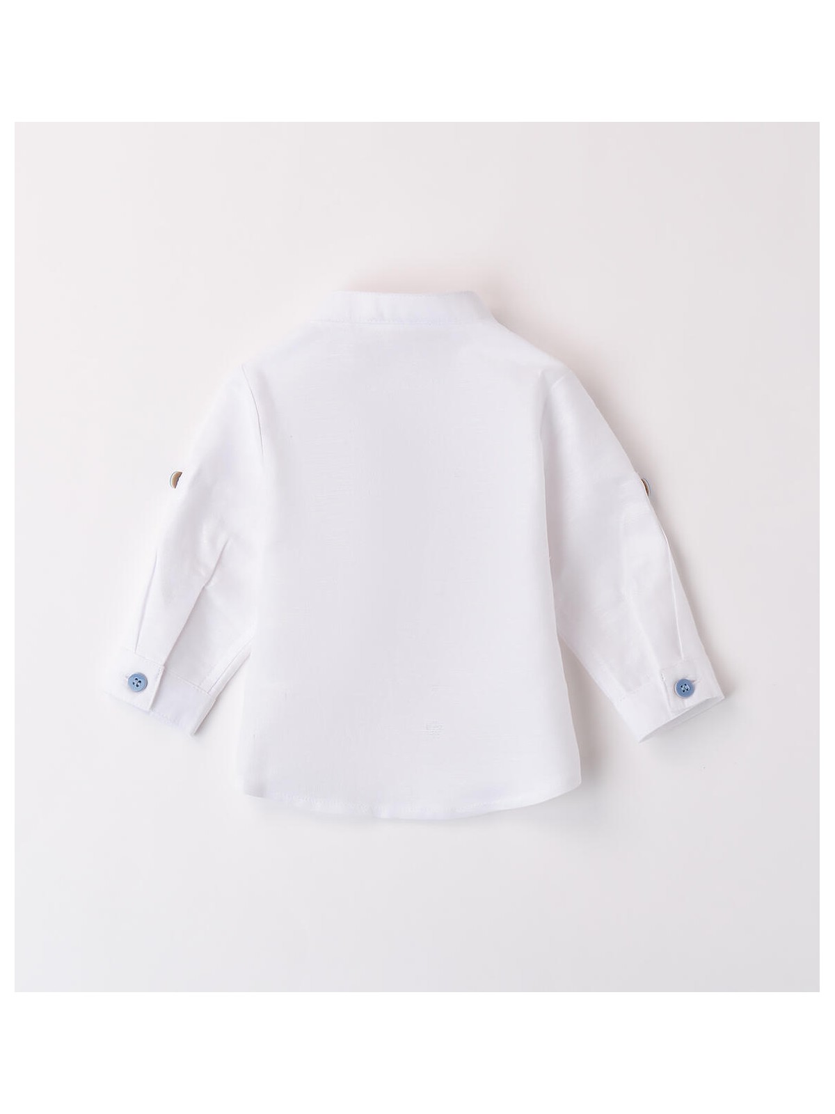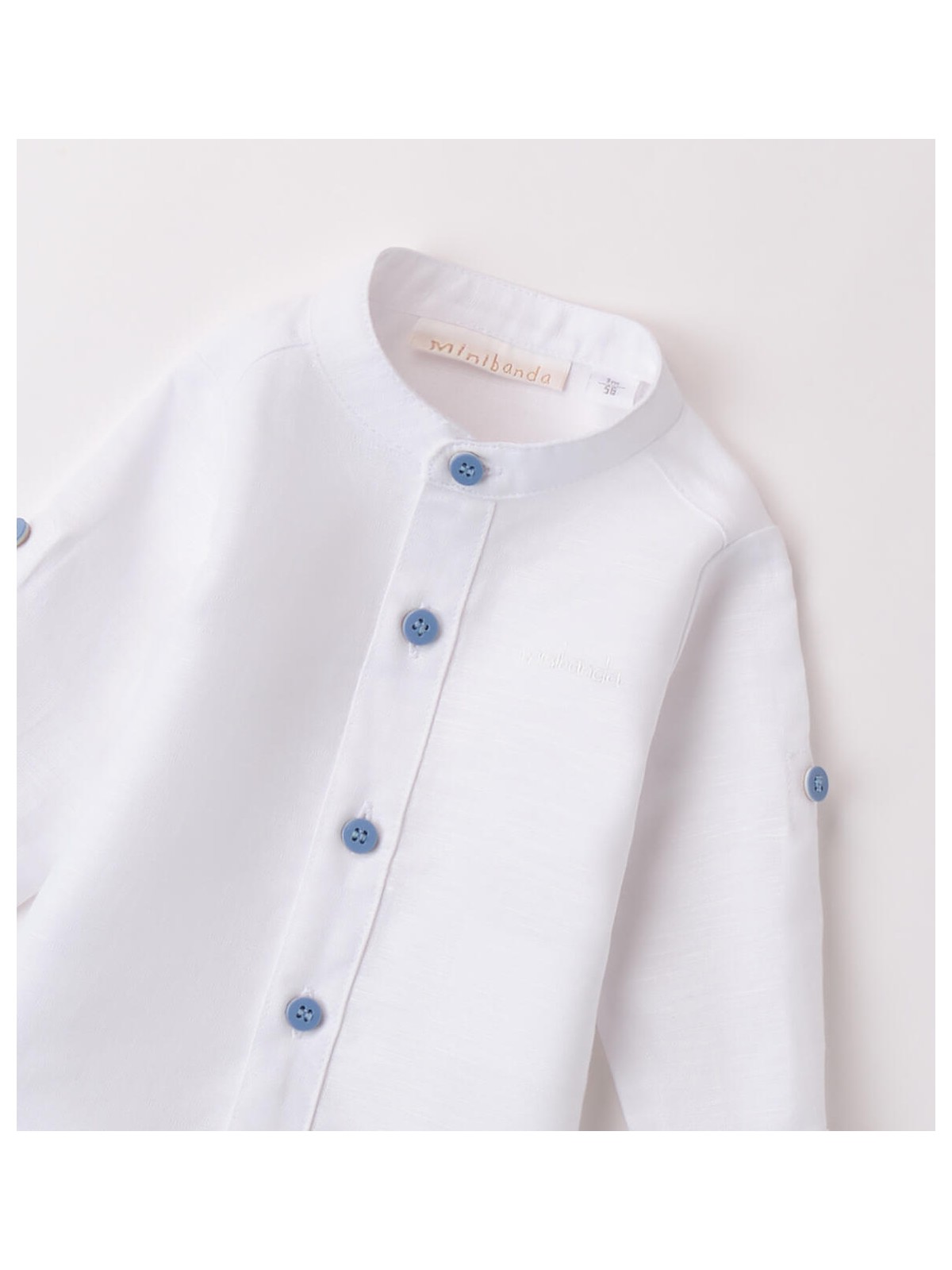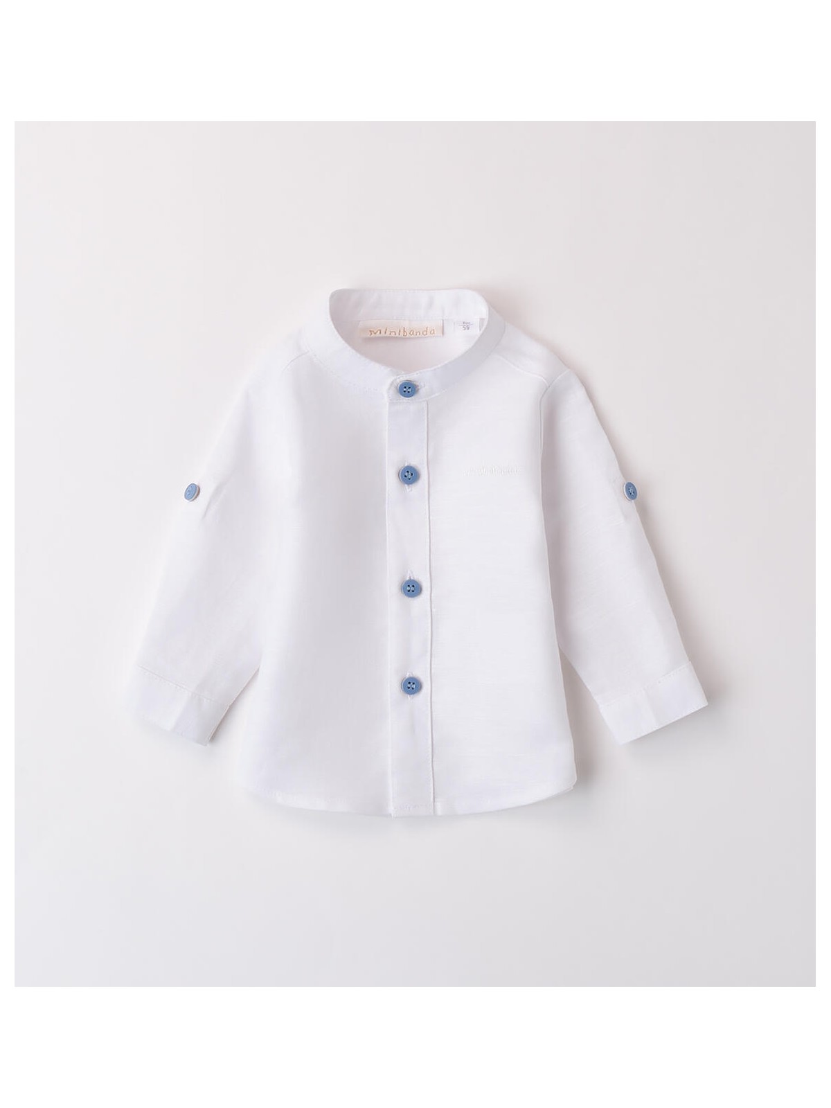 Camicia neonato realizzata in lino e cotone. Il modello presenta apertura frontale con bottoni ed è realizzato in fantasia tinta unita. Colletto alla coreana