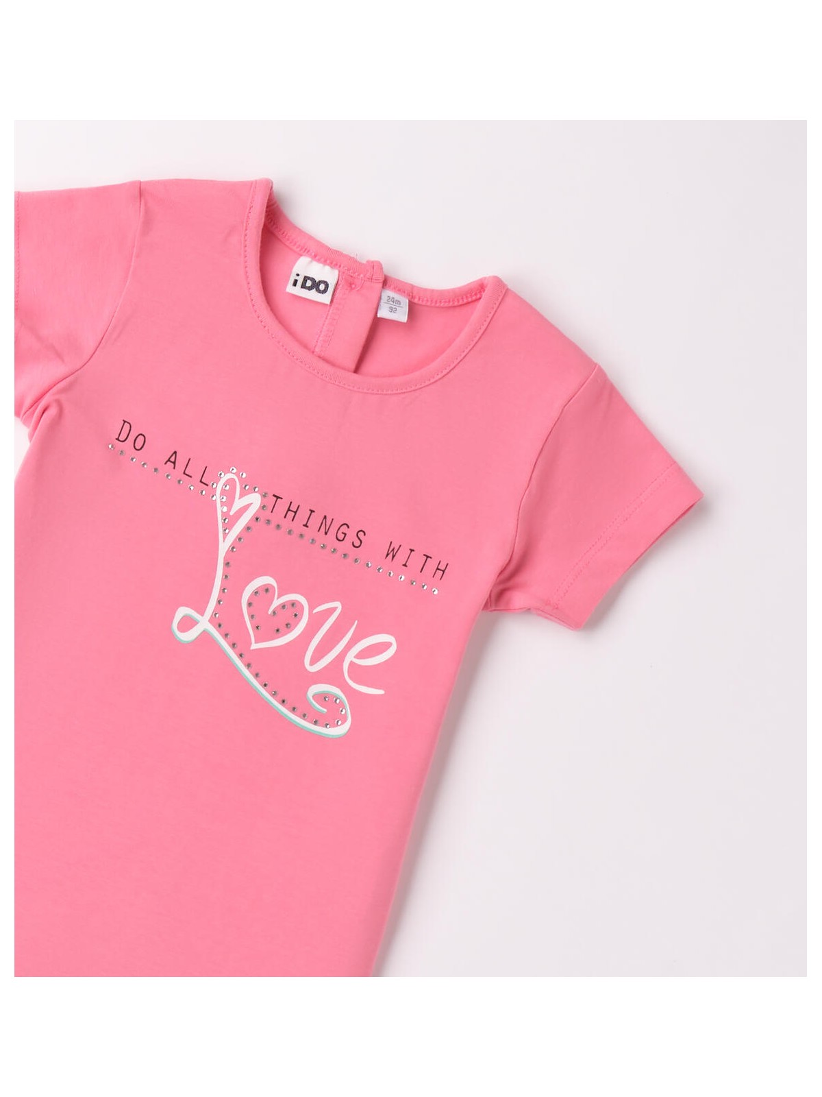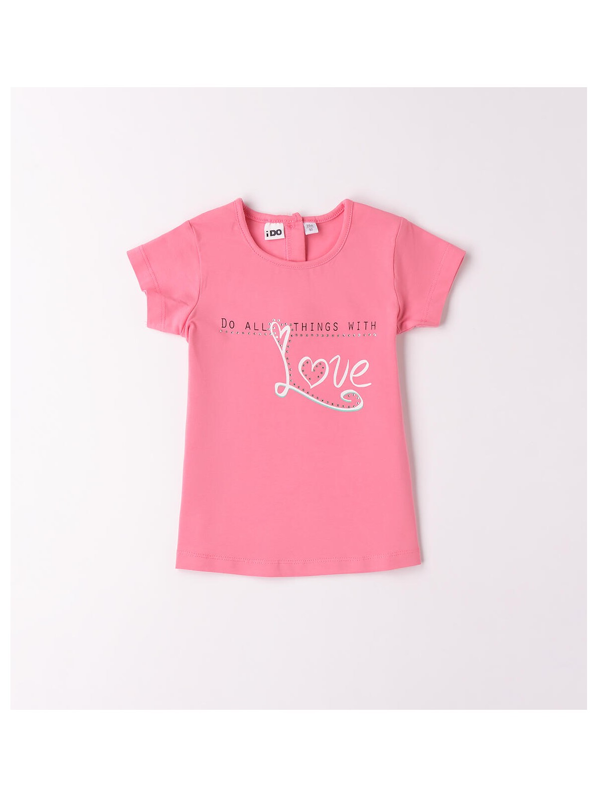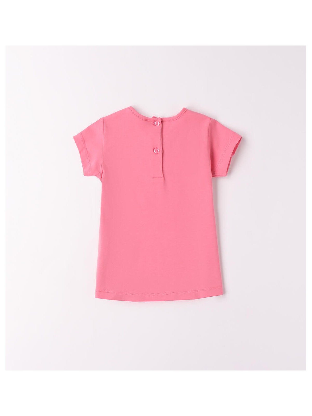 T-shirt per bambina iDO da 9 mesi a 8 anni realizzata in jersey stretch di cotone. Il modello presenta apertura sul retro con bottoni, fantasia tinta unita e stampa frontale con strass