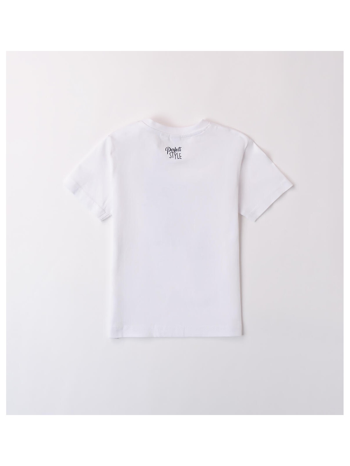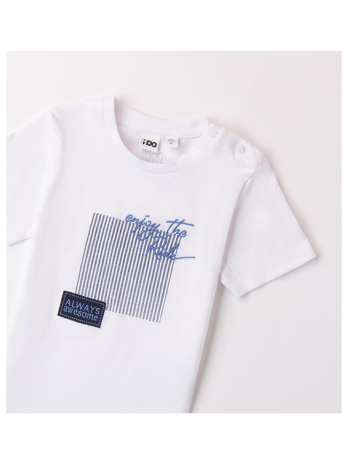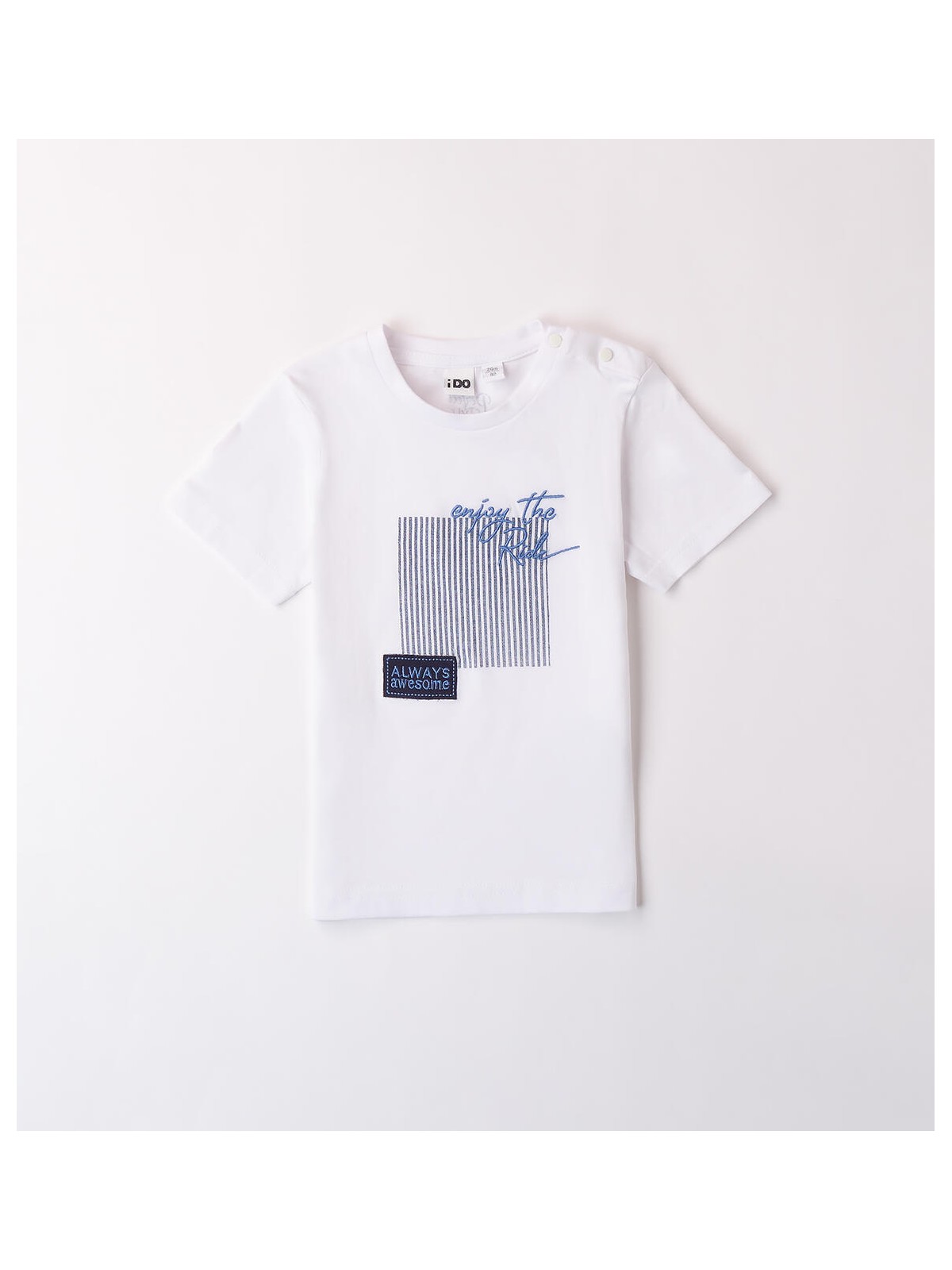 T-Shirt per bambino in jersey 100% cotone. Il modello presenta apertura sulla spalla con bottoni a pressione fino alla taglia 3 anni e fantasia tinta unita con applicazioni e ricami