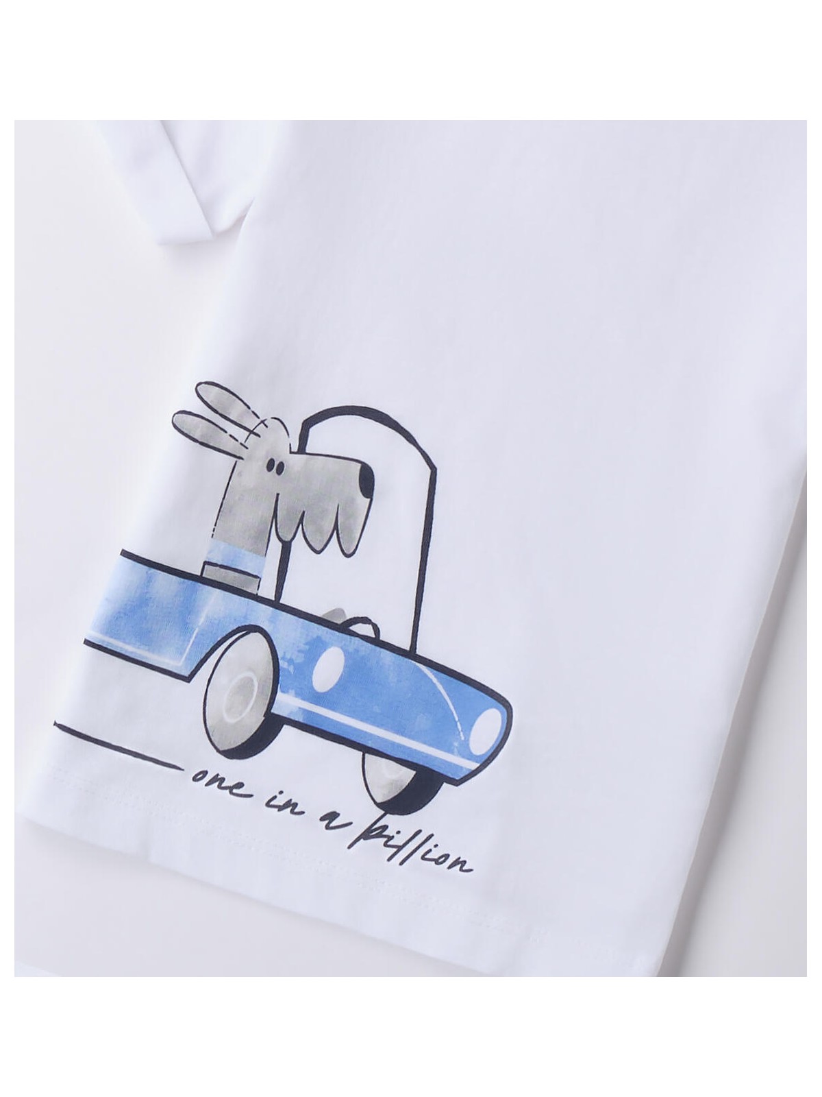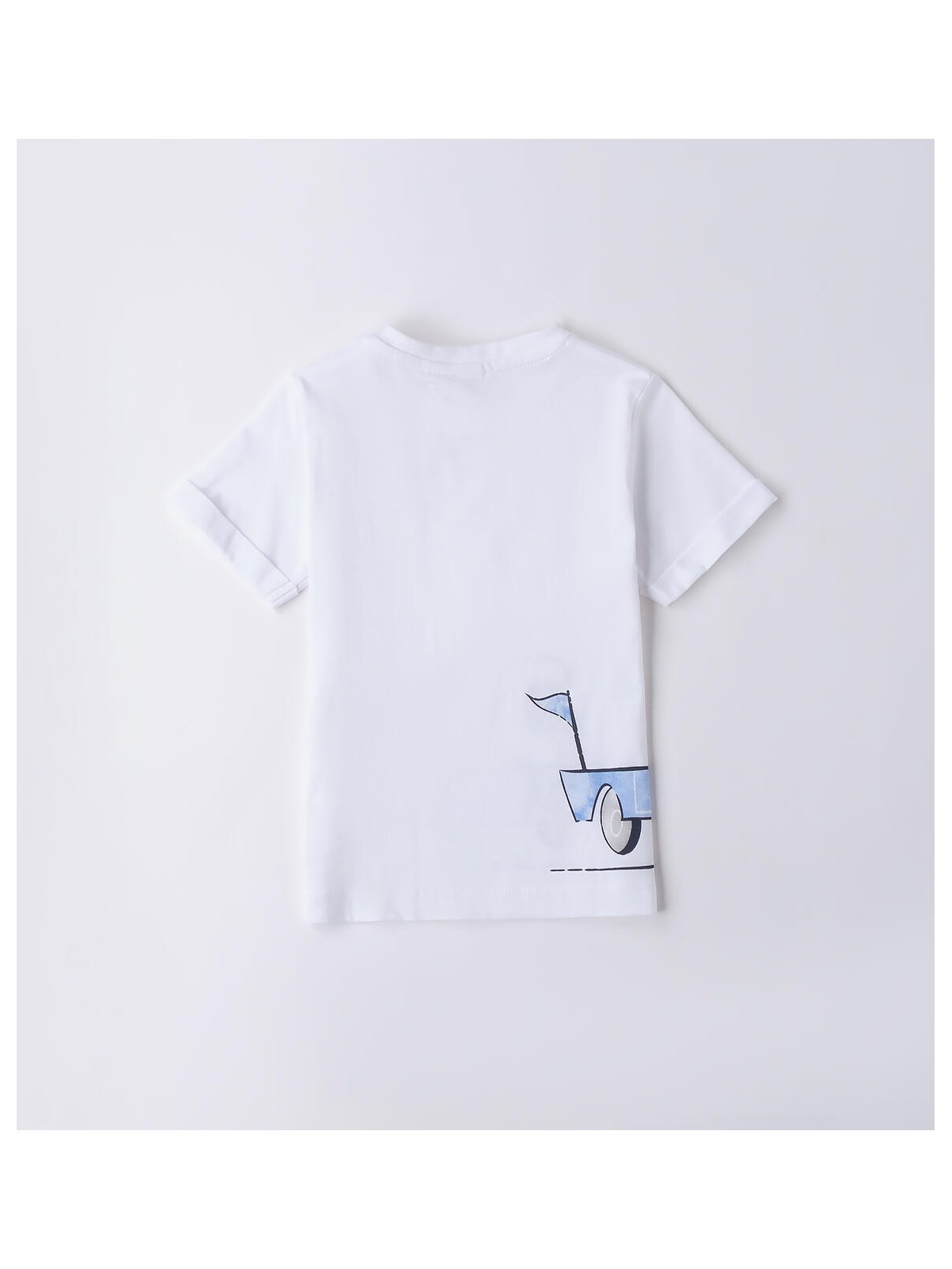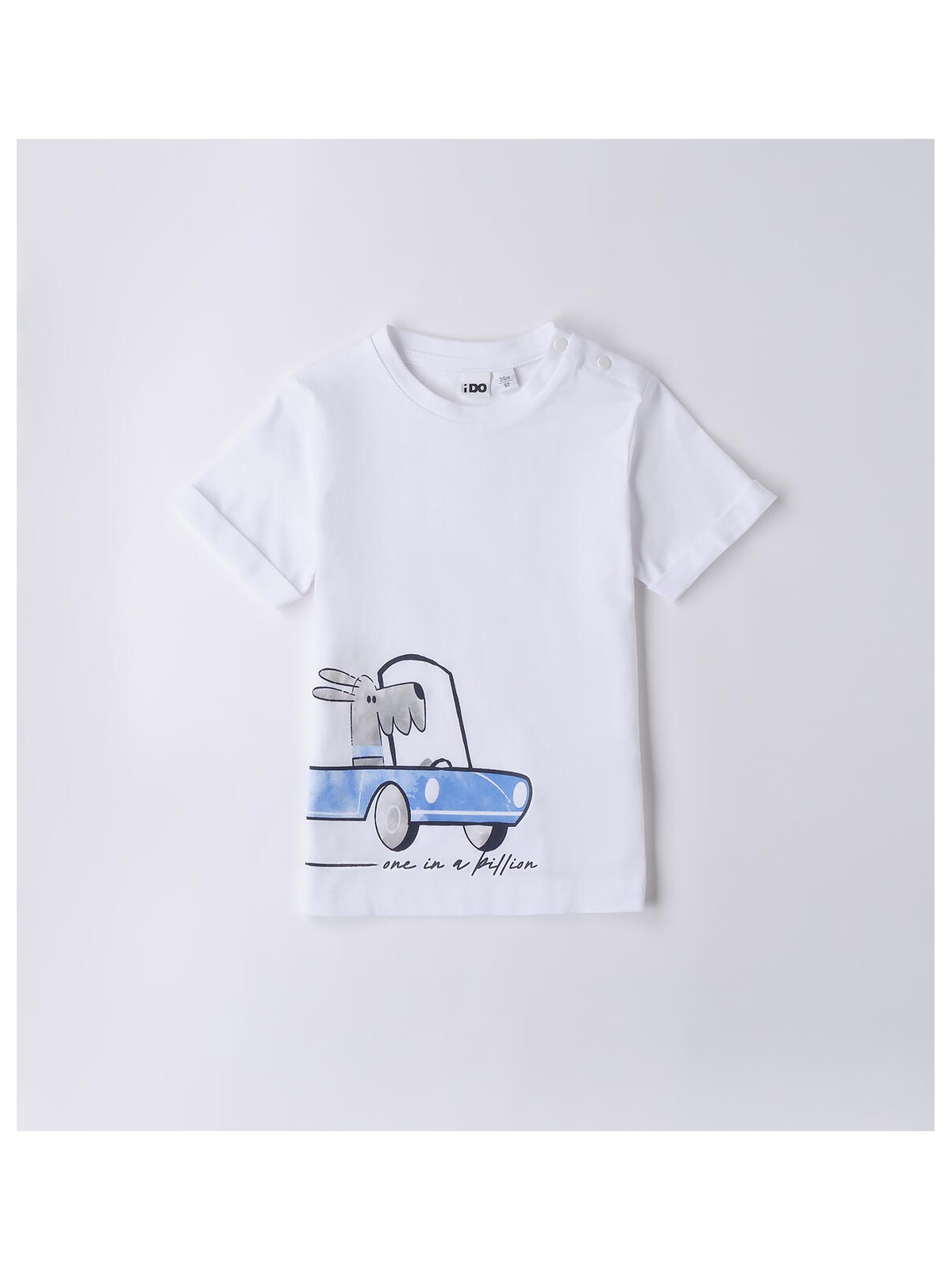 T-shirt per bambino in jersey 100% cotone. Il modello presenta apertura sulla spalla con bottoni a pressione fino alla taglia 3 anni, fantasia tinta unita con stampa frontale.