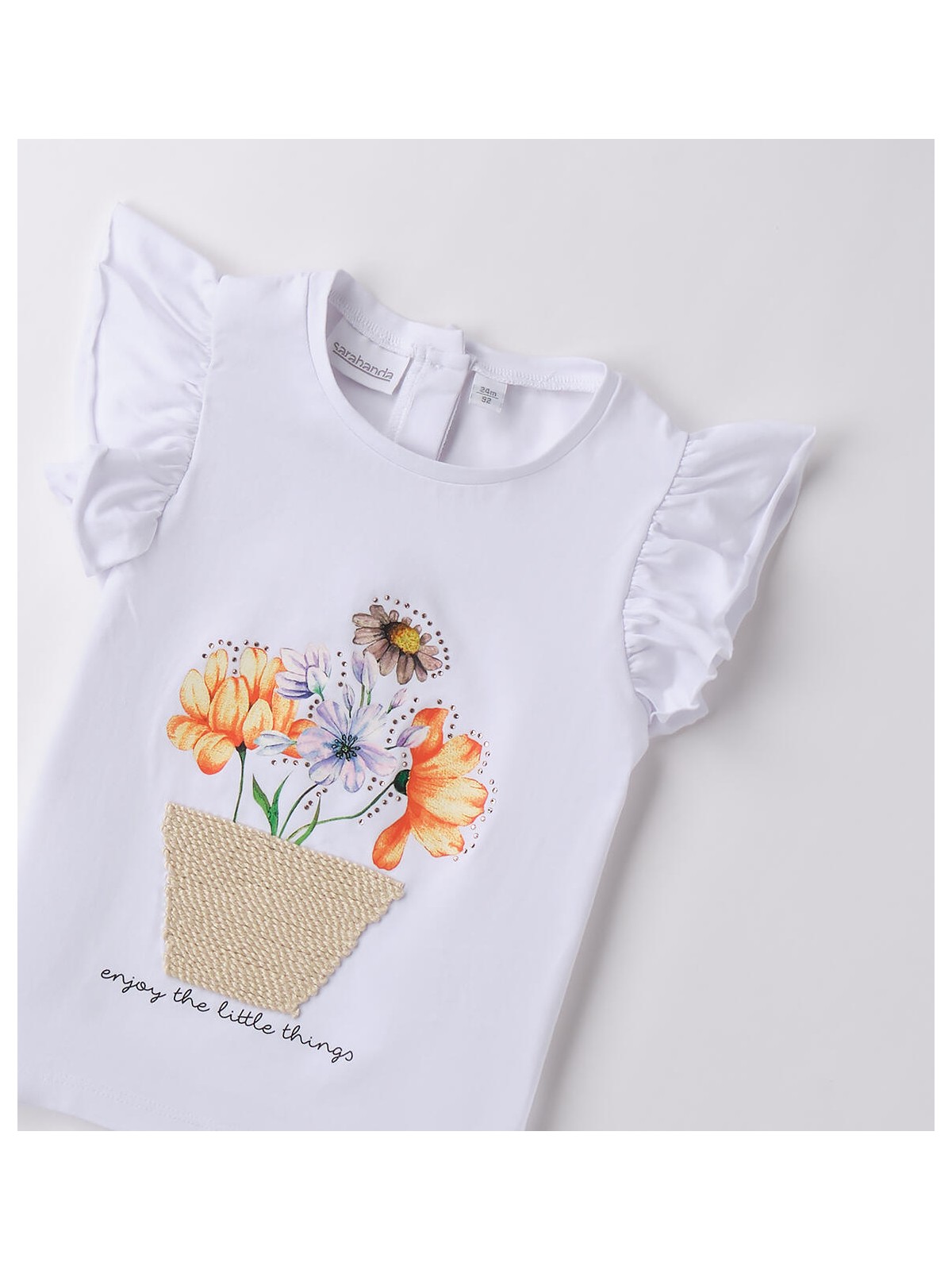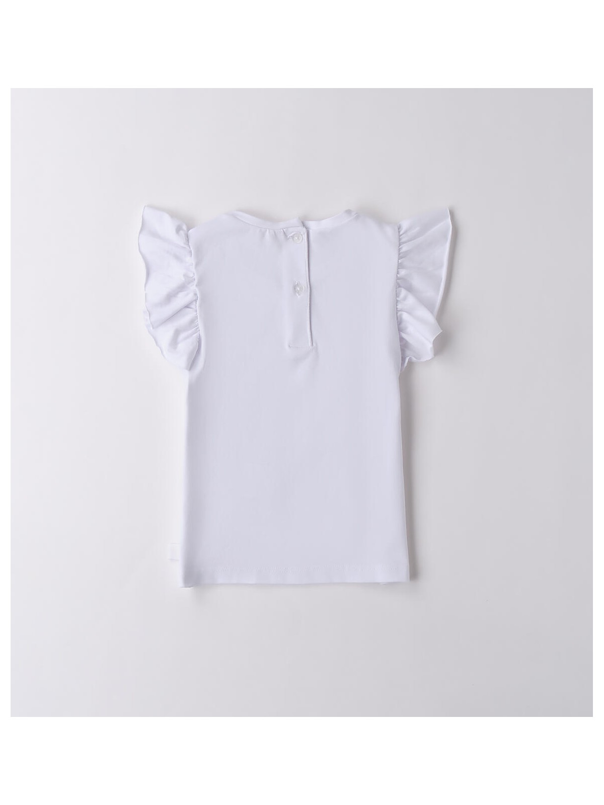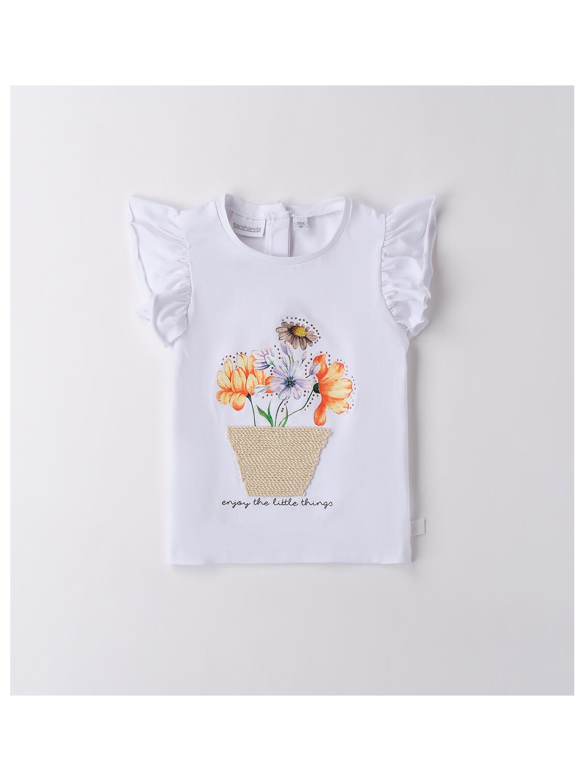 T-shirt Sarabanda per bambina da 9 mesi a 8 anni realizzata in jersey stretch di cotone. Il modello presenta apertura sul retro con bottoni, stampa frontale e ruches sulle maniche.