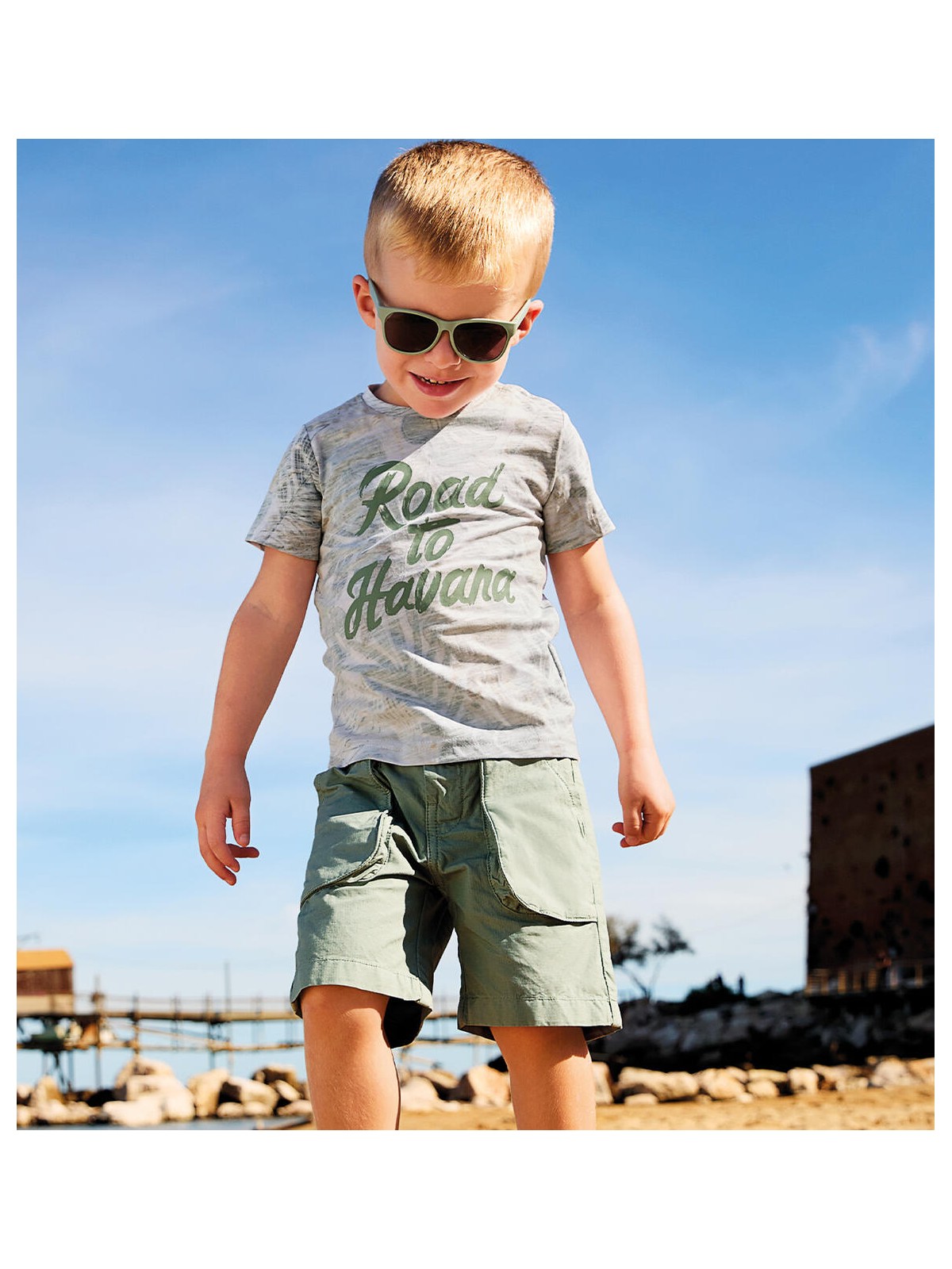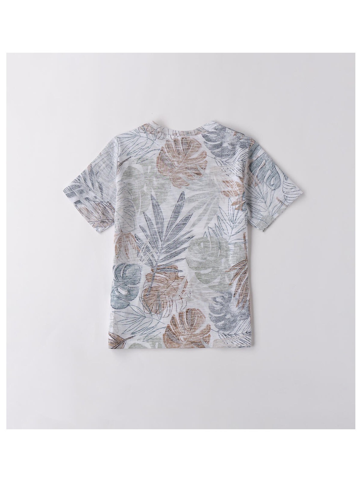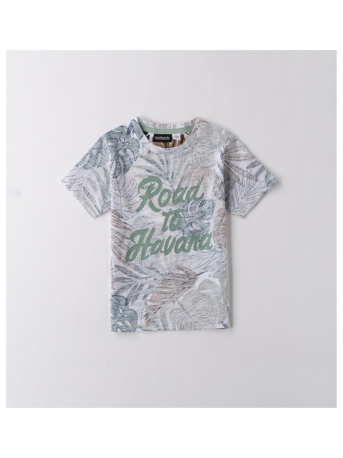 T-Shirt per bambino Sarabanda da 9 mesi a 8 anni in jersey 100% cotone. Il modello presenta apertura sulla spalla con bottoni a pressione fino alla taglia 3 anni per agevolare il cambio e la vestizione, fantasia allover e scritta frontale.