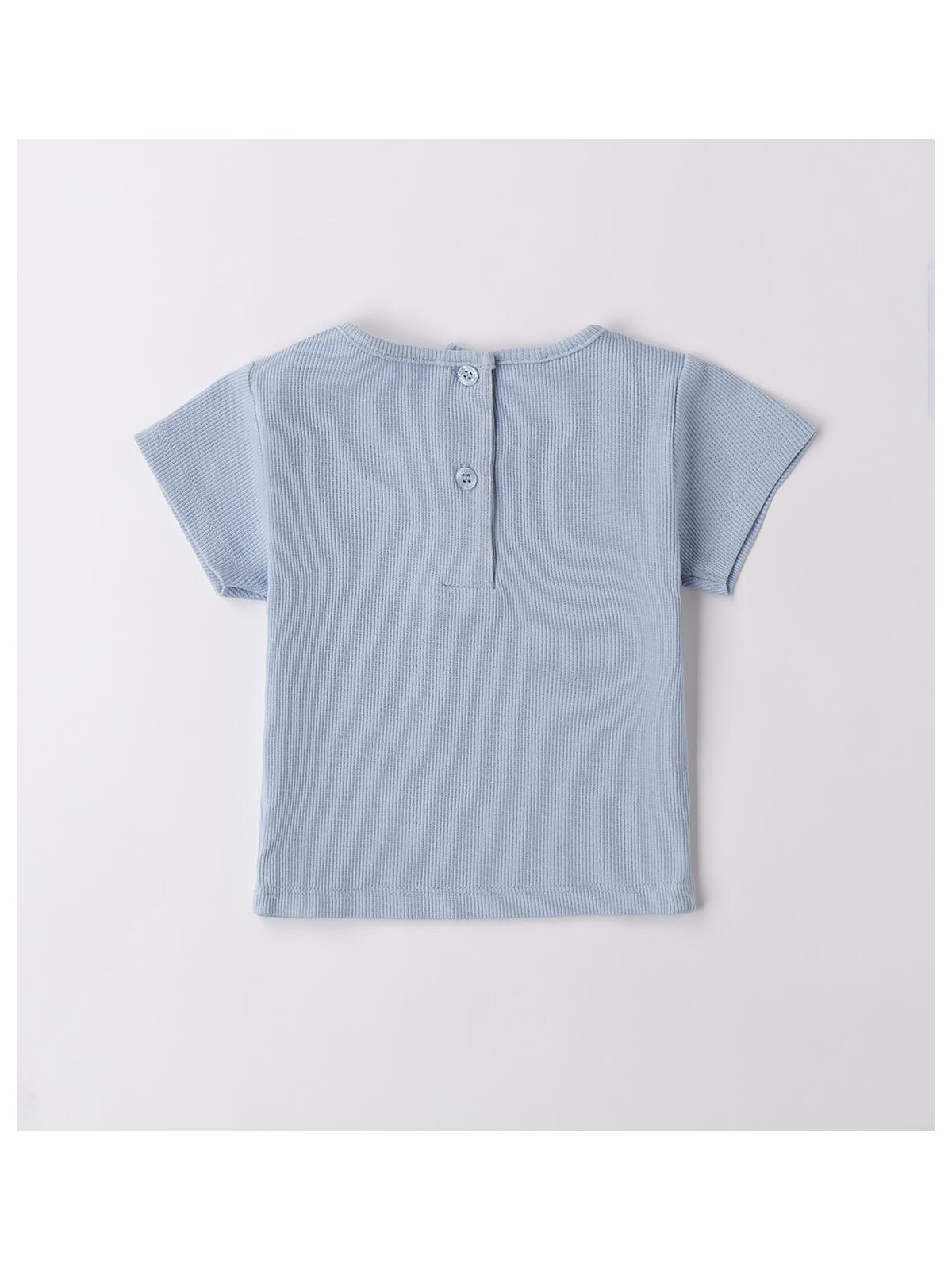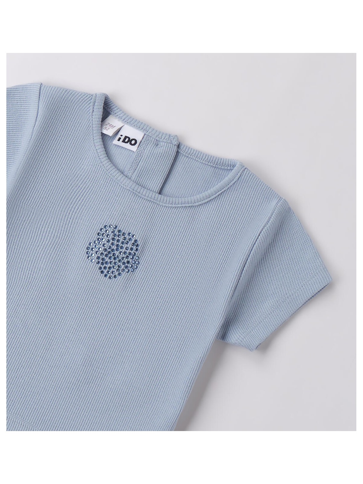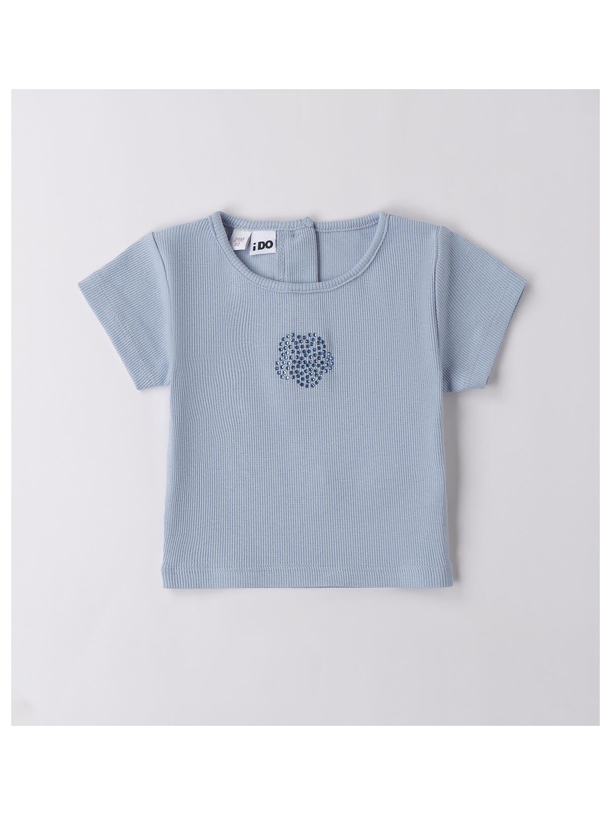 Maglietta per bambina iDO da 9 mesi a 8 anni realizzata in costina di cotone stretch. Il modello presenta apertura sul retro con bottoni, fantasia tinta unita e strass in applicazione.