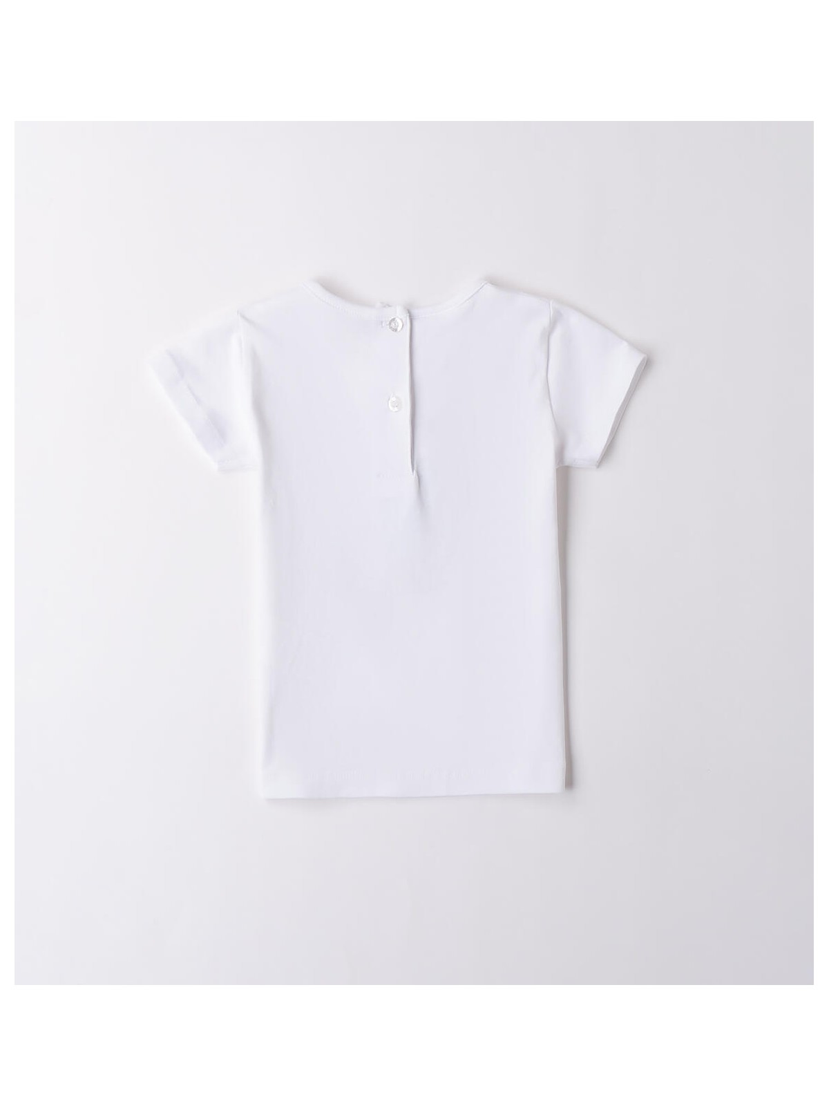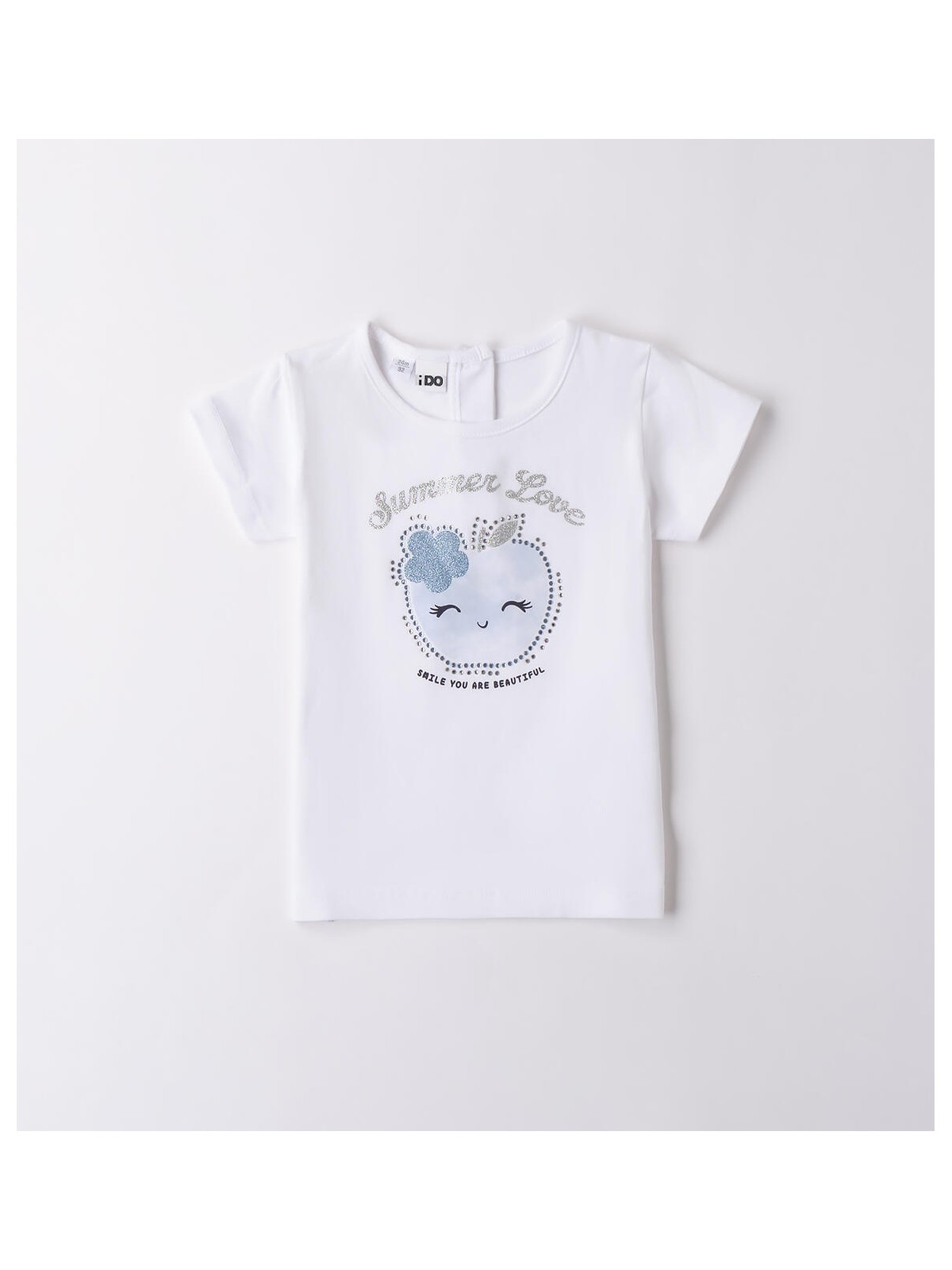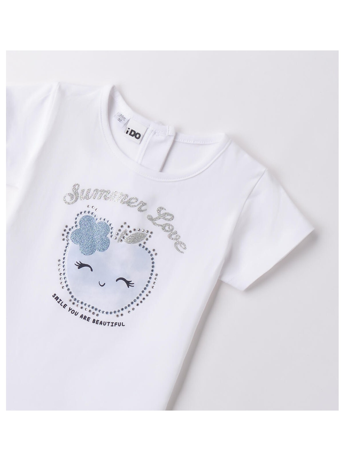 T-shirt per bambina iDO da 9 mesi a 8 anni realizzata in jersey stretch di cotone. Il modello presenta apertura sul retro con bottoni, fantasia tinta unita e stampa frontale con dettagli laminati, strass e glitter