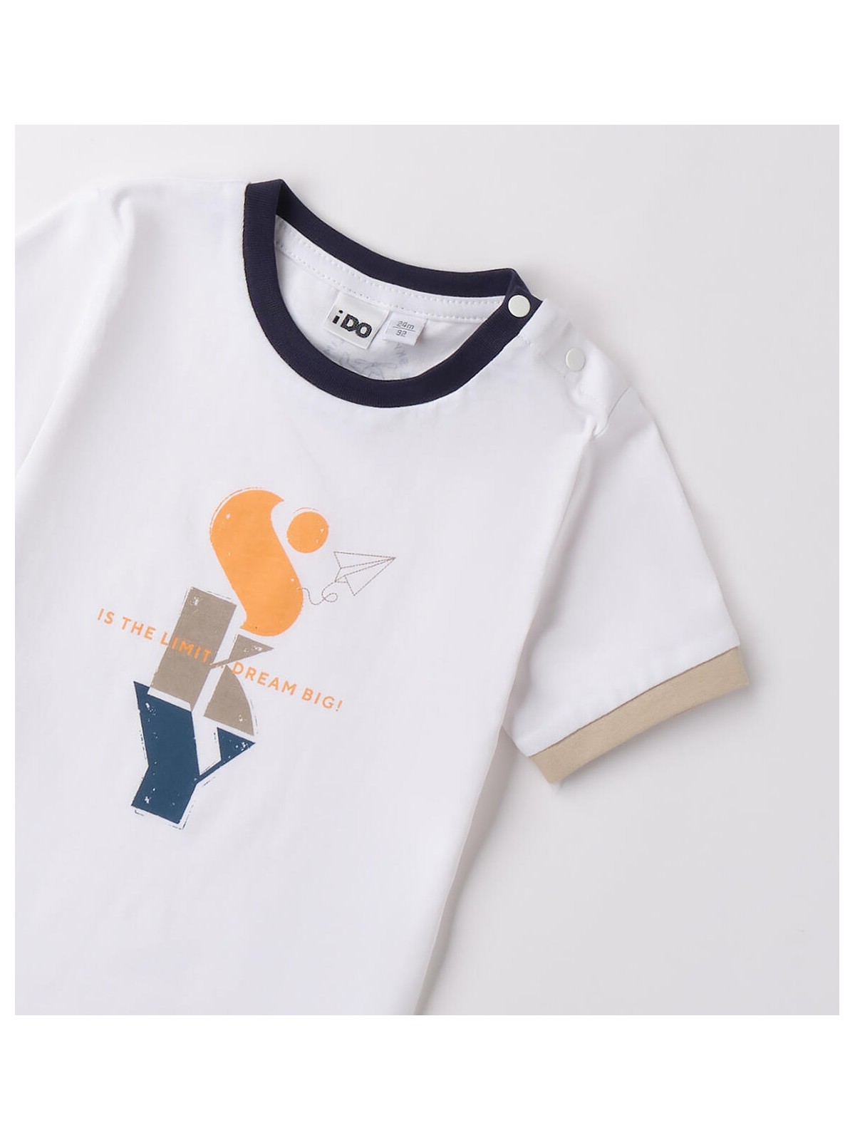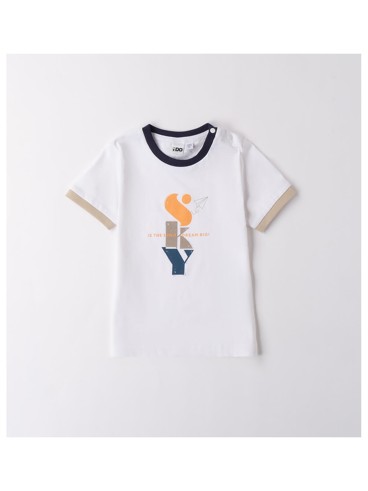 T-Shirt per bambino da 9 mesi a 8 anni in jersey 100% cotone. Il modello presenta apertura sulla spalla con bottoni a pressione fino alla taglia 3 anni per agevolare il cambio e la vestizione, stampa frontale.