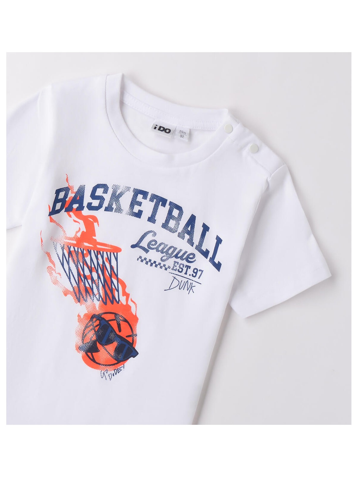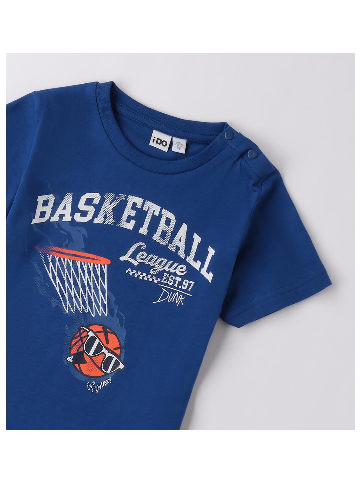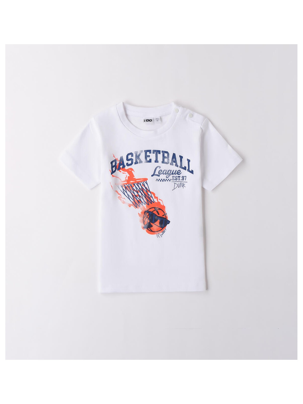 T-shirt per bambino iDO da 9 mesi a 8 anni realizzata in jersey 100% cotone. Il modello presenta apertura sulla spalla con bottoni a pressione fino alla taglia 3 anni per agevolare il cambio e la vestizione. La maglietta è in fantasia tinta unita con stampa basketball