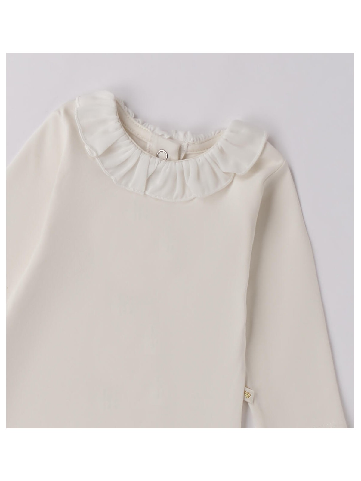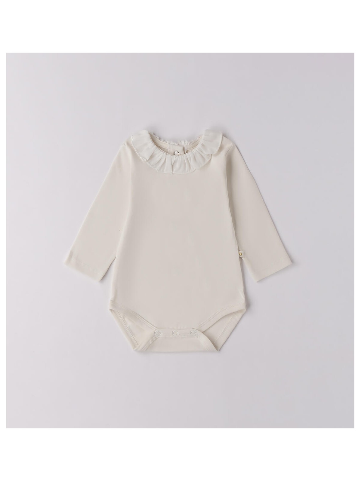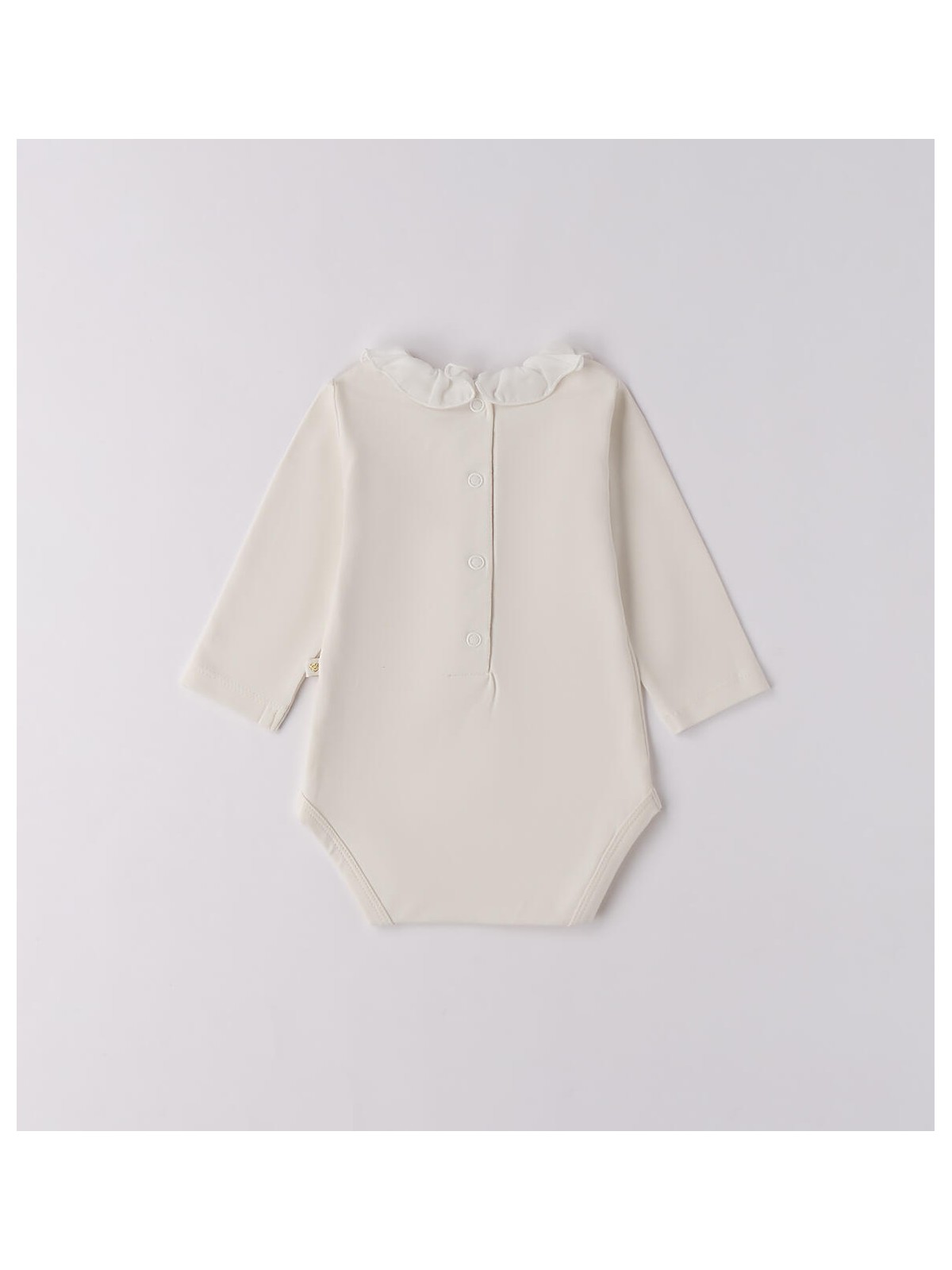 Body neonata in in jersey stretch di cotone. Il modello presenta apertura sul retro e nel sottogamba con bottoni a pressione per agevolare il cambio e la vestizione, ruches nel colletto.